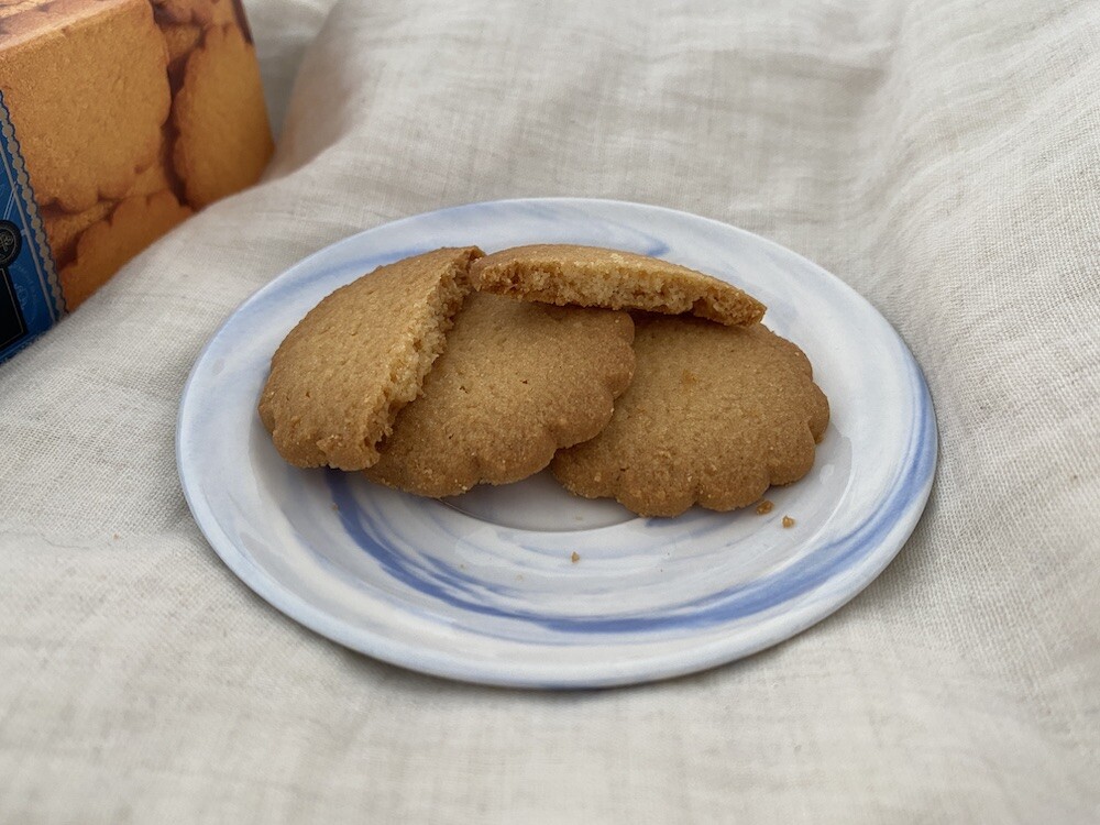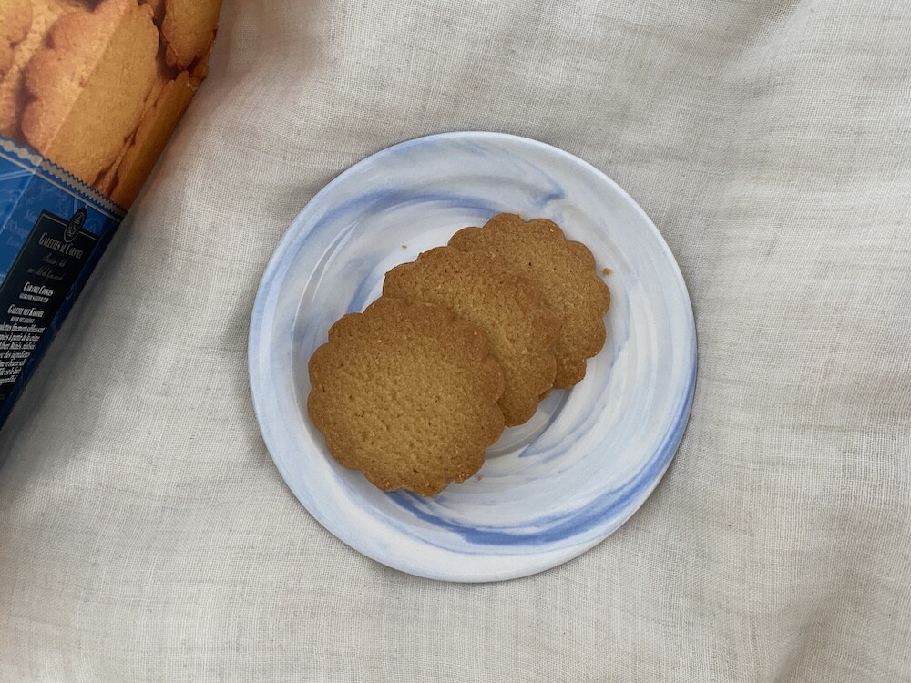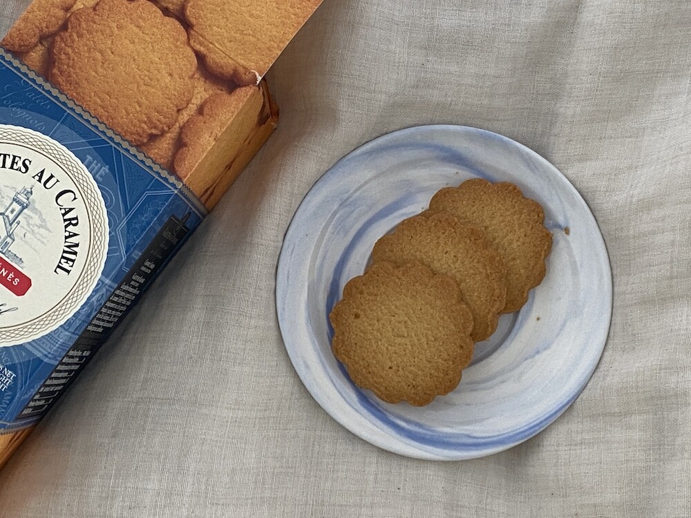 고급스러운 카라멜 걀레뜨를 소개해 드려요. 게랑드 소금 버터와 게랑드 소금 버터로 만든 카라멜 크림(솔티드 버터 카라멜 크림)이 함유된 비스킷으로, 식감은 바삭하고 풍미가 너무 좋아요. 크림이 따로 들은 게 아니라 쿠키 반죽에 함유되어 있는 건데 버터의 풍부한 맛과 살짝 더해지는 짭짤한 맛이 정말 맛있어요. 식감은 로투스 쿠키와 비슷한데요. 그래서인지 커피에 찍어 먹으면 더 맛있게 느껴지는 것 같아요.