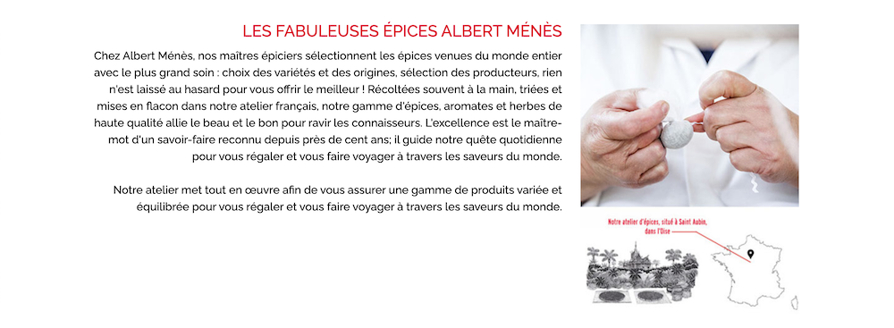 알베흐 메네스(ALBERT MÉNÈS)는 프랑스의 향신료 브랜드로, 싸지는 않지만 퀄리티가 좋아서 마트 뿐 아니라 백화점에서도 판매되고 있어요. 다양한 요리용 향신료 뿐 아니라 잼같은 가공품들도 품질이 좋고 맛있어서 저도 얼마전부터 이 브랜드 제품을 하나둘씩 모으고 있답니다.