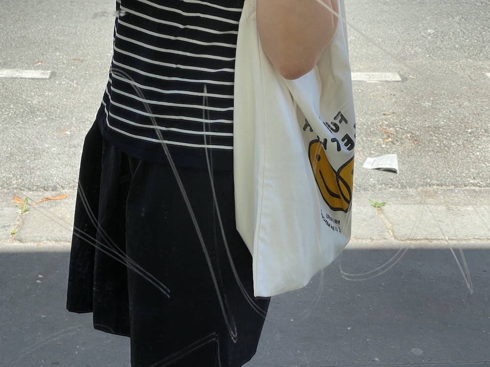 데님처럼 짠 튼튼한 면소재에 스마일 프린트가 귀여운 에코백으로, 한정판이라 희소성까지 있어 구매해 놓으시면 후회 안하실 것 같아요. 끈이 한줄이라 어깨에 메기에도, 크로스로 사용하시기에도 예쁜데, 전 끈 길이가 길다고 느껴져서 질끈 묶어 사용해요. 입구 부분에 똑딱이가 있어서 안쪽의 내용물이 보이지 않는 것도 참 좋네요.