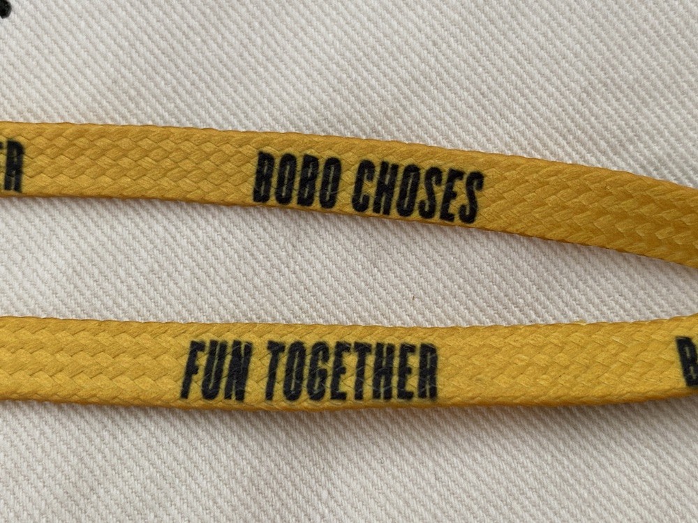 노란색의 신발끈에 보보쇼즈(BOBO CHOSES)와 펀 투게더(FUN TOGETHER)라는 글씨가 번갈아 프린트되어 있는 끈으로, 심심한 신발에 귀여운 포인트가 되어줄 거예요. 신발끈으로 뿐만 아니라 질끈 묶어 열쇠 고리나 무언가를 묶어 두는 용도로 사용하셔도 좋을 것 같아요.
