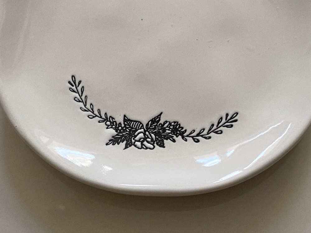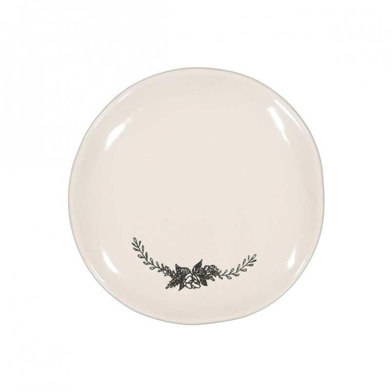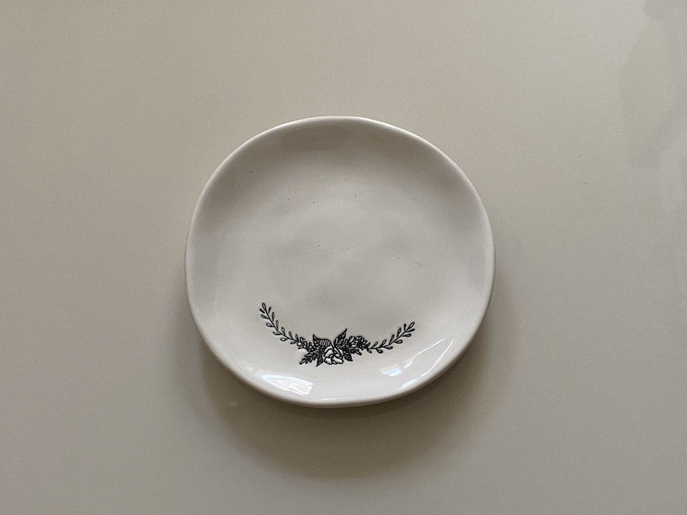 손으로 눌러 만든 것 같은 자연스러운 모양에 화관 모양이 음각으로 새겨져 있는 귀여운 접시로, 간식이나 작은 음식들을 담아놓으면 너무 예뻐요. 여기저기 사용하시기 좋을 거예요.