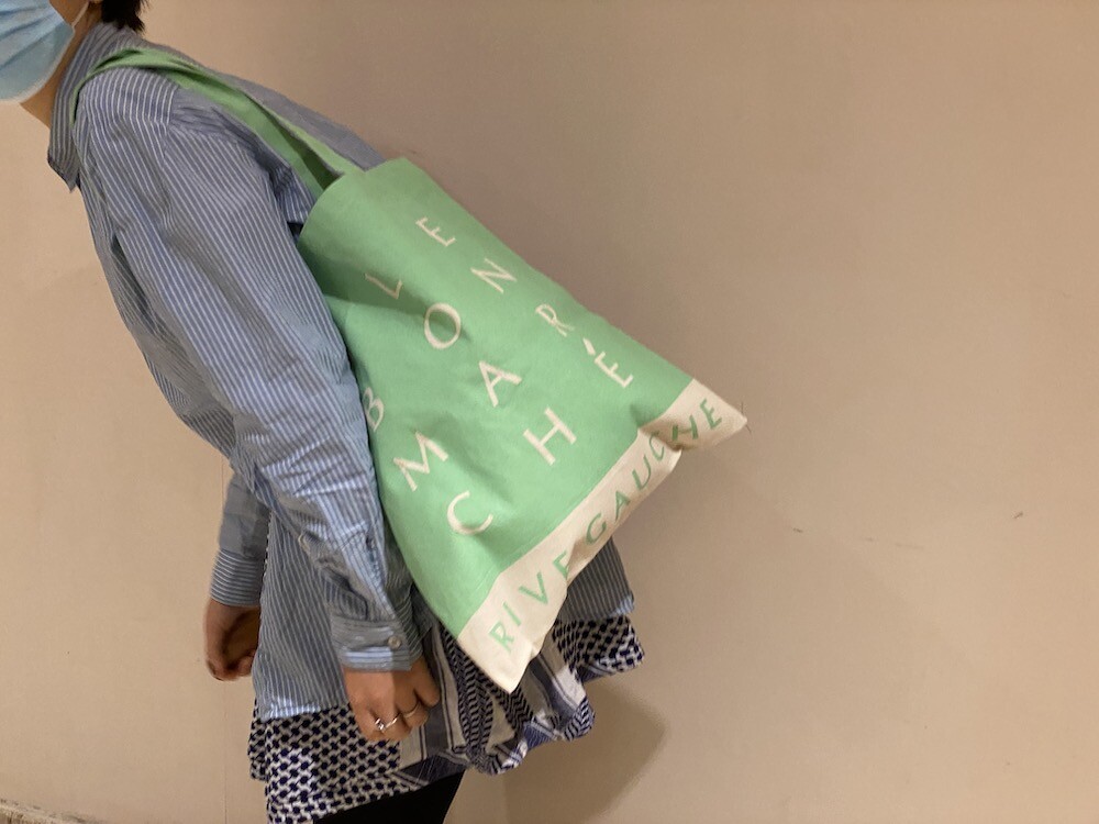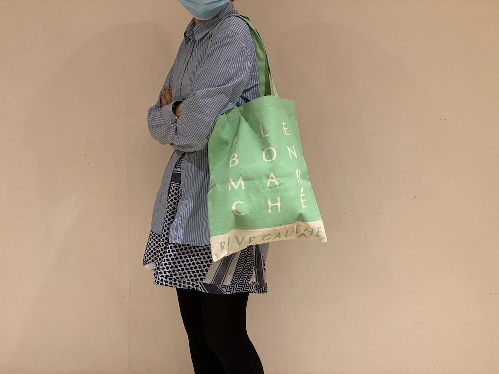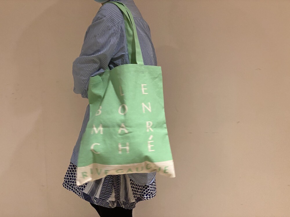 이 가방은 우선 색깔이 너무 예뻐요. 딱 보자마자 "와! 이건 하나 꼭 갖고 싶다!"라는 생각이 들었어요. 튼튼한 오가니 코튼에 박음질도 튼튼하게 잘 되어있어 실용성있게 사용하실 수 있고, LE BON MARCHÉ RIVE GAUCHE라는 글씨가 큼지막하게 써져 있어서 포인트 주기에도 좋은 아이템이에요.