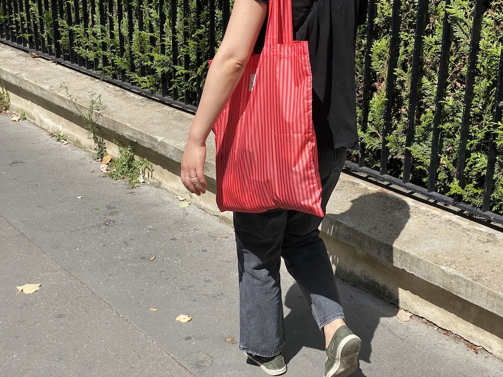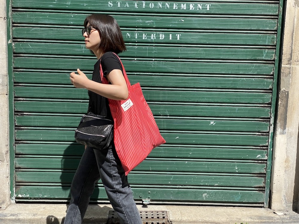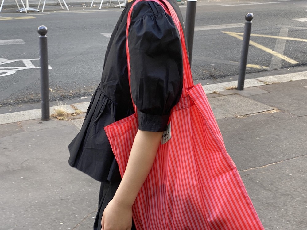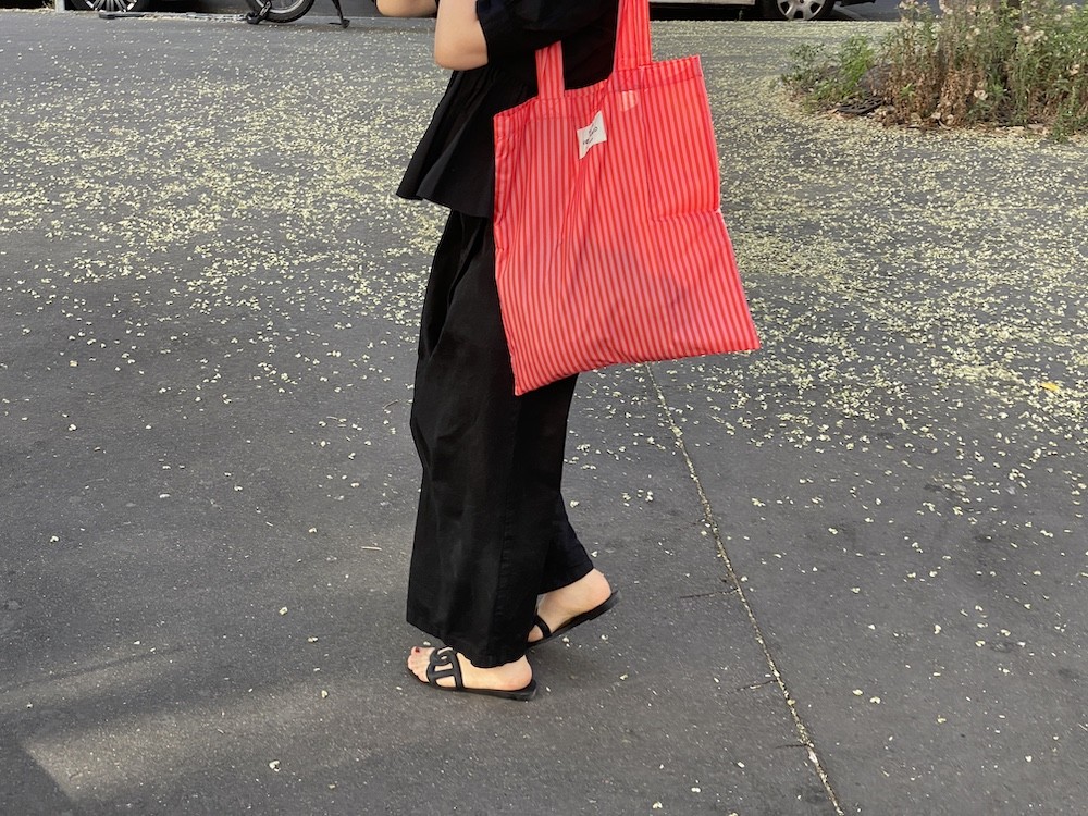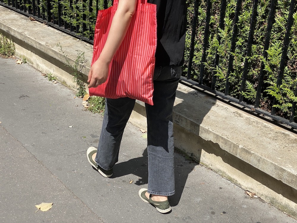 이 가방은 줄무늬 패턴 위에 브랜드명이 적힌 라벨을 박음질하여 지루함이 없고 사이즈가 넉넉해서 실용성도 있어요. 특히 이 에코백은 재생 폴리에스테르로 만든 가방이라, 지구의 쓰레기를 줄이는 데에도 한 몫을 하는 착한 가방이에요. 폴리에스테르 특유의 매끈한 소재감이 느껴지는데 그게 빨강+분홍 줄무늬와 너무 잘 어울려요.
