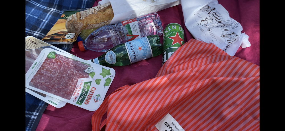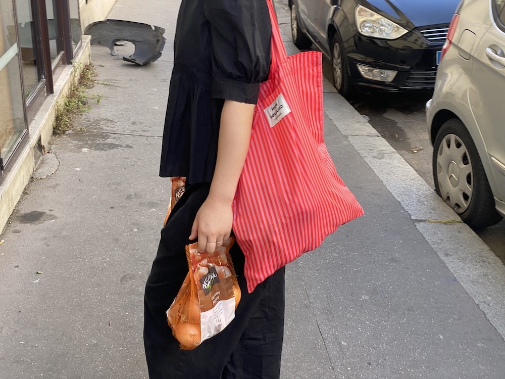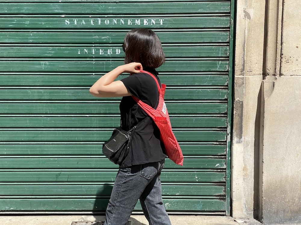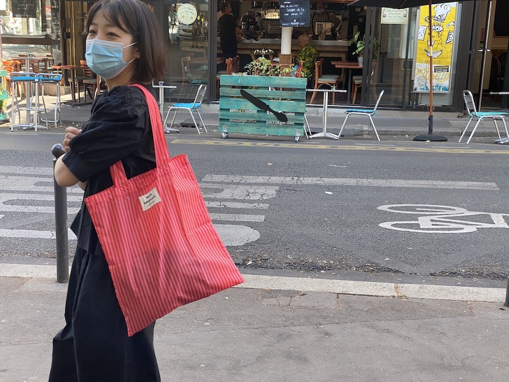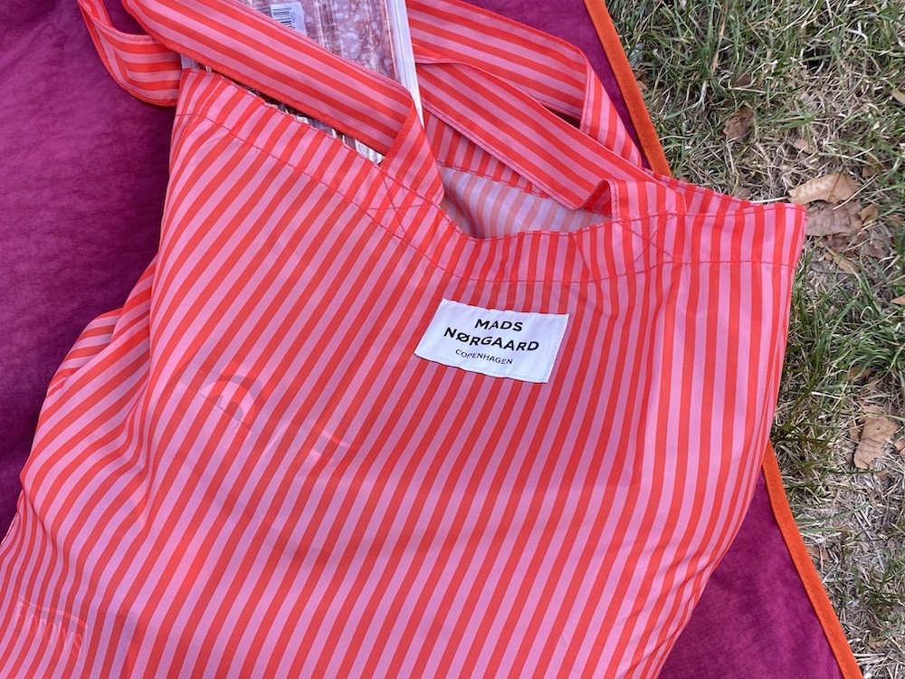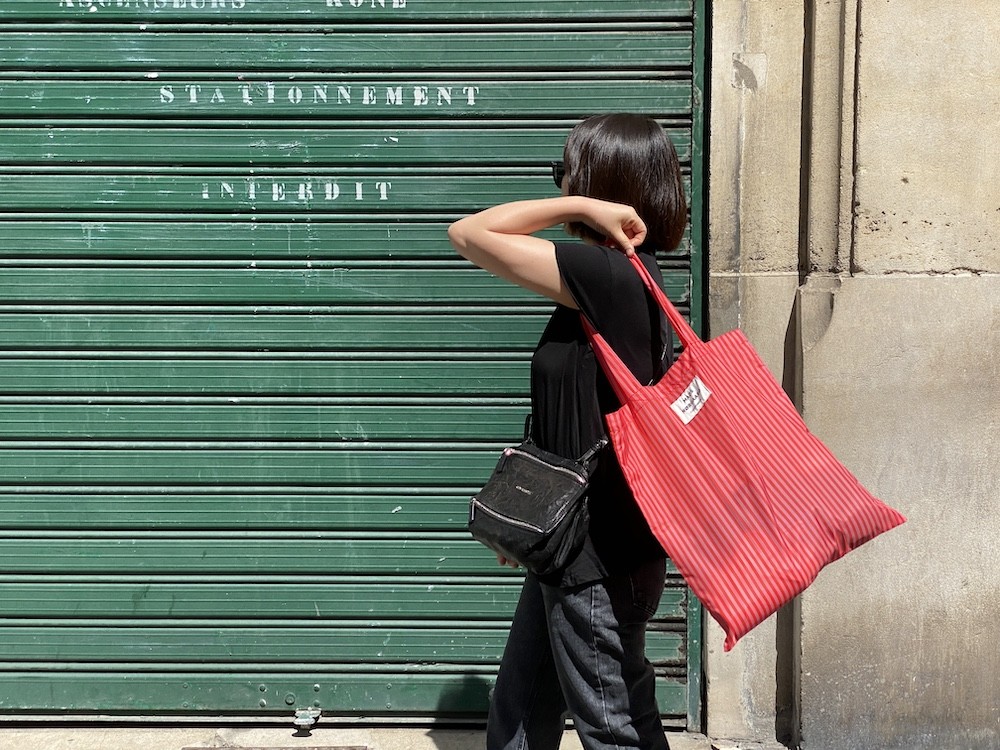 이 가방은 줄무늬 패턴 위에 브랜드명이 적힌 라벨을 박음질하여 지루함이 없고 사이즈가 넉넉해서 실용성도 있어요. 특히 이 에코백은 재생 폴리에스테르로 만든 가방이라, 지구의 쓰레기를 줄이는 데에도 한 몫을 하는 착한 가방이에요. 폴리에스테르 특유의 매끈한 소재감이 느껴지는데 그게 빨강+분홍 줄무늬와 너무 잘 어울려요.