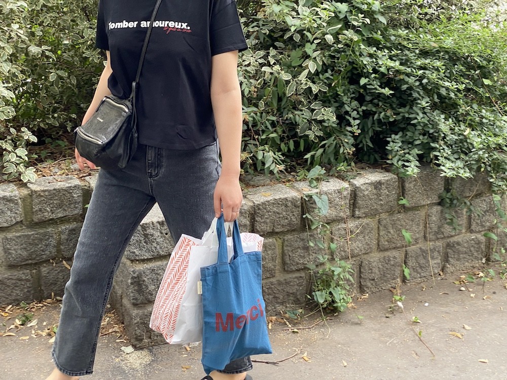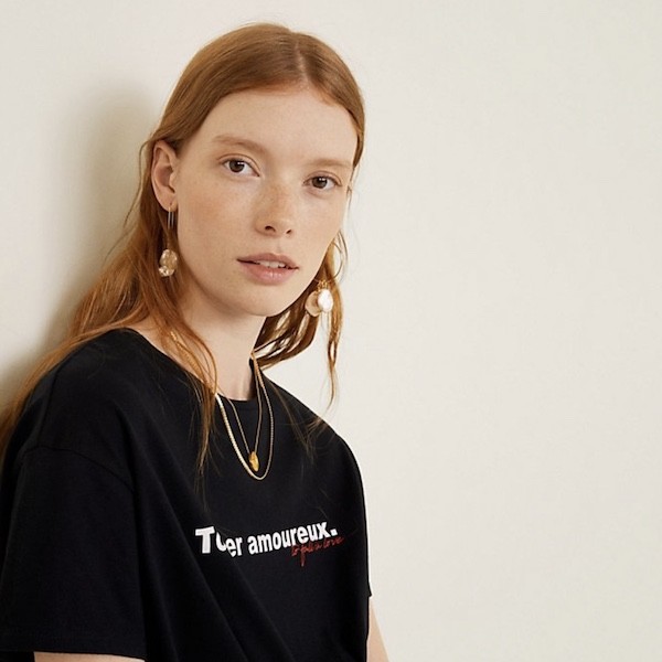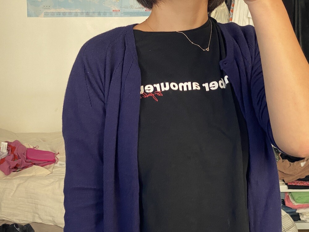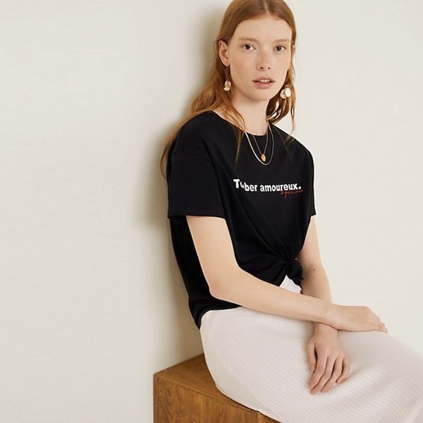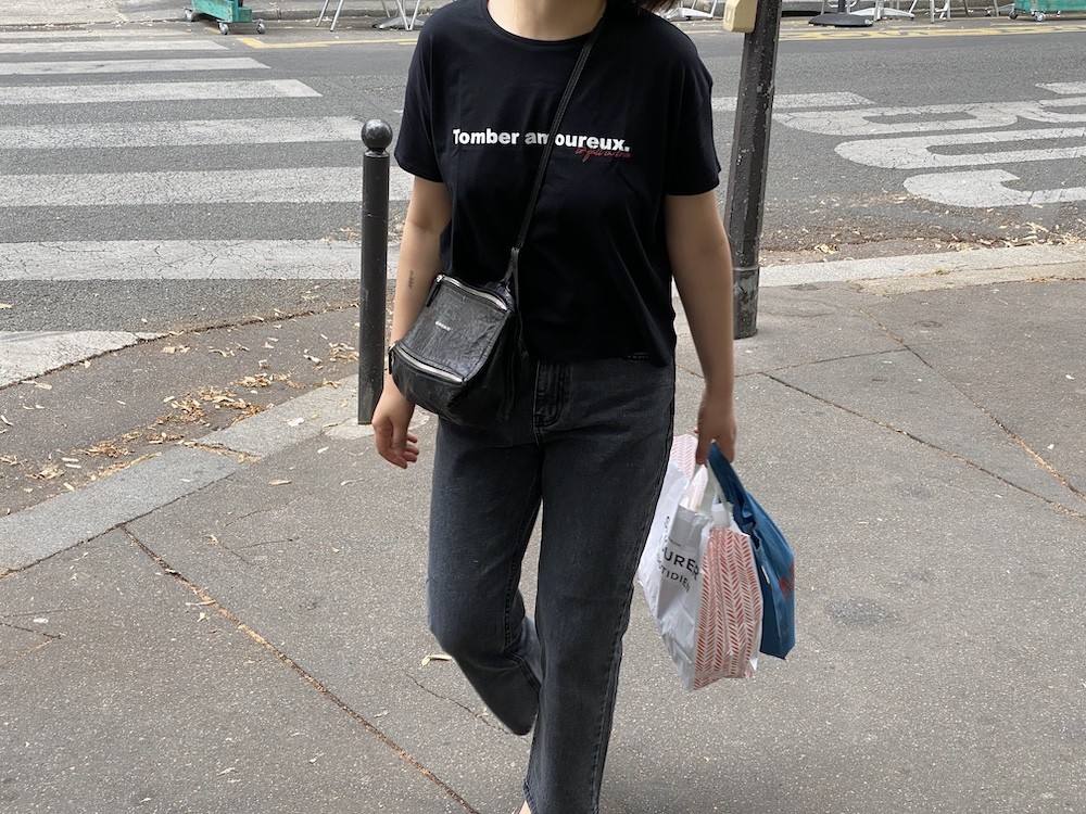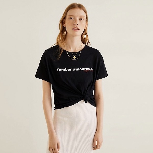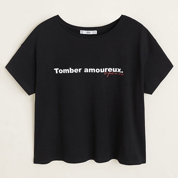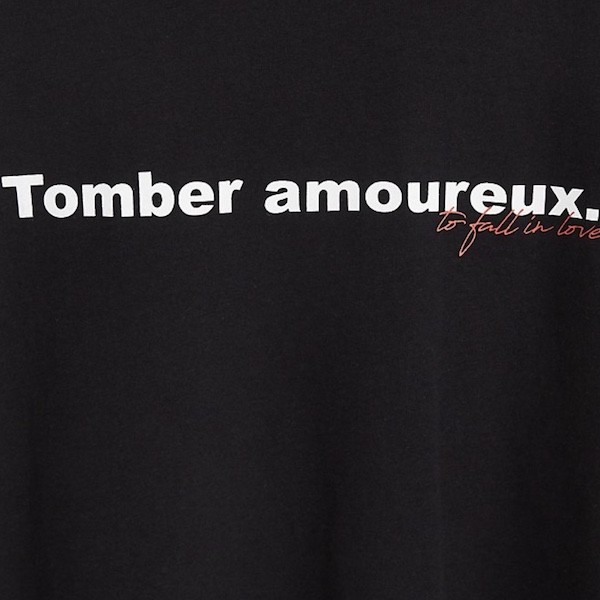 티셔츠에 씌여진 "Tomber amoureux"는 "사랑에 빠지다"라는 뜻이에요. '그녀에게 첫눈에 반했어!', '그녀와 사랑에 빠졌지!' 같은 말을 할 때 많이 사용하는 숙어같은 표현이에요.