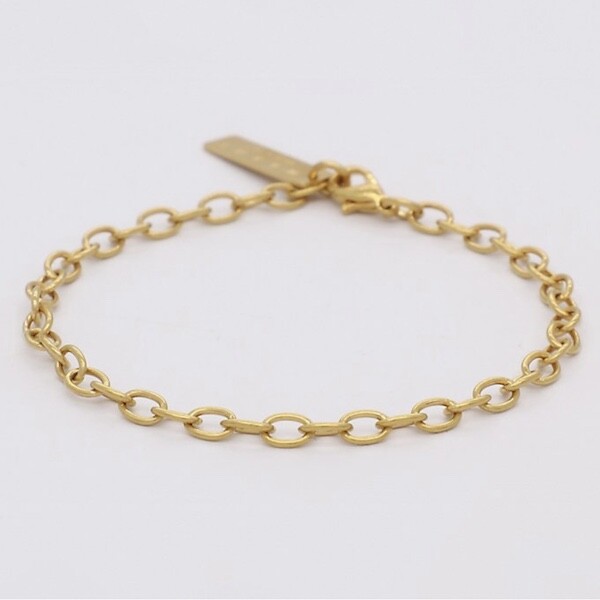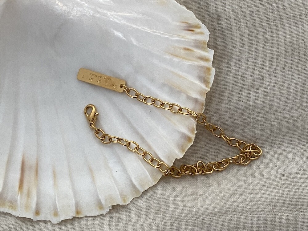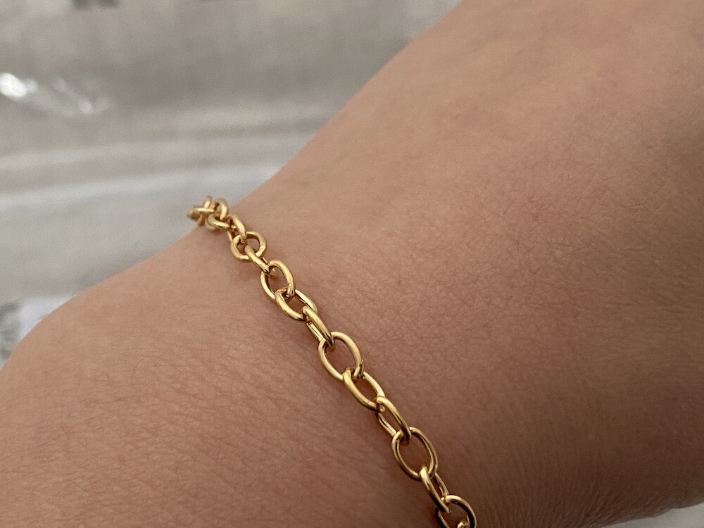 이 체인은 참을 골라 자신만의 팔찌를 만들 수 있도록 나온 제품이에요(참은 따로 판매합니다). 어떤 참을 다느냐에 따라 원하는 느낌을 만들 수 있어 좋더라고요. 체인이 심플해서 여기저기 매치하기 좋고, 번쩍번쩍한 금이 아니라 빈티지한 느낌까지 낼 수 있어서 좋아요.