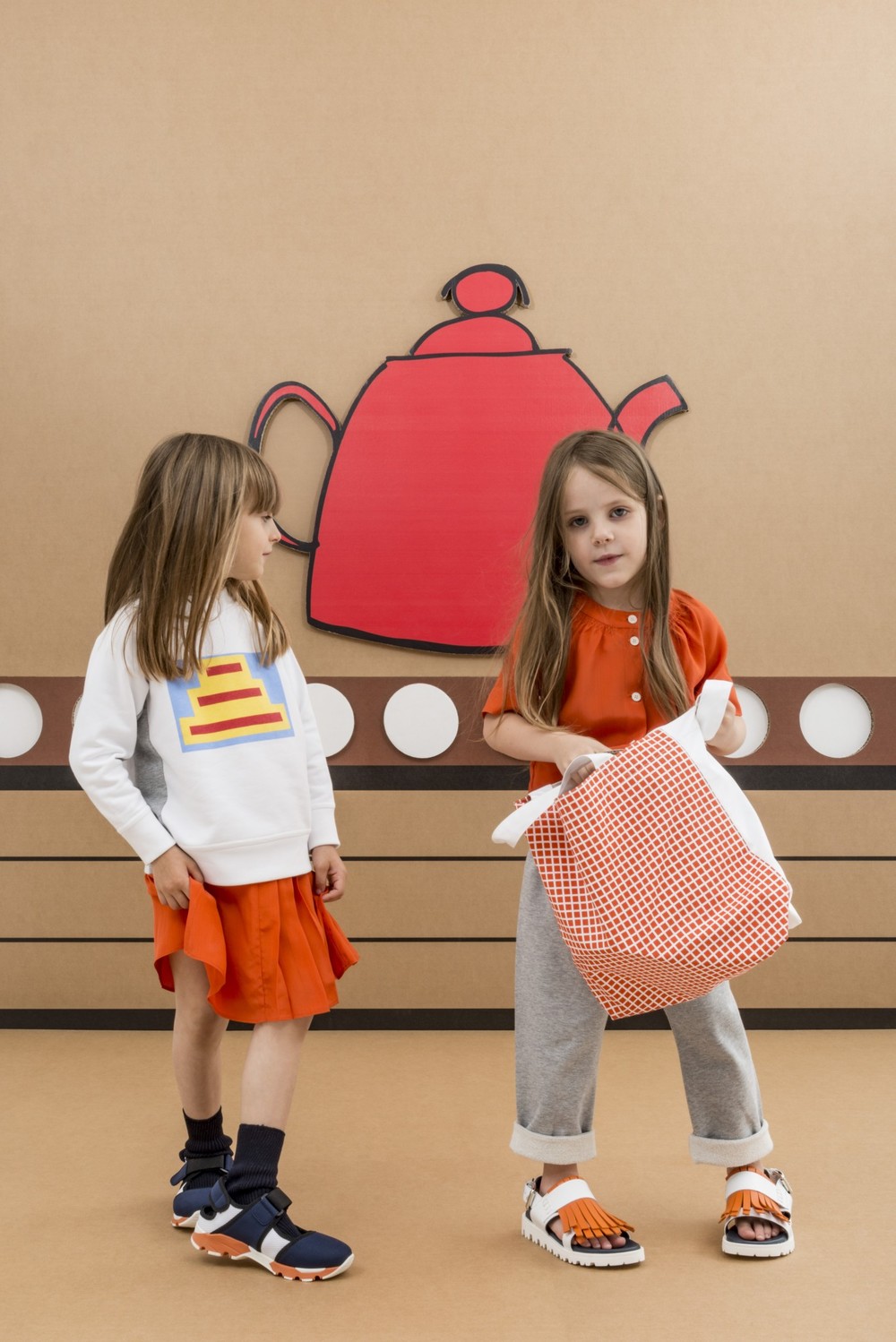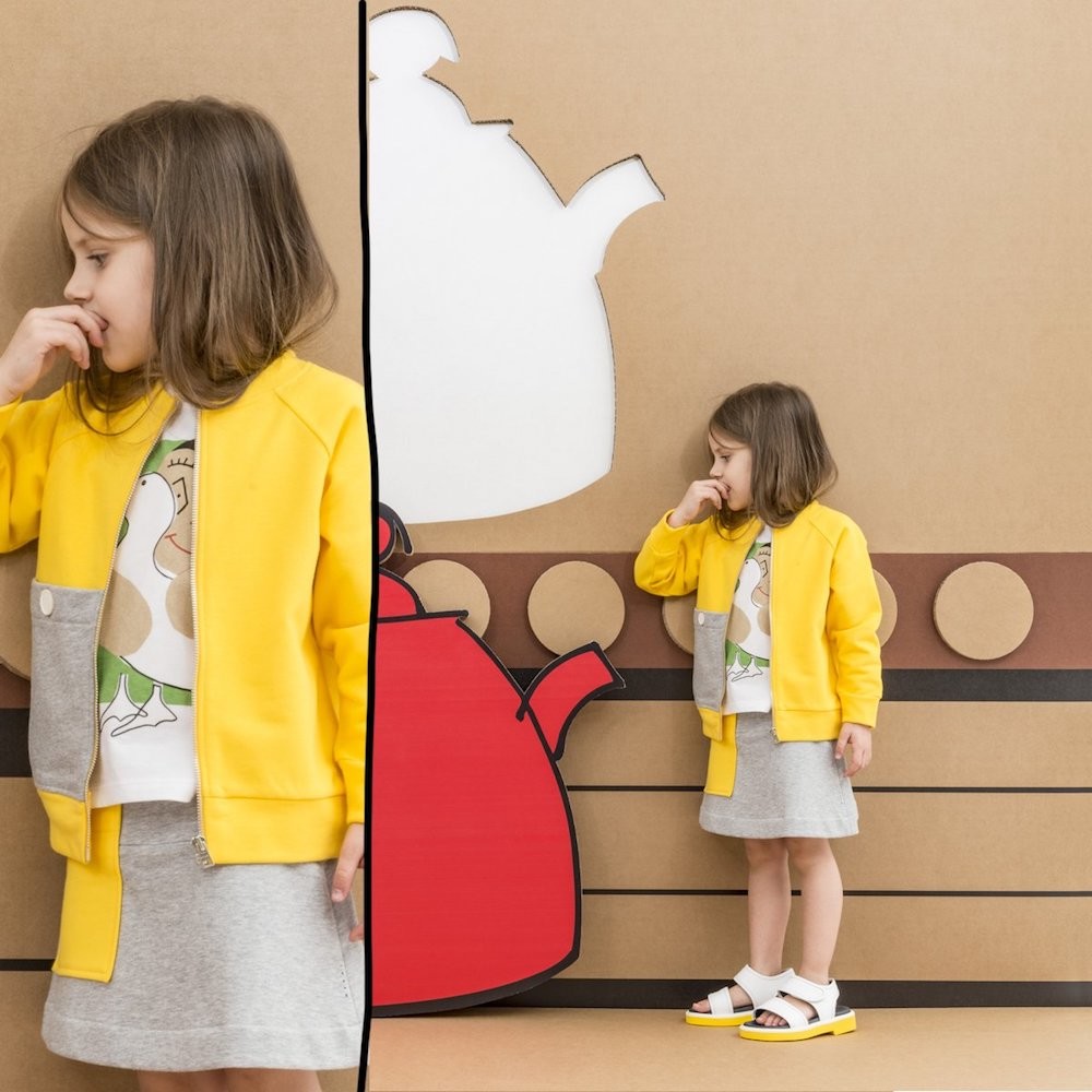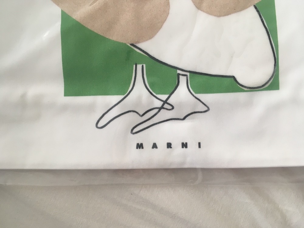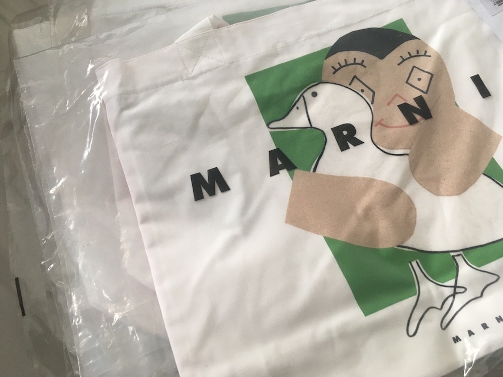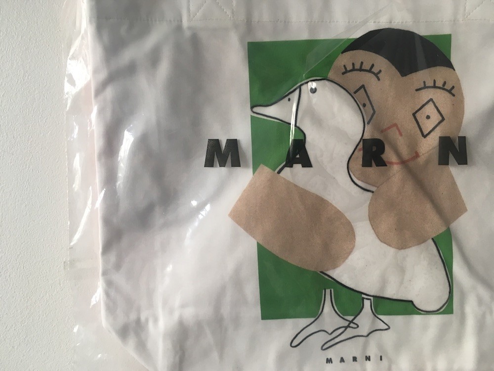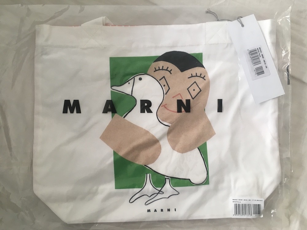 마르니 키즈의 에코백 중 오리를 안고있는 아이 그림이 그려진 가방입니다.