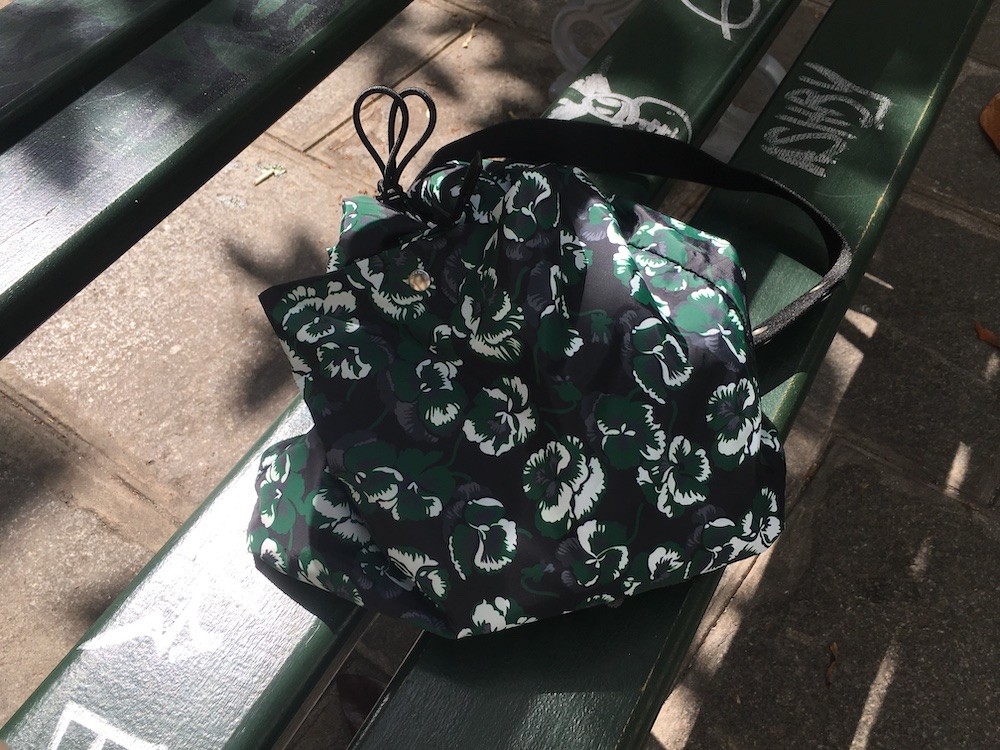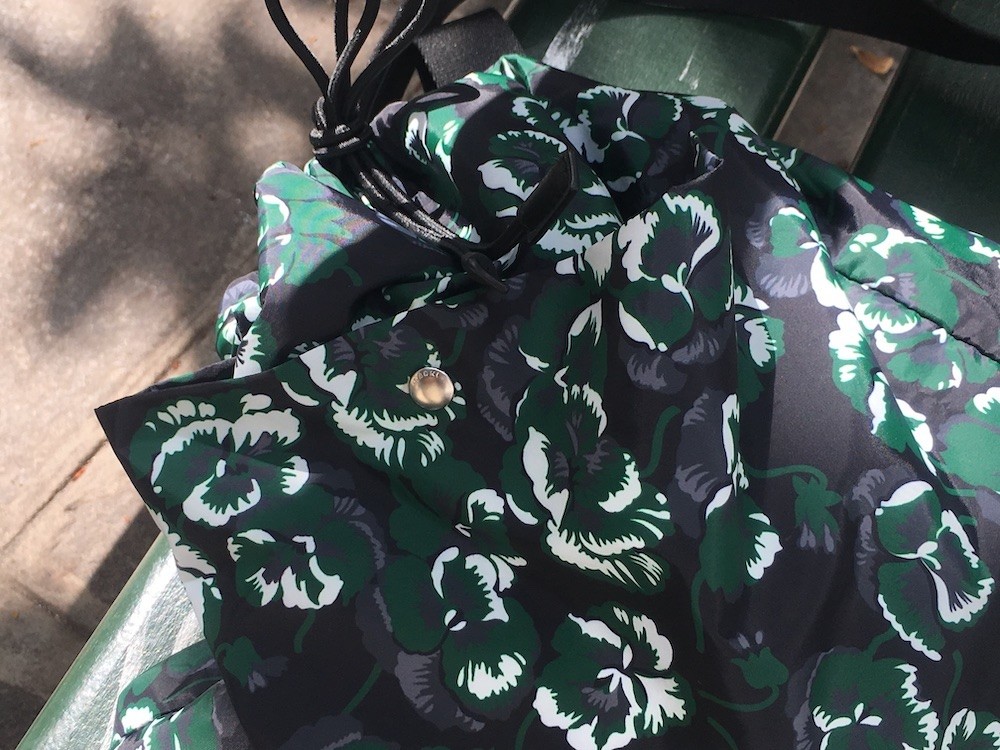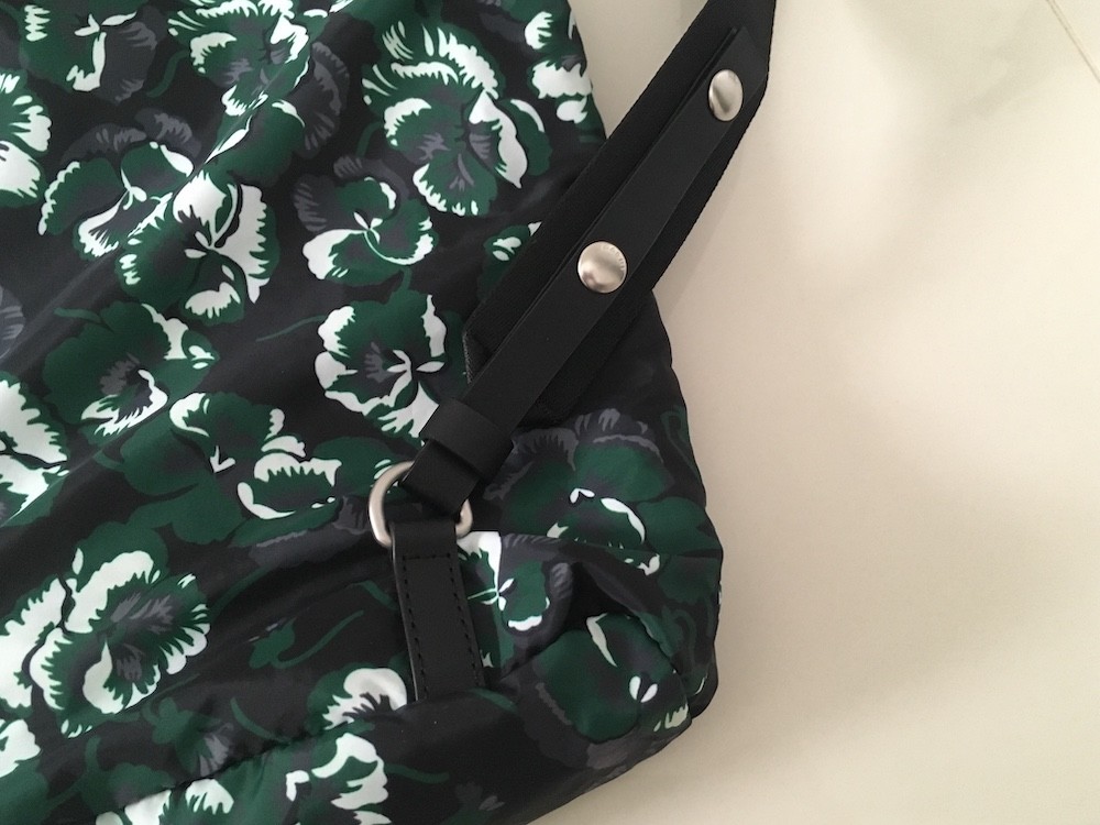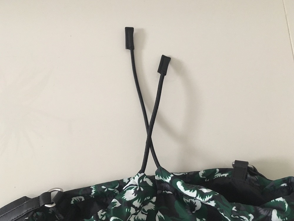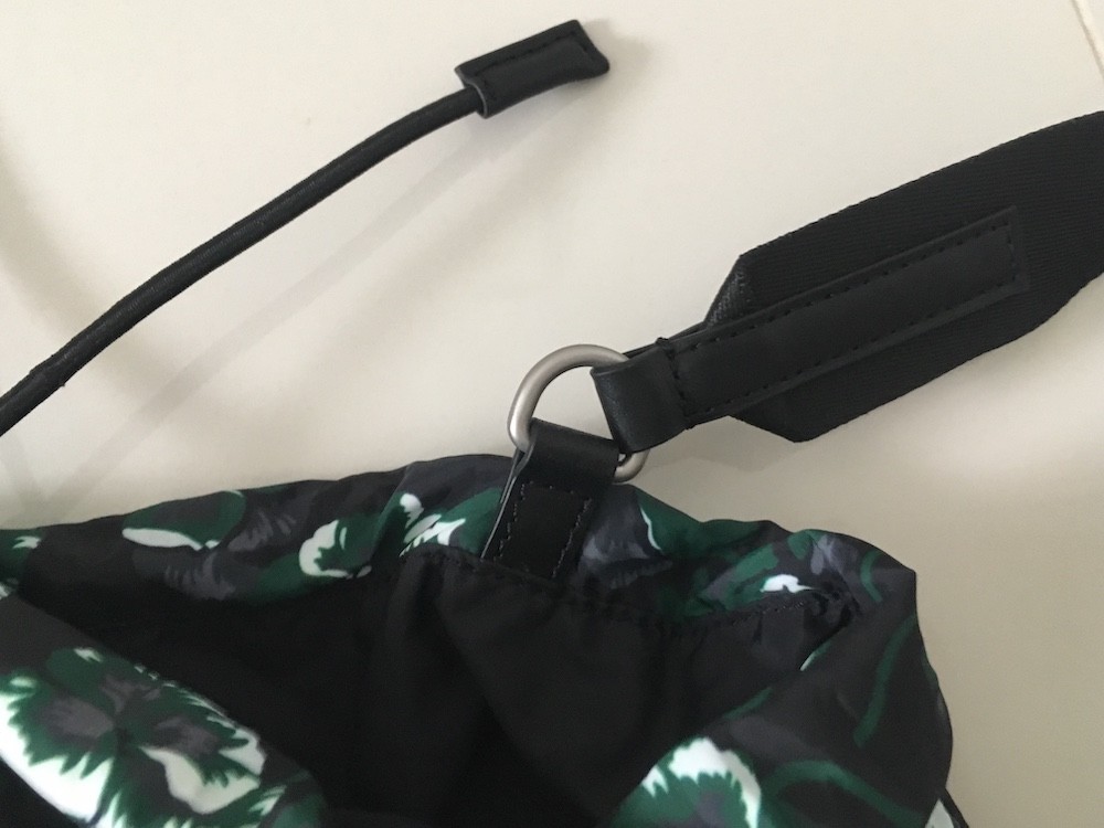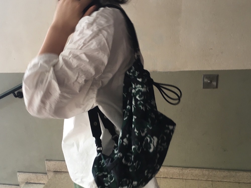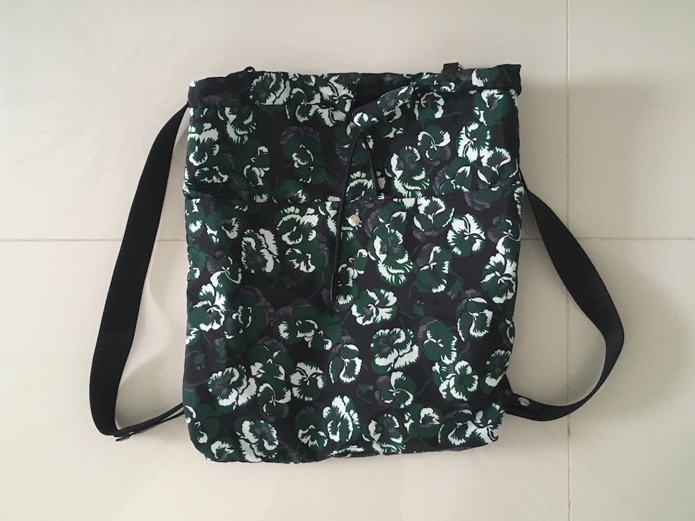 검정색 바탕에 초록색과 흰색으로 꽃무늬가 있는데 이게 유치하지 않아 예뻐요. 위쪽은 고무줄로 묶어 잠그는 디자인이고요, 앞쪽엔 큰 주머니 두개가 달려 있어서 얇은 물건들을 나누어 넣을 수 있어요. 끈 길이를 똑딱이 단추로 조절할 수 있어서 백팩처럼 메어도 좋고, 길이 조절을 해서 크로스처럼 메거나 한쪽 어깨에 에코백처럼 활용해도 예쁘더라고요!