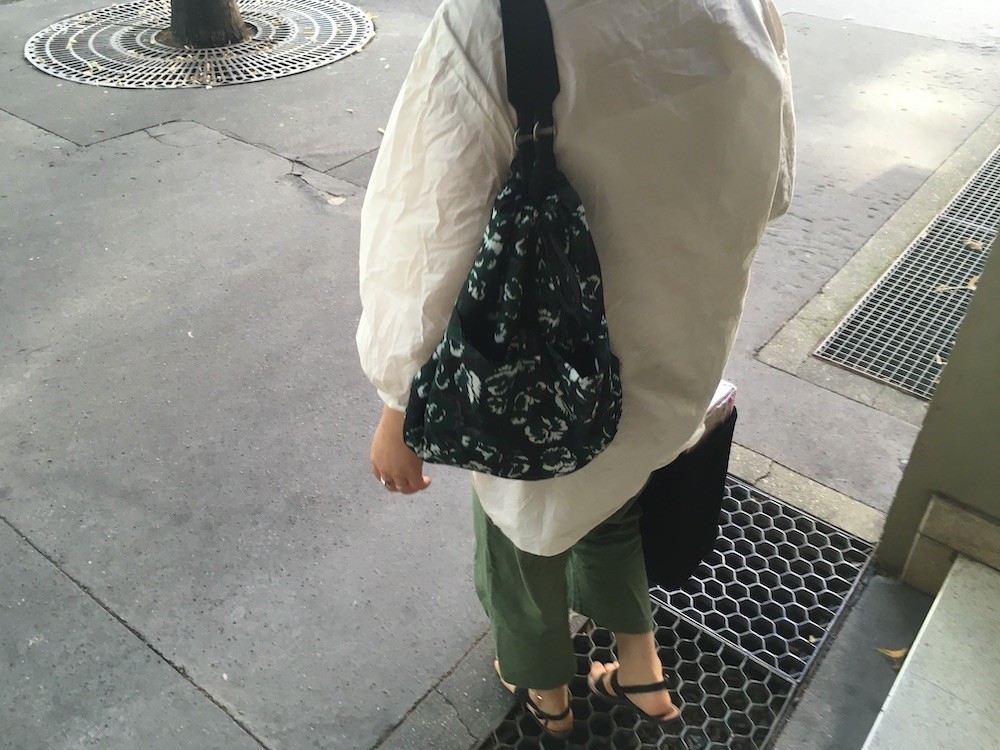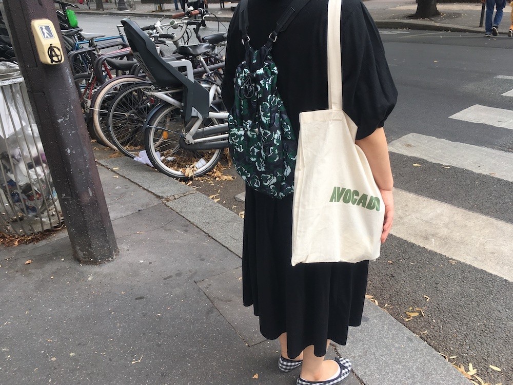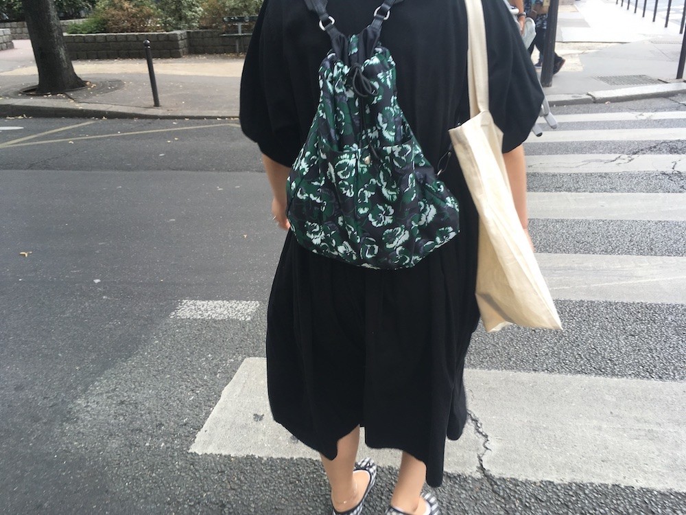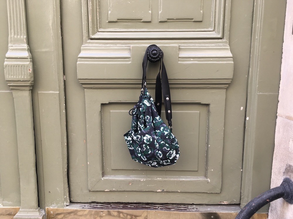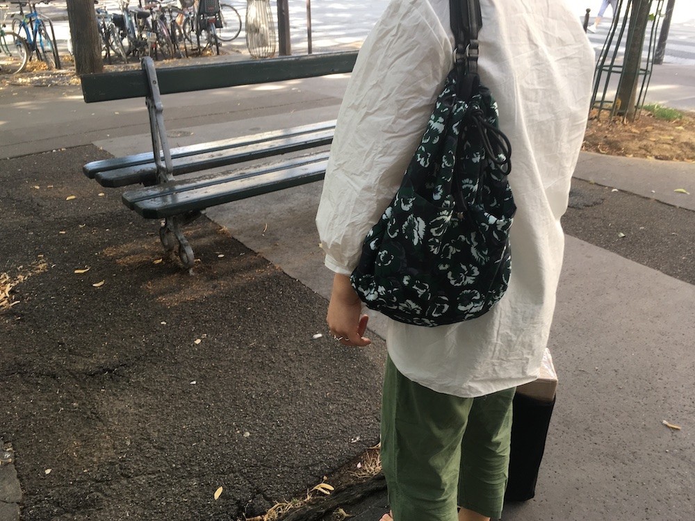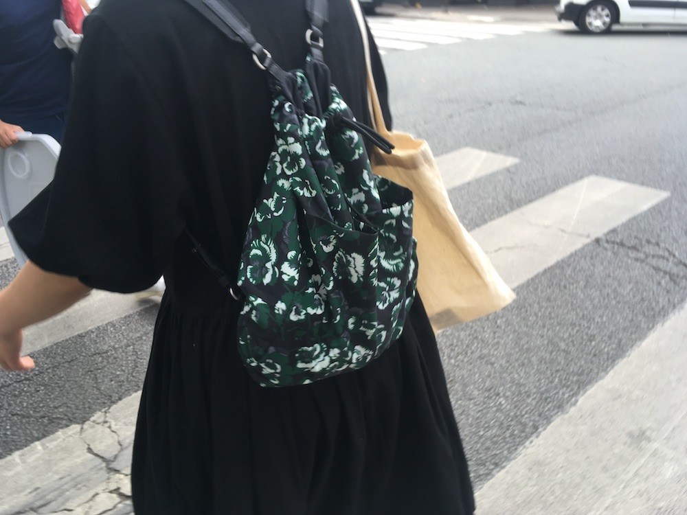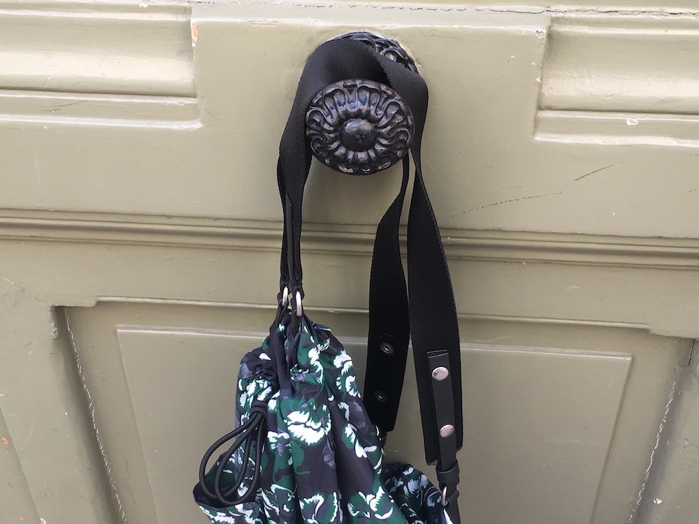 검정색 바탕에 초록색과 흰색으로 꽃무늬가 있는데 이게 유치하지 않아 예뻐요. 위쪽은 고무줄로 묶어 잠그는 디자인이고요, 앞쪽엔 큰 주머니 두개가 달려 있어서 얇은 물건들을 나누어 넣을 수 있어요. 끈 길이를 똑딱이 단추로 조절할 수 있어서 백팩처럼 메어도 좋고, 길이 조절을 해서 크로스처럼 메거나 한쪽 어깨에 에코백처럼 활용해도 예쁘더라고요!