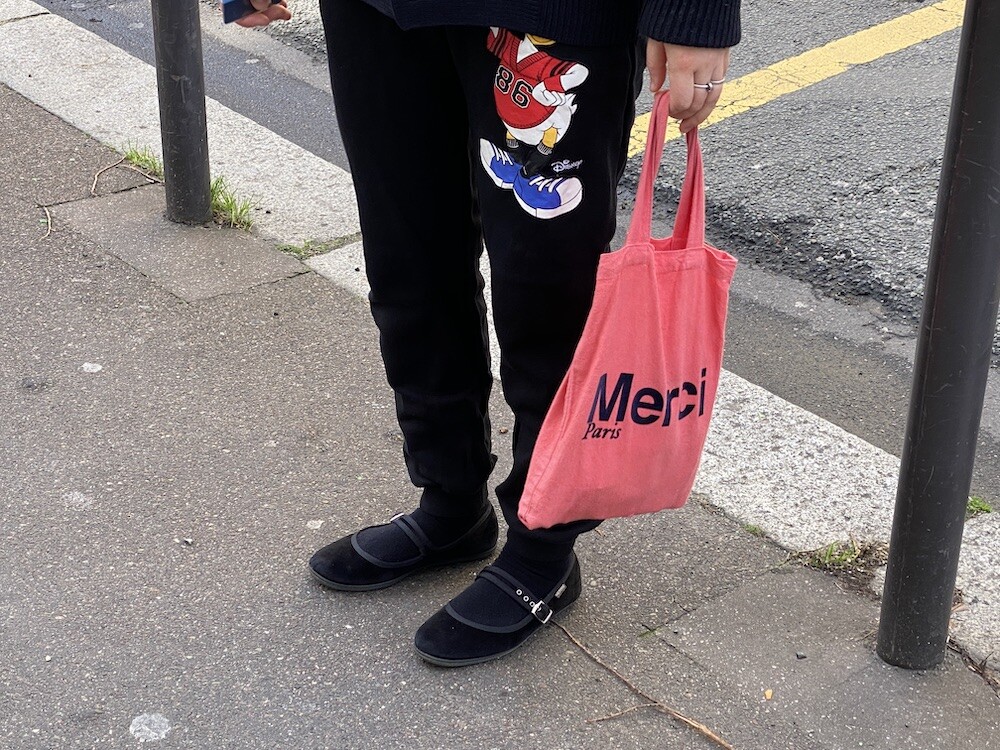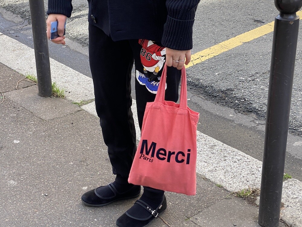 꽃분홍색 바탕에 네이비 글씨가 너무 예쁜 에코백이에요. 미니백 치고는 사이즈도 넉넉해서 이것저것 담아 팔에 걸고 다니시기 좋을 거예요.