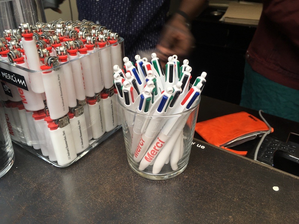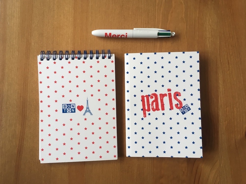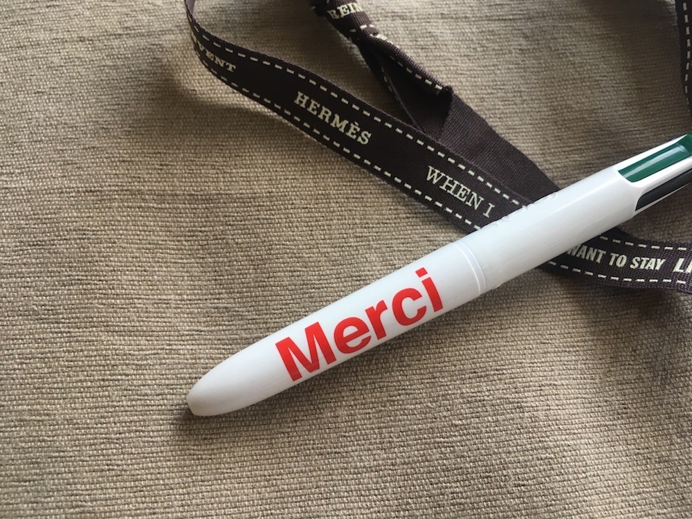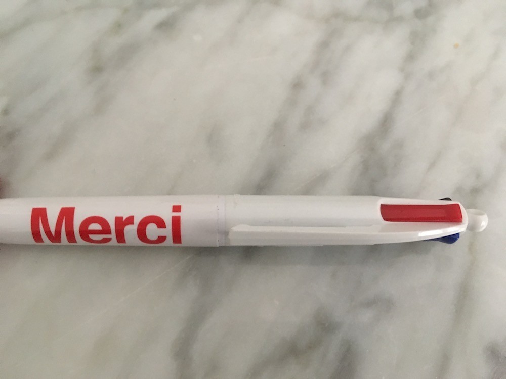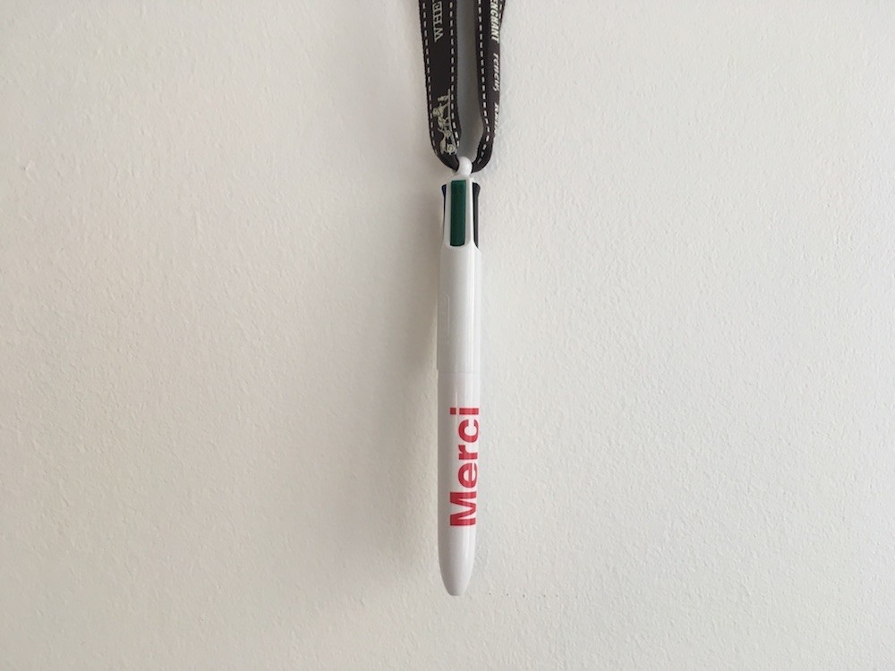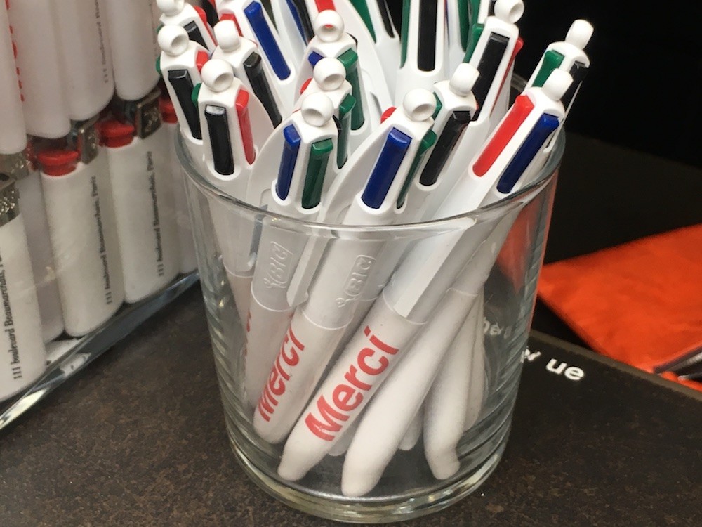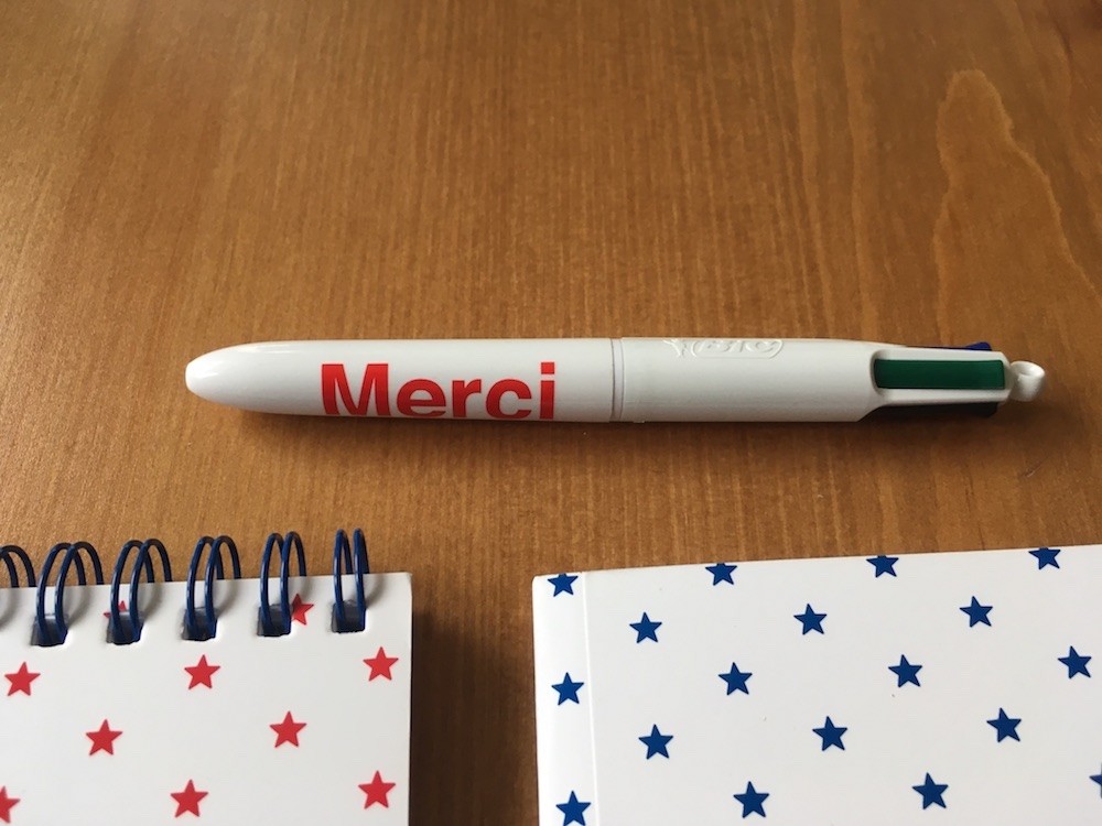Bic 4 couleurs Mini. Encres noire, rouge, verte et bleue. Pointe 1 mm. Rétractable. Lettrage "Merci".