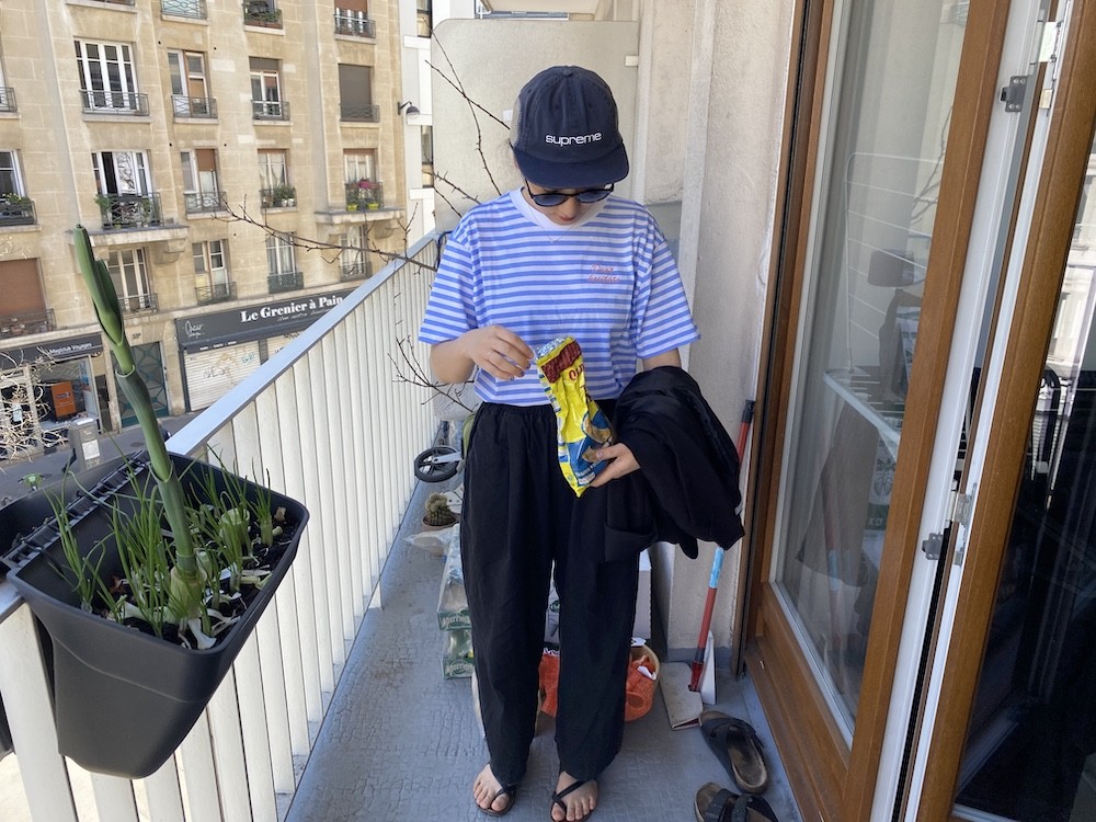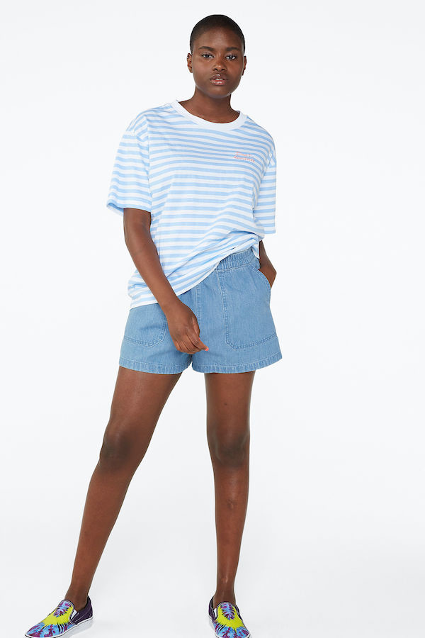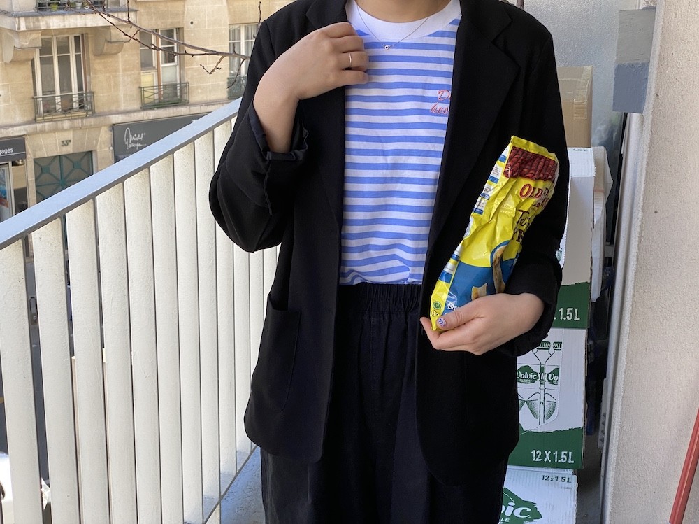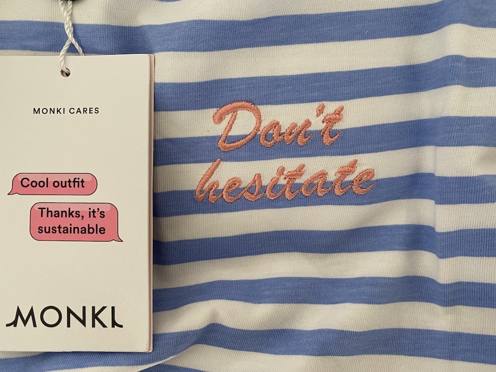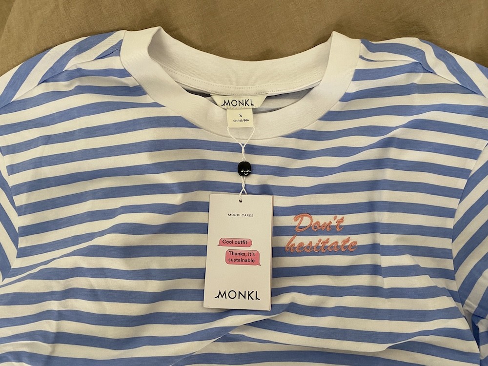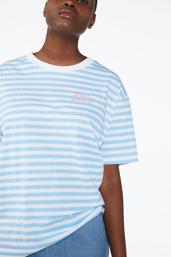 이 줄무늬 티셔츠는 색깔이 밝고 예뻐요. 소재감이 가벼워서 여름에 여기저기 입기 좋은 티예요. 하늘색 줄무늬에 가슴엔 분홍색으로 자수가 놓아져 있는데 "Don't hesitate 망설이지 마" 라고 써져있는 게 왠지 용기를 주는 것 같아 기분이 좋네요.