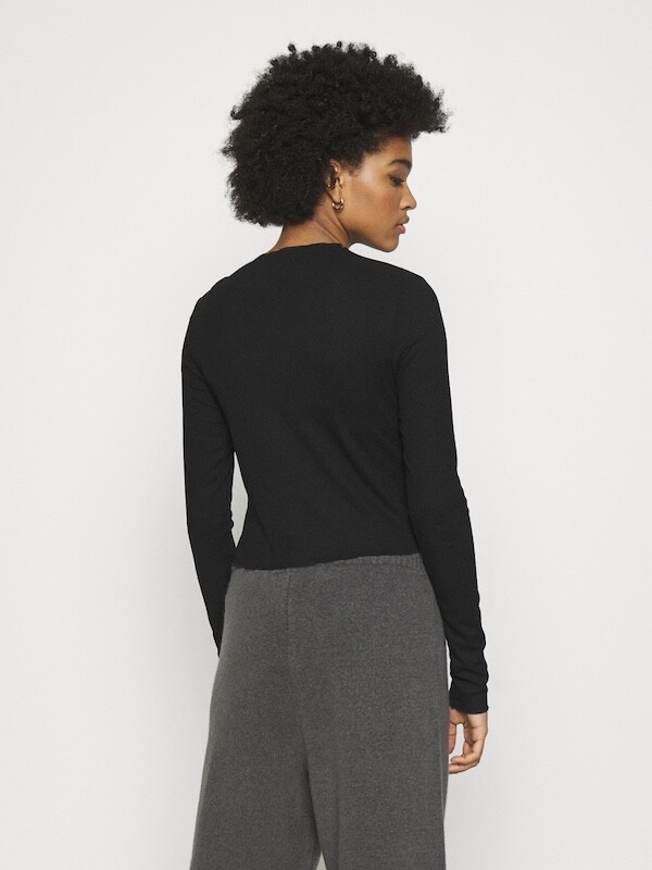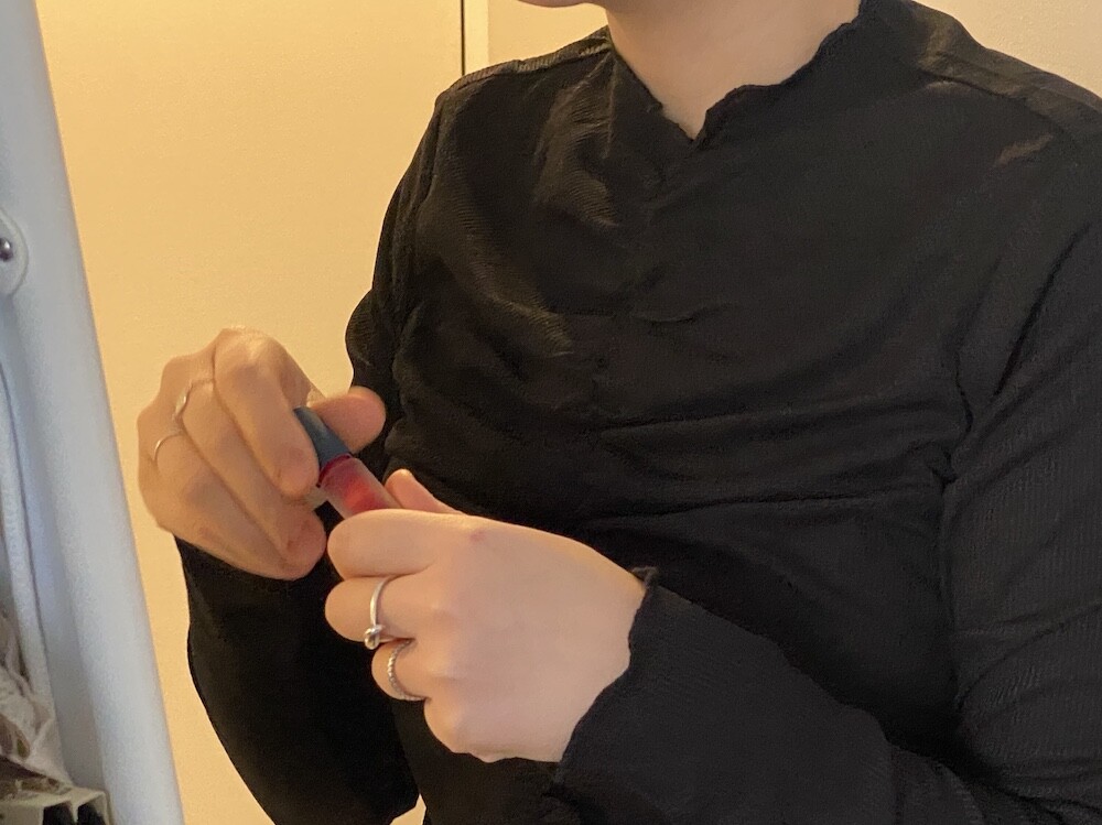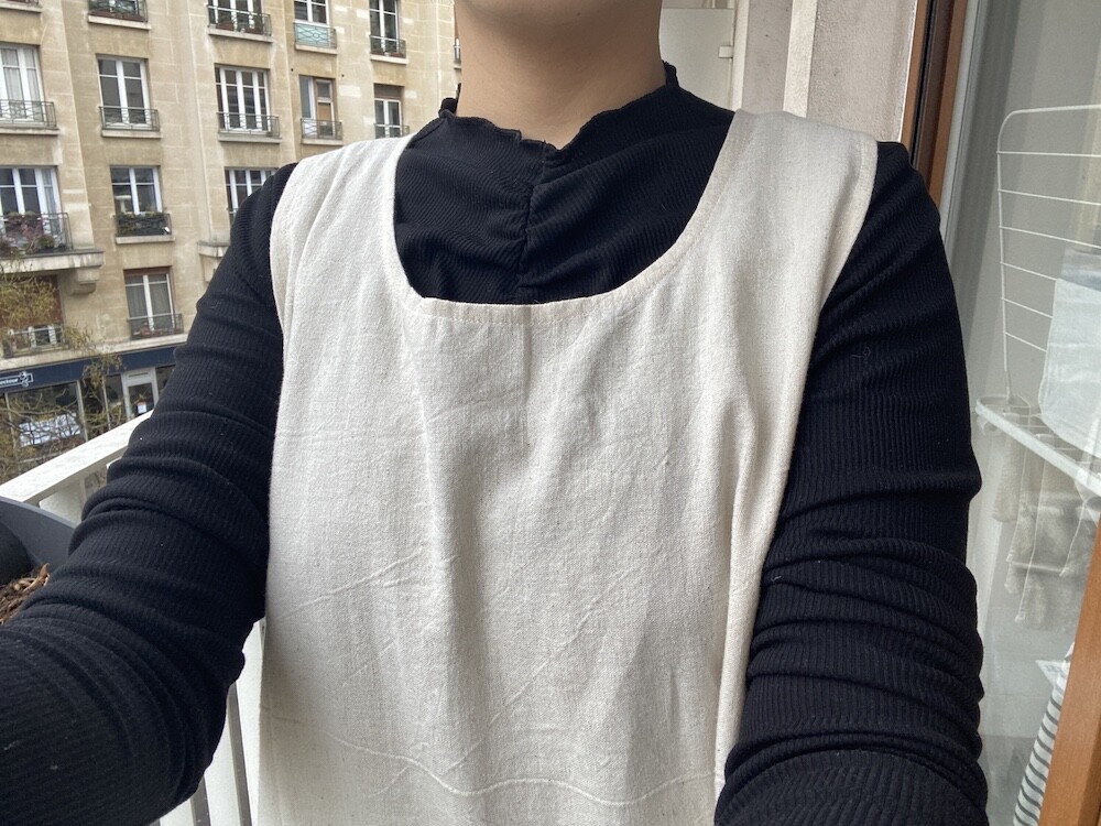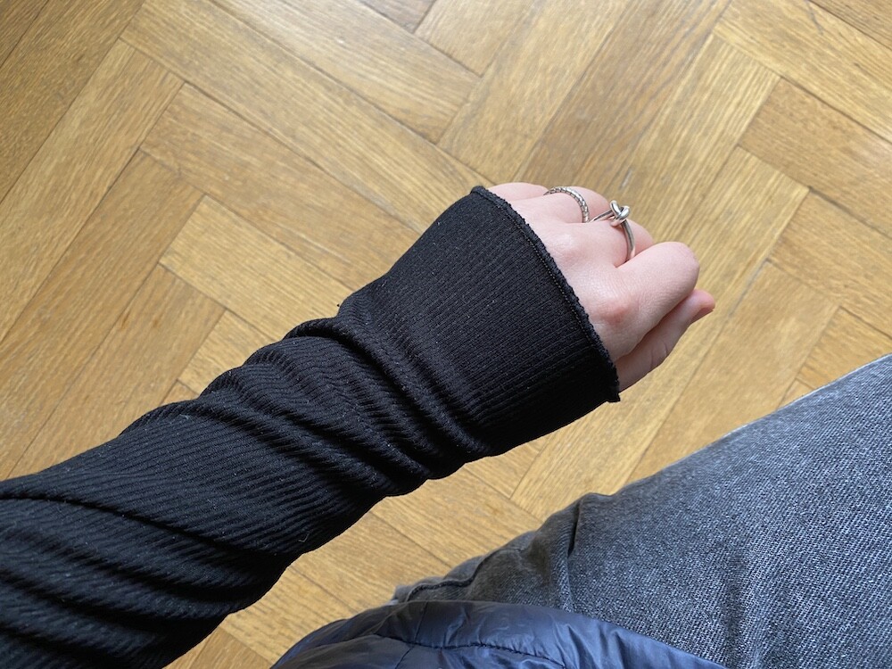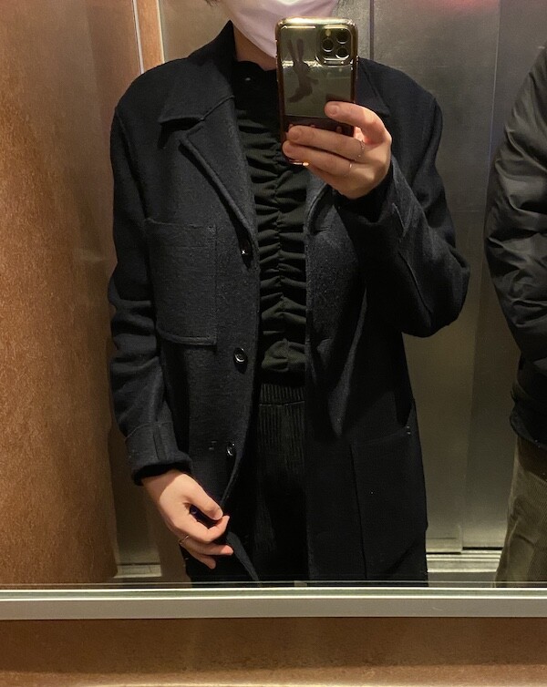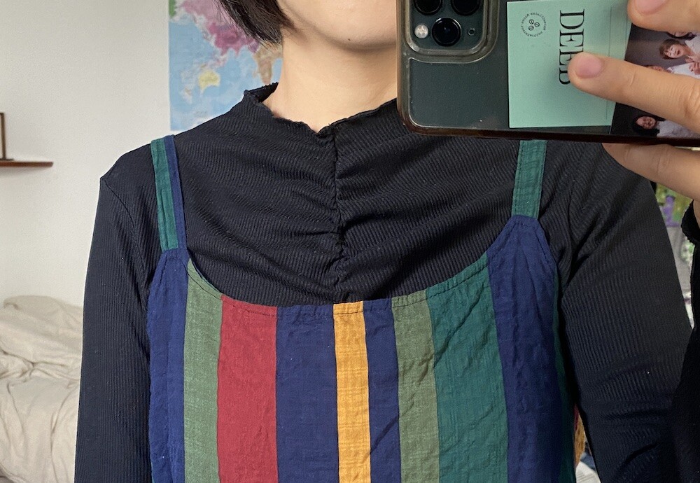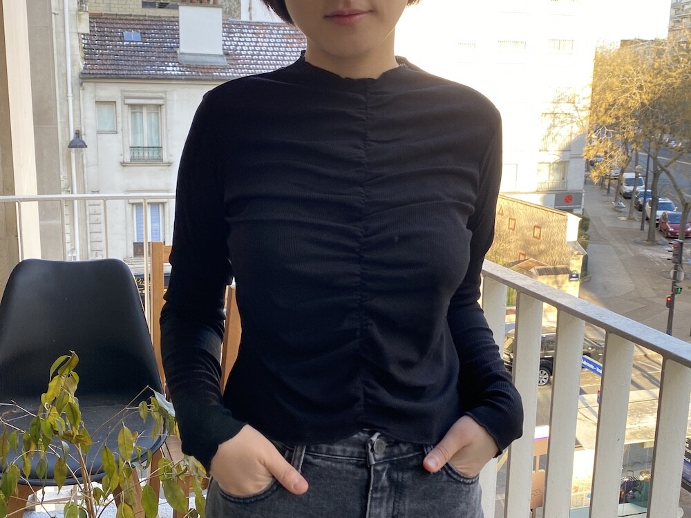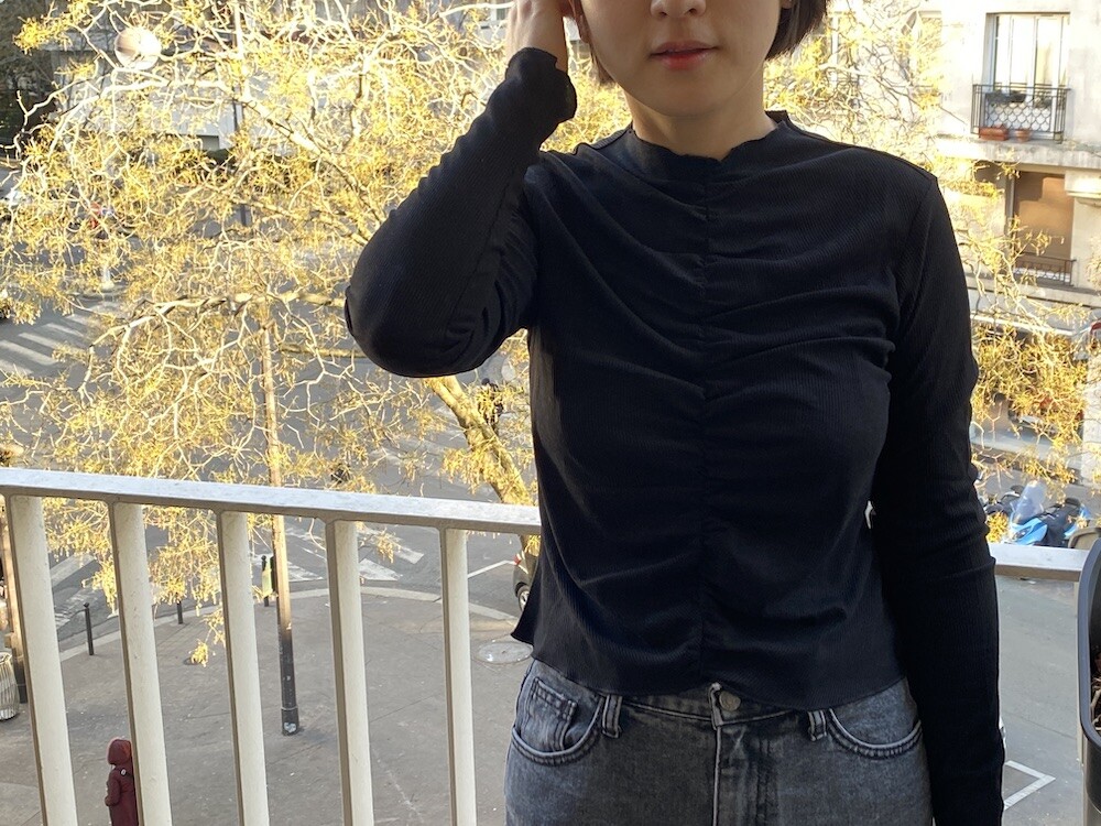 저는 목티를 좋아했었는데, 나이가 들수록 목 끝까지 올라오는 티를 입으면 숨이 막히는 느낌이 들더라고요. 그래서 목이 살짝만 올라온 티셔츠로 목티 느낌만 줘요. 이 티셔츠는 꽃잎처럼 자글자글 주름이 잡힌 반목 티셔츠로, 목부분이 꽉 끼지 않아 너무 편하고요. 골지 소재라 입고 벗을 때 몸을 쪼이지 않아 좋아요. 몸판 앞부분에 주름을 잡아 디자인도 예쁘고, 길이감이 너무 길지 않아 바지와 함께 입었을 때 다리가 정말 길어 보여요. 단독으로 입어도 예쁘고, 나시 원피스나 재킷과 함께 입어도 정말 예뻐요. 소매 기장이 넉넉한 것도 정말 매력있어요.