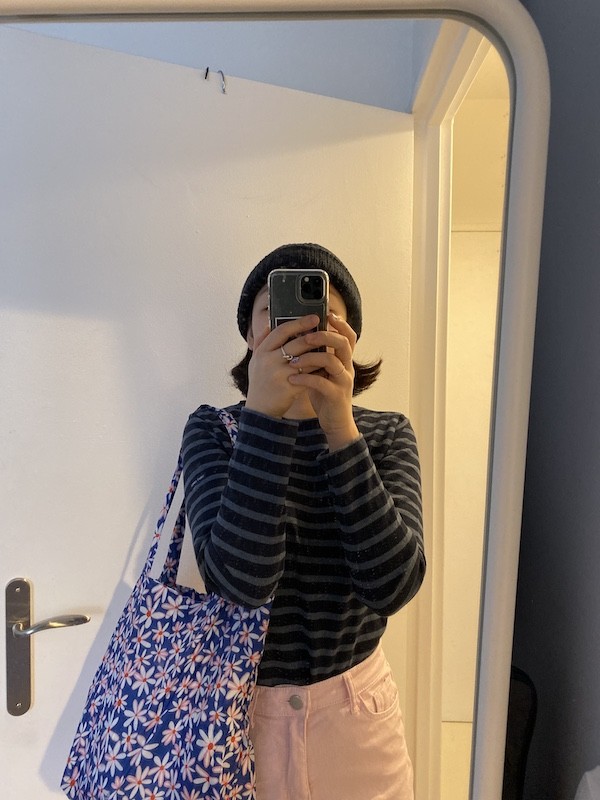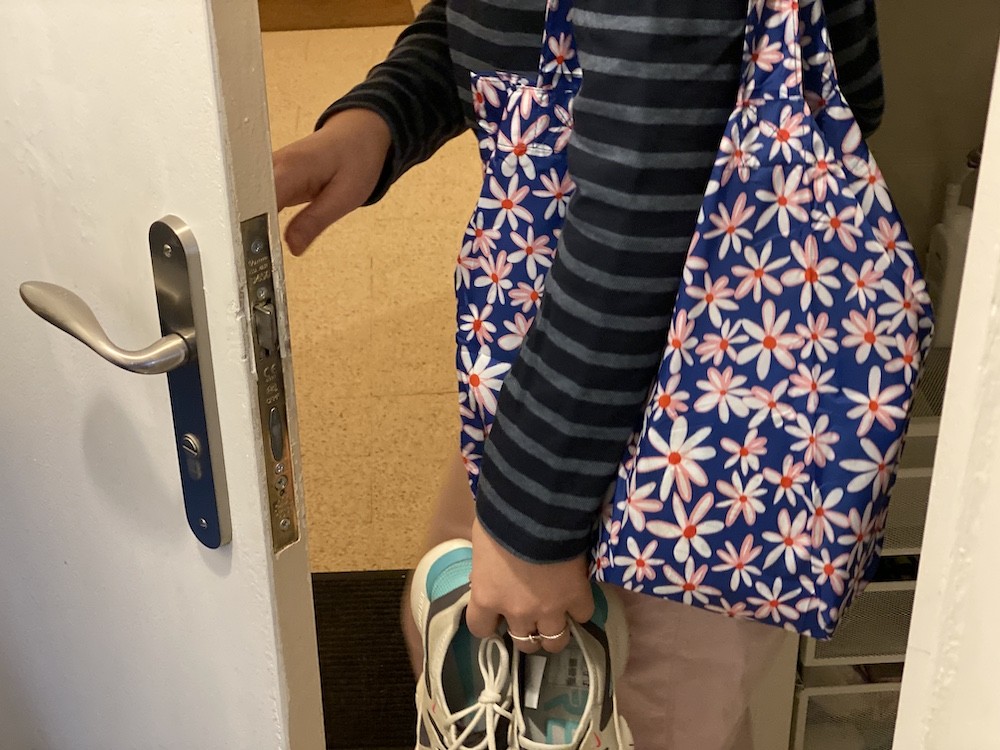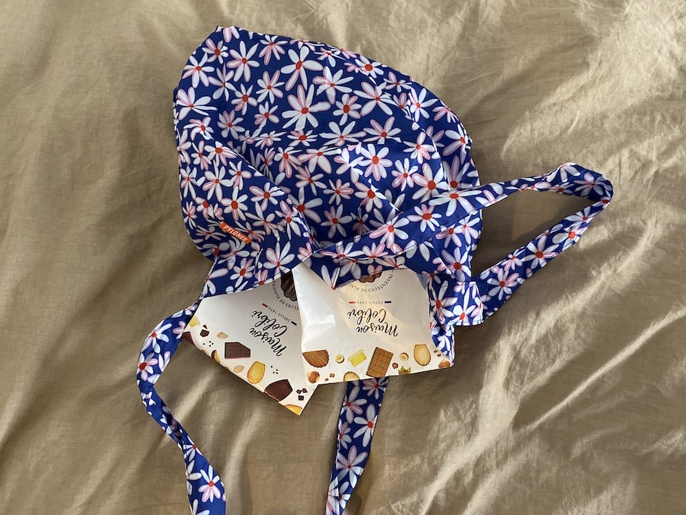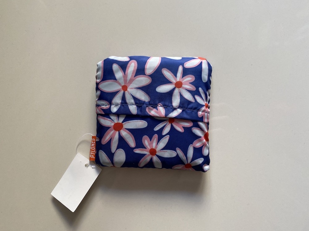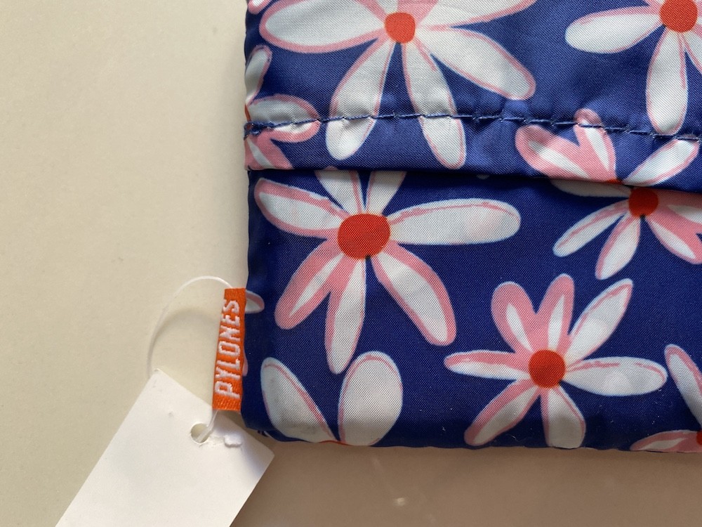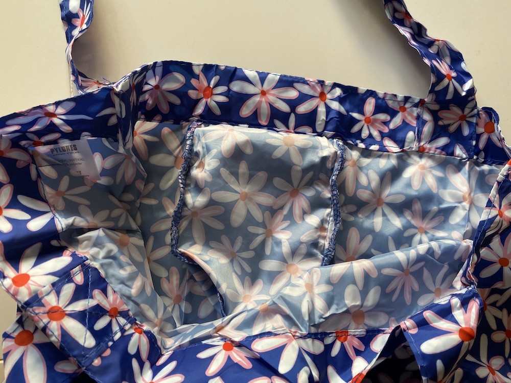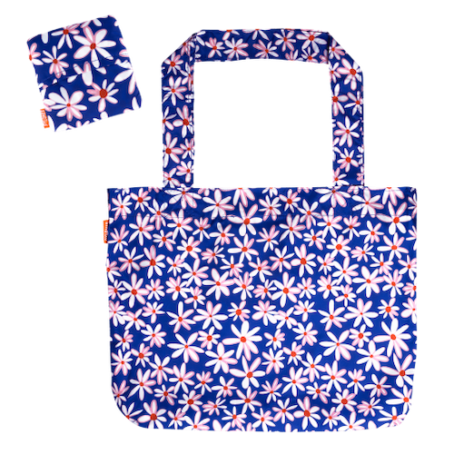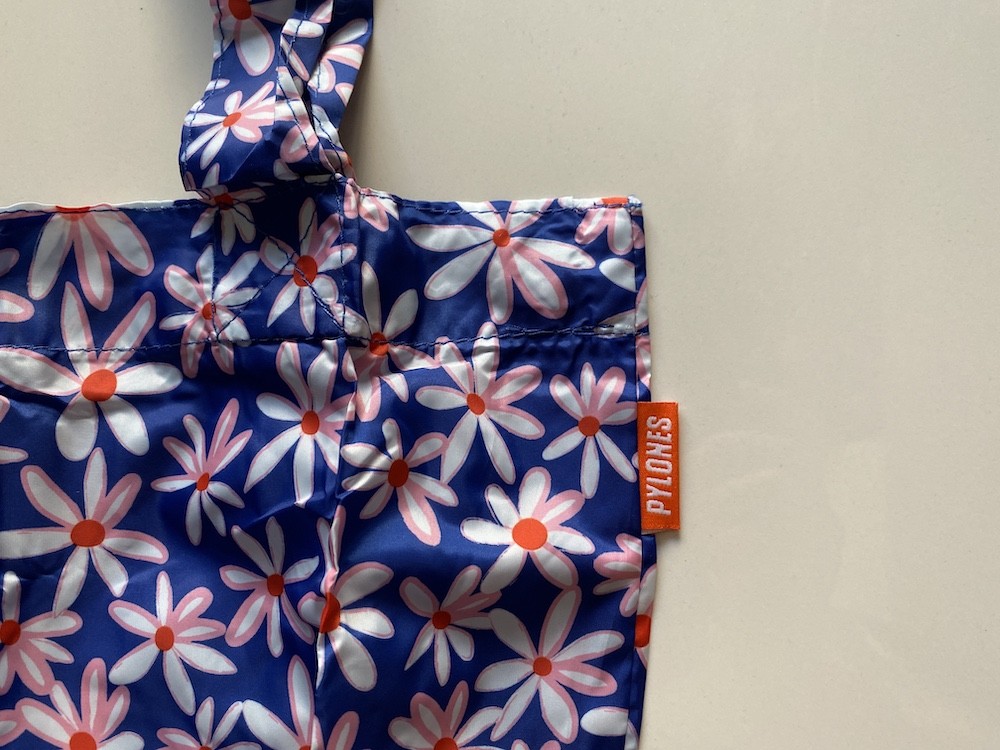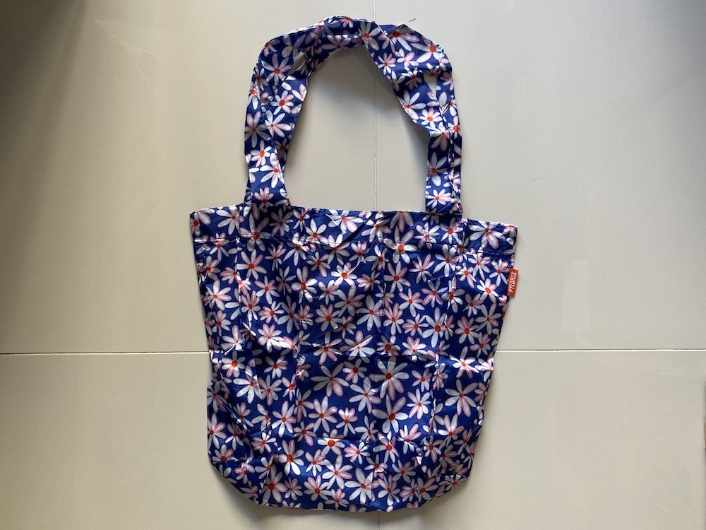 이 장바구니는 우선 색깔이 너무 예뻐요. 파란색 바탕에 분홍과 흰색, 빨강이 섞인 꽃이 예뻐요. 눈에 확 띄는 패턴인데 유치하지 않고 귀엽다는 느낌이 들어요. 평소에는 접어서 가방에 넣고 다니다가 필요할 때 꺼내 쓰기 딱 좋은 가벼운 무게감이 아주 실용적이고요.