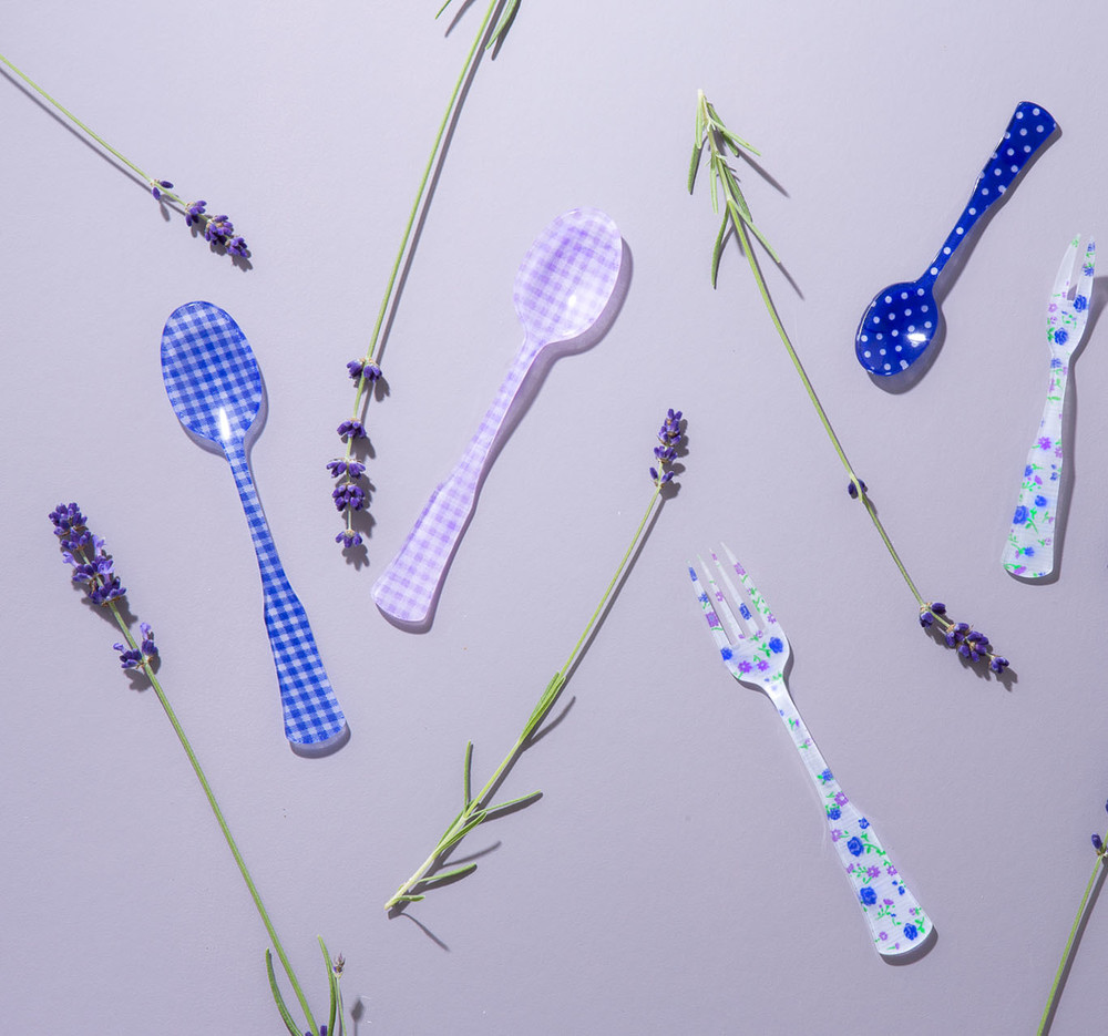사브르만의 아크릴 가공 기법으로 만들어진 스푼과 포크예요. 아크릴 사이에 아주 얇게 천을 집어넣어 가공한 것으로, 모양이 까지거나 벗겨질 염려 없이 오래 사용하실 수 있어요.