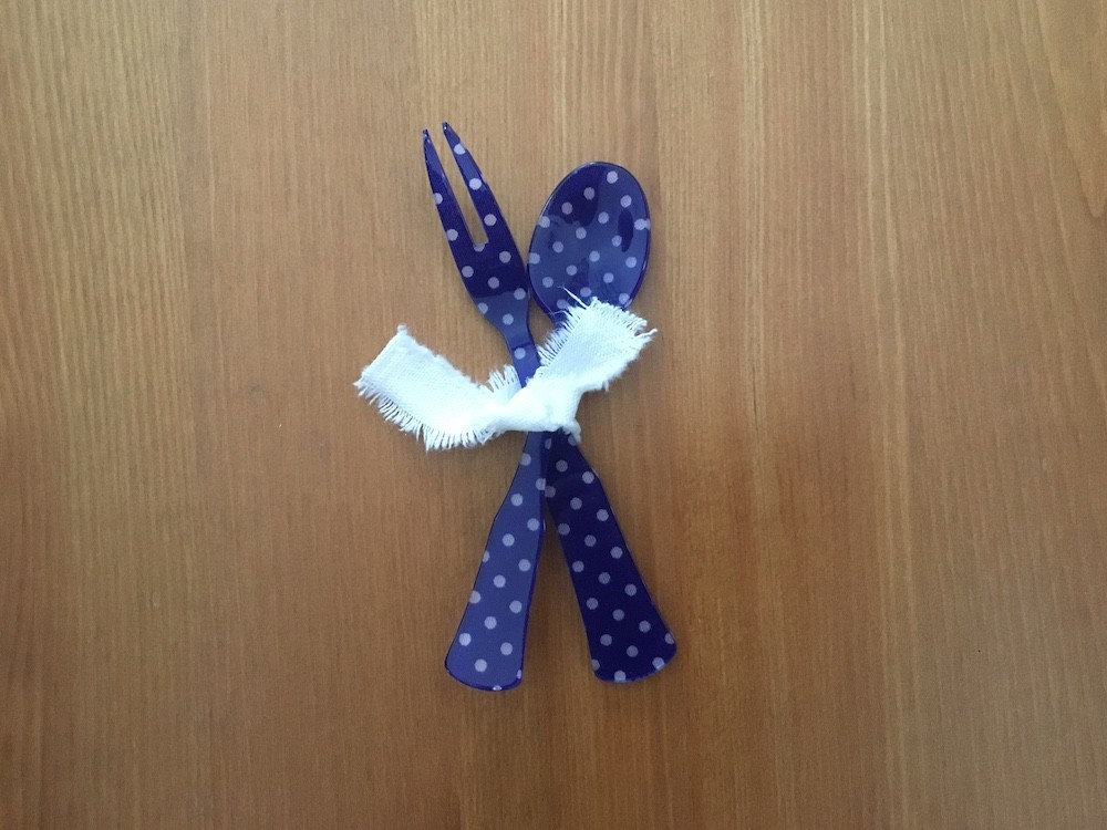 프렌치 커트러리 브랜드 사브르 파리(SABRE PARIS)의 티스푼과 포크 세트 중 파랑 도트입니다.