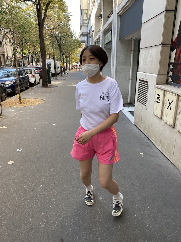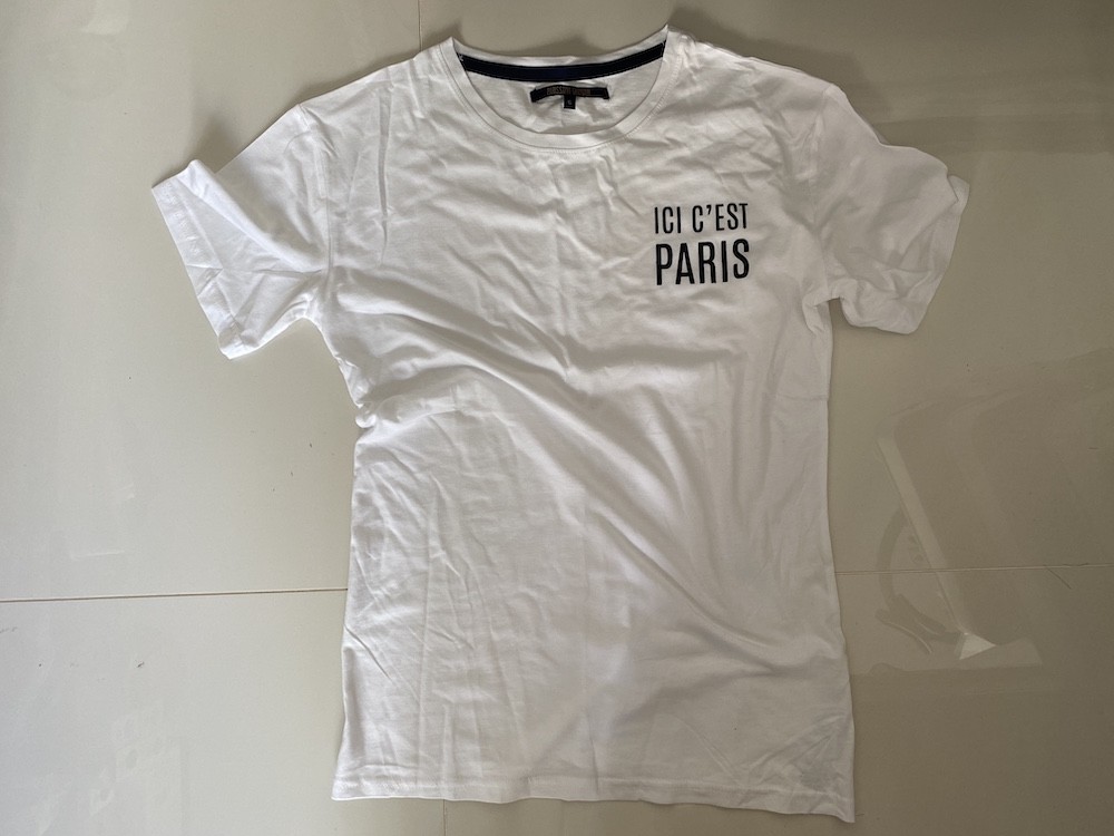 왼쪽 가슴에 진한 네이비 컬러로 양각 프린트된 "ICI C'EST PARIS"는 "여기는 파리" 라는 뜻이에요. 이건 프랑스 축구팀을 응원할 때 외치는 구호랍니다. 우리나라의 "대~한민국! 짝짝짝 짝짝!" 처럼요!