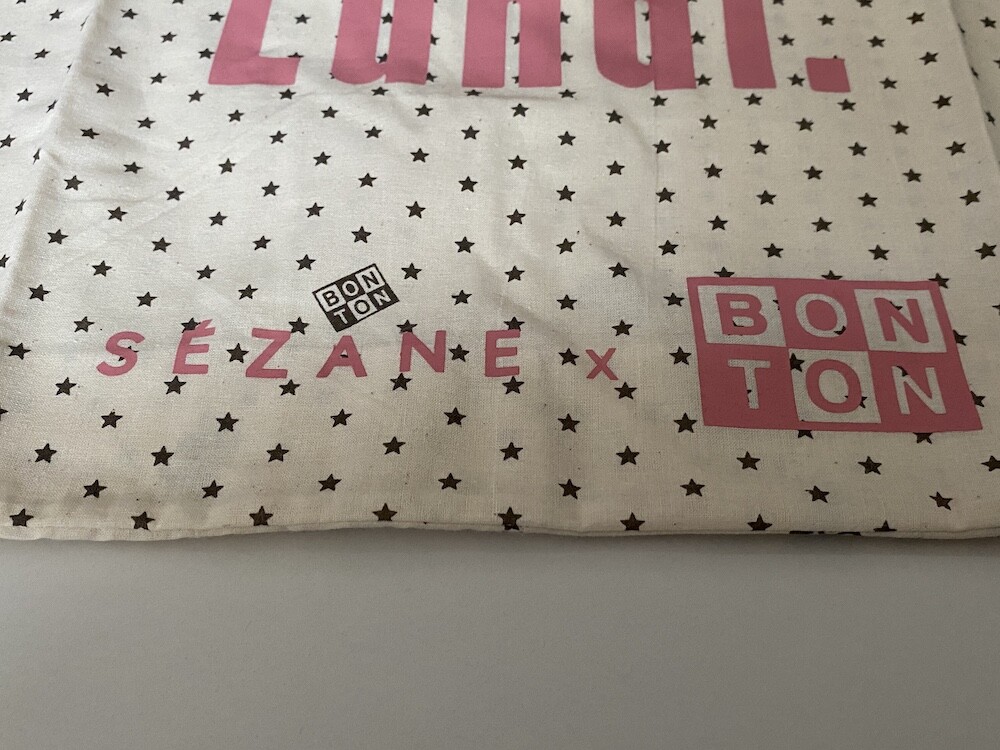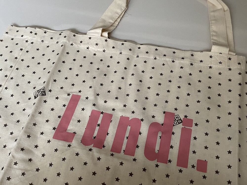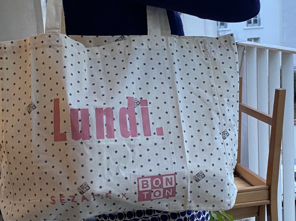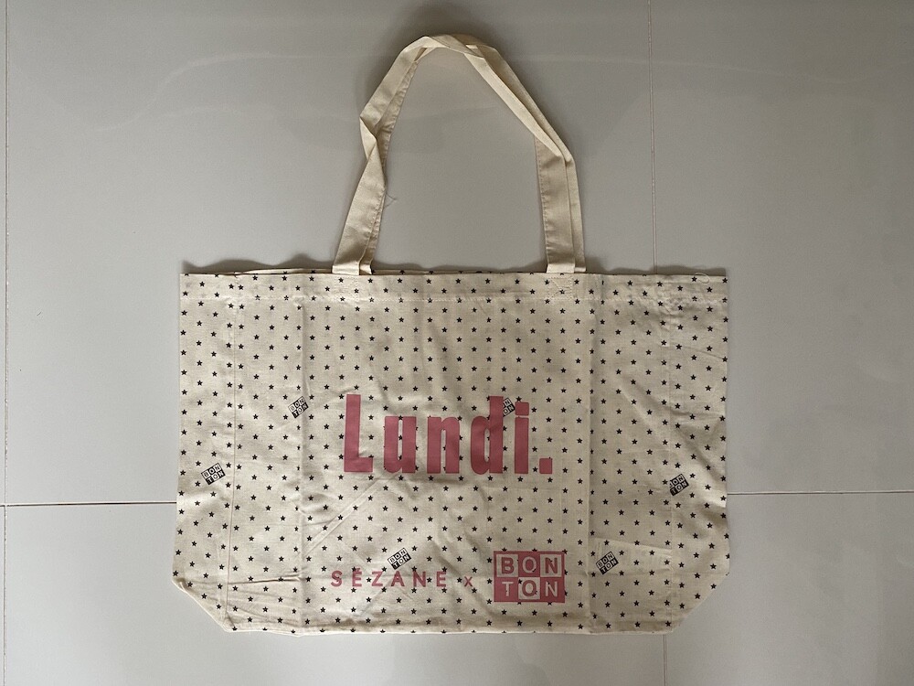 이 에코백은 세잔과 봉통의 콜라보로 더욱 희소성이 있는 제품이에요. 봉통의 기본 에코백 위에 세잔이 프린트를 한 제품으로, 가방의 씌여진 Lundi는 "월요일"이라는 뜻이에요. 유독 월요병이 심한 날 이 가방을 메고 나가면 기분이 좋아질 것 같은 느낌이에요.