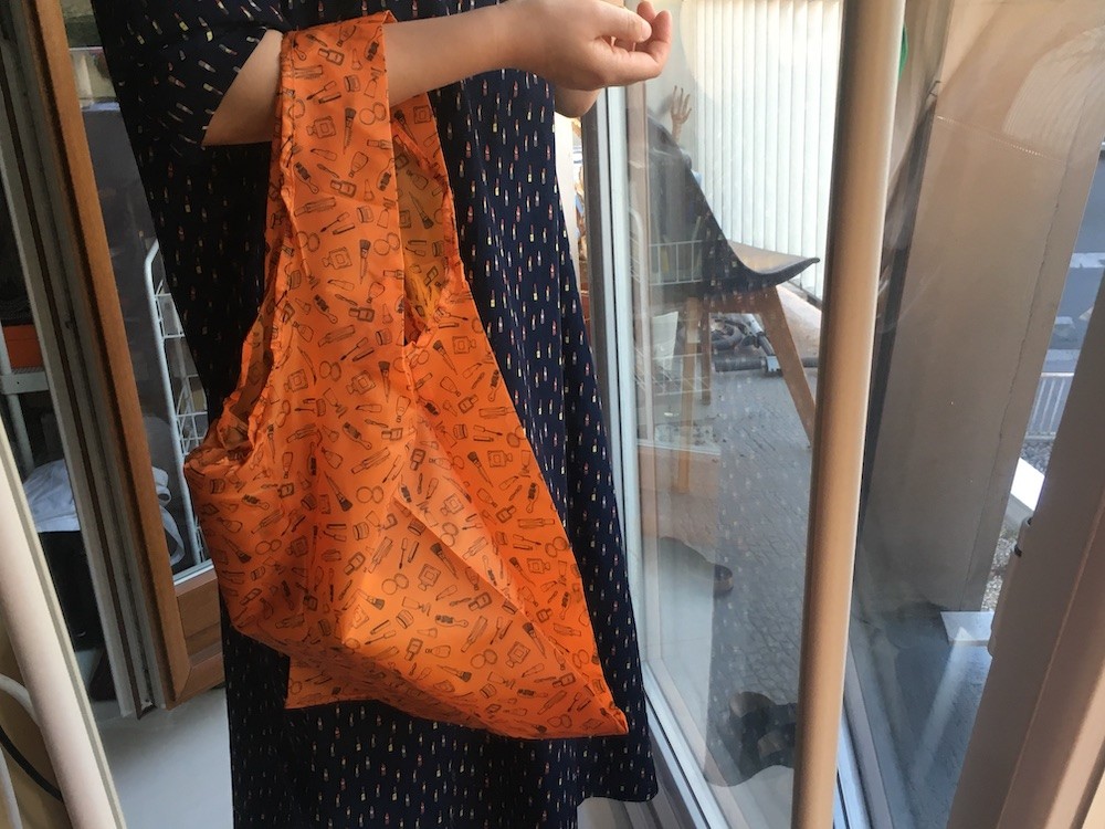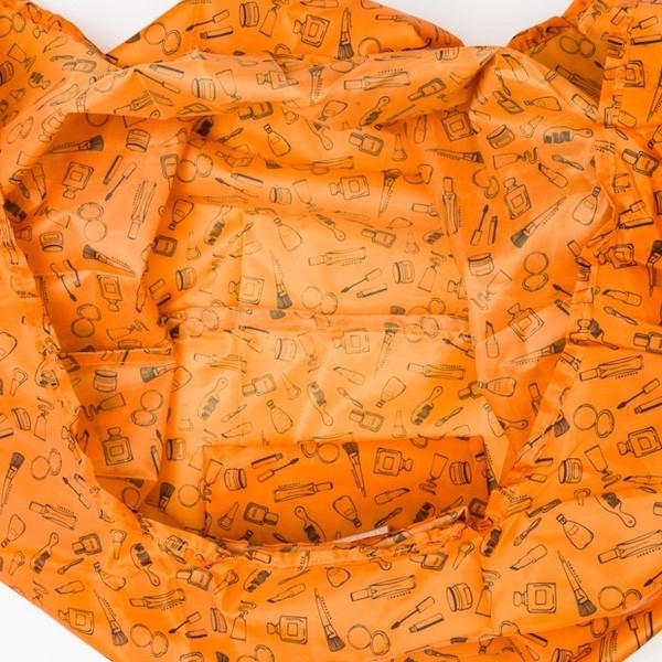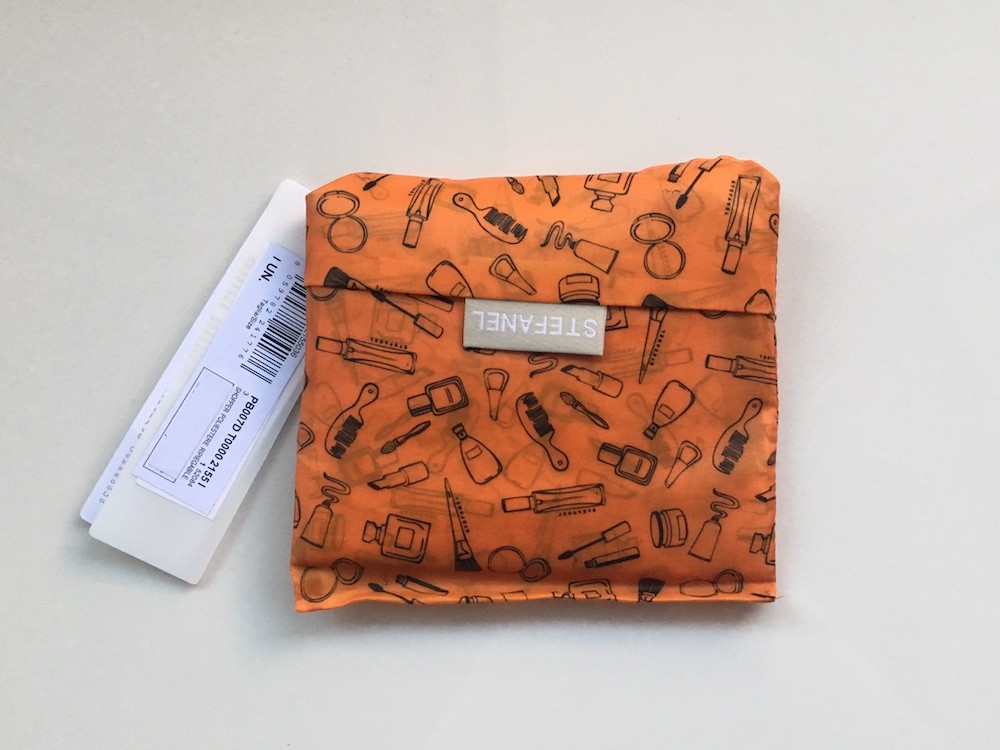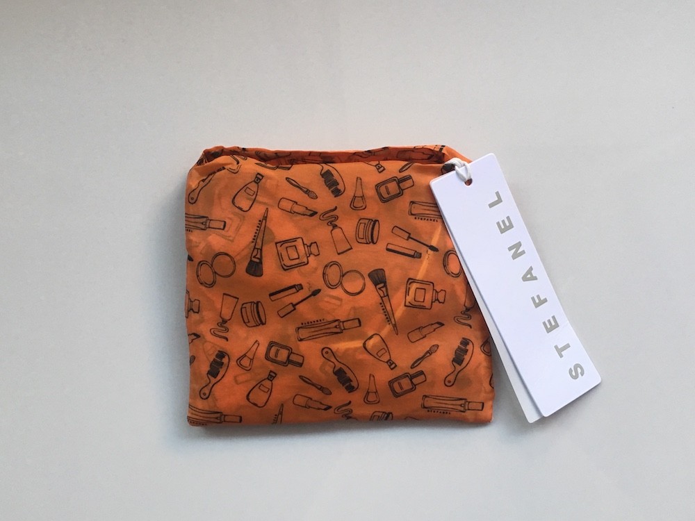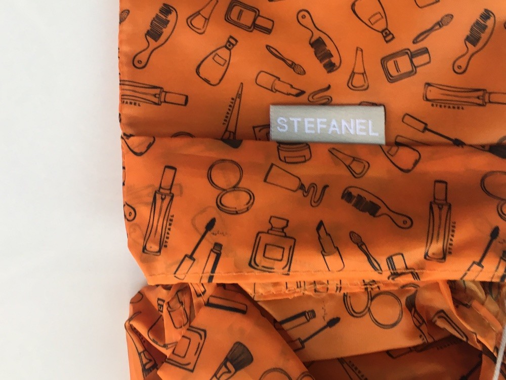 부피가 크지 않아서 가방 속에 쏙 넣고 다니다가 필요한 순간에 꺼내서 사용할 수 있고, 합성 소재로 무게가 아주 가벼워서 실용성이 좋아요. 원단에 그려진 화장품 그림과 그 옆에 깨알같이 씌여진 STEFANEL 글씨도 참 귀엽고요.
