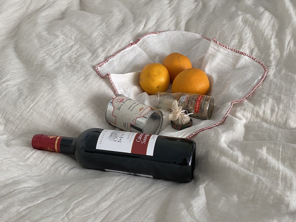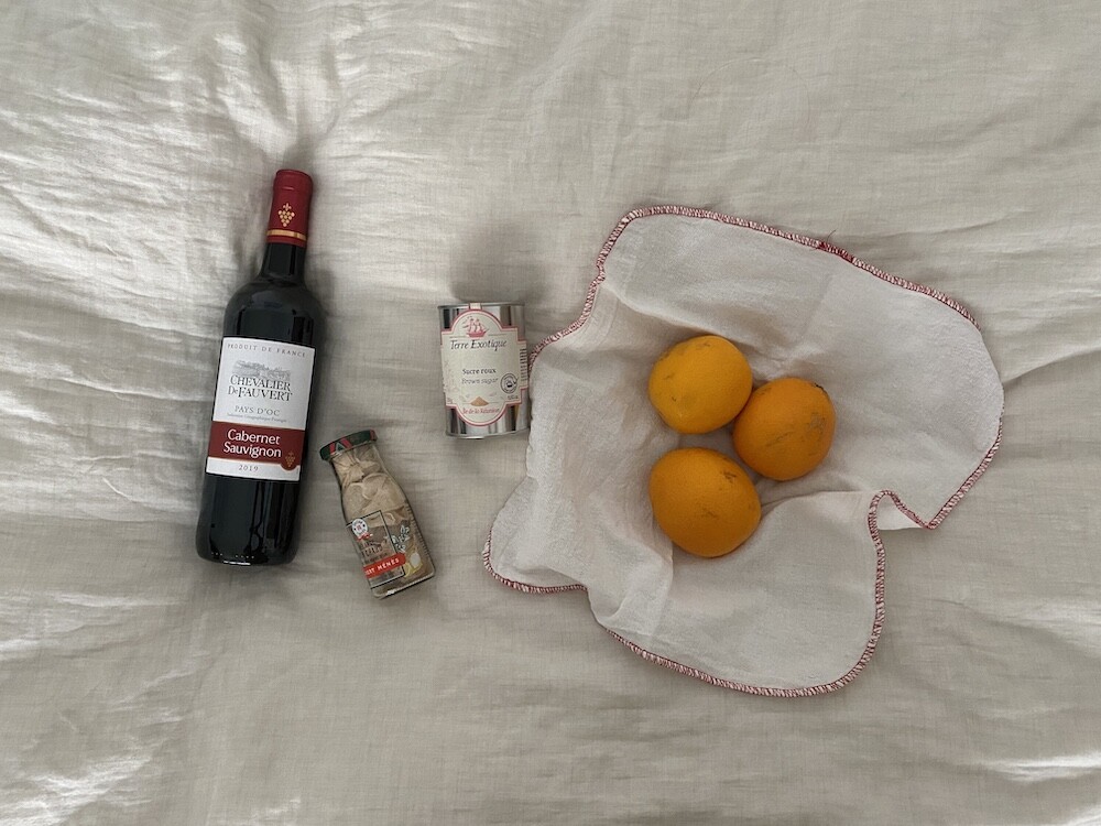 재료 : 와인 한 병, 알베흐 메네스 방쇼 향신료 묶음 2~3개, 오렌지 3개, 브라운 슈가