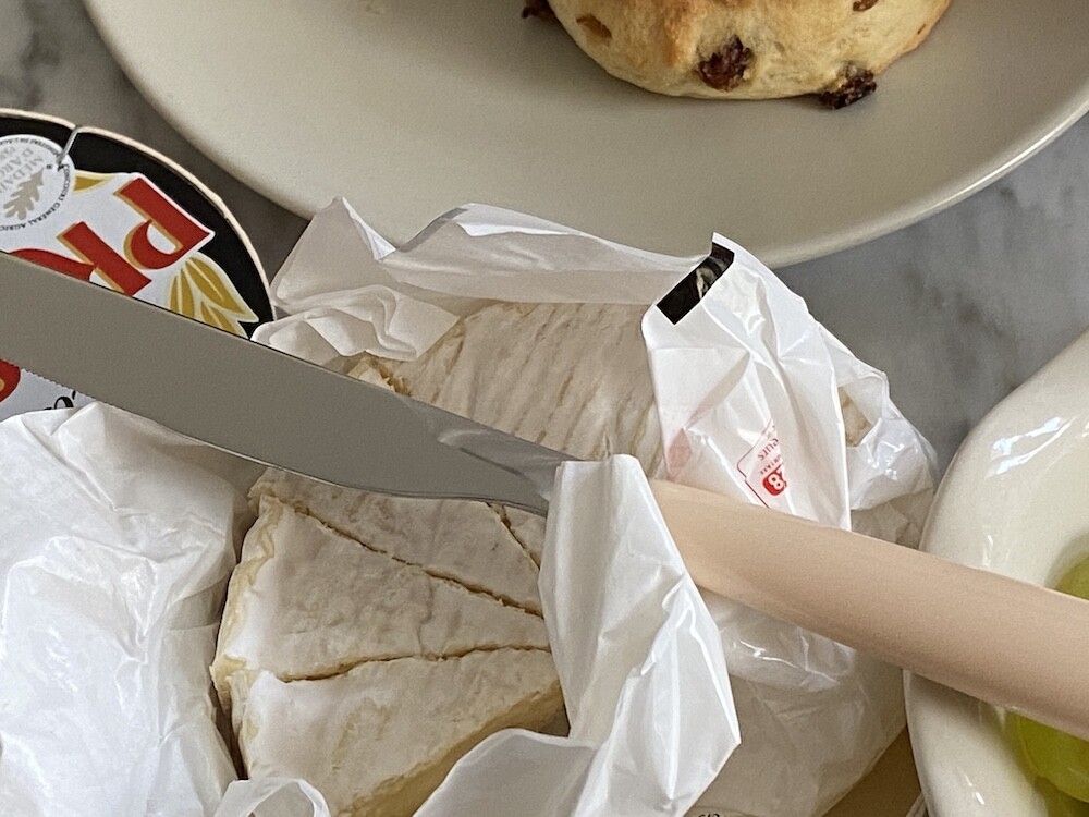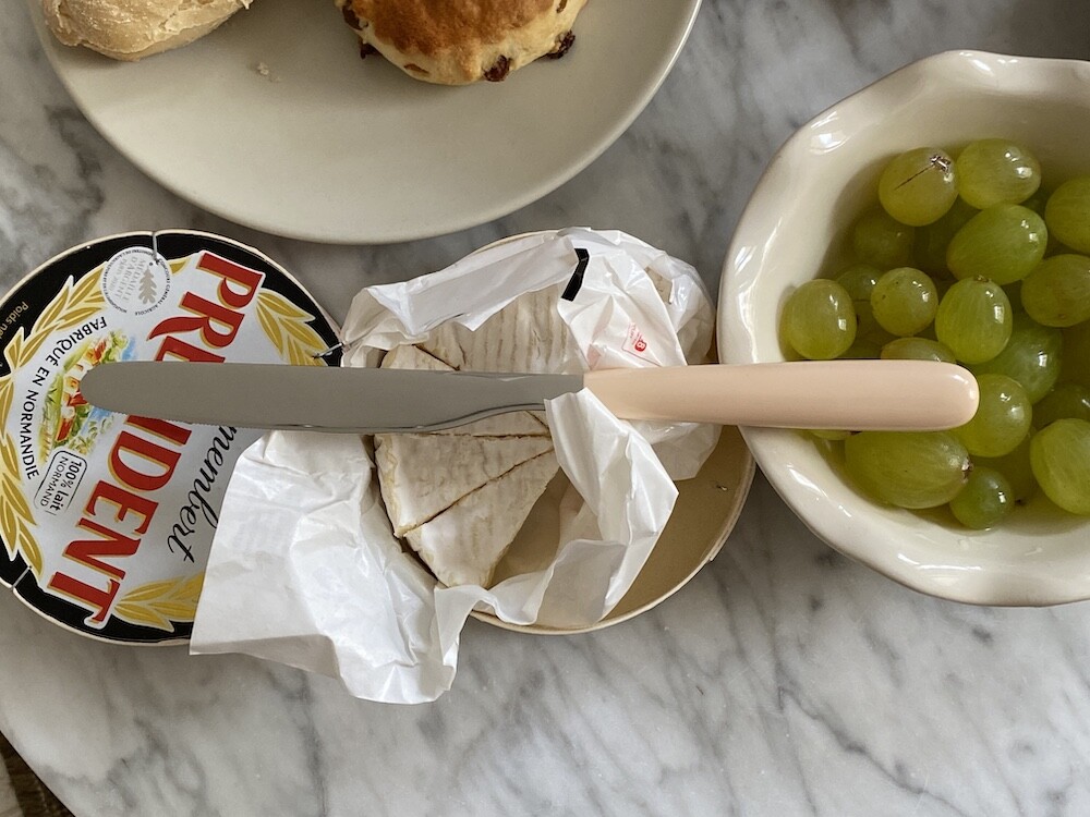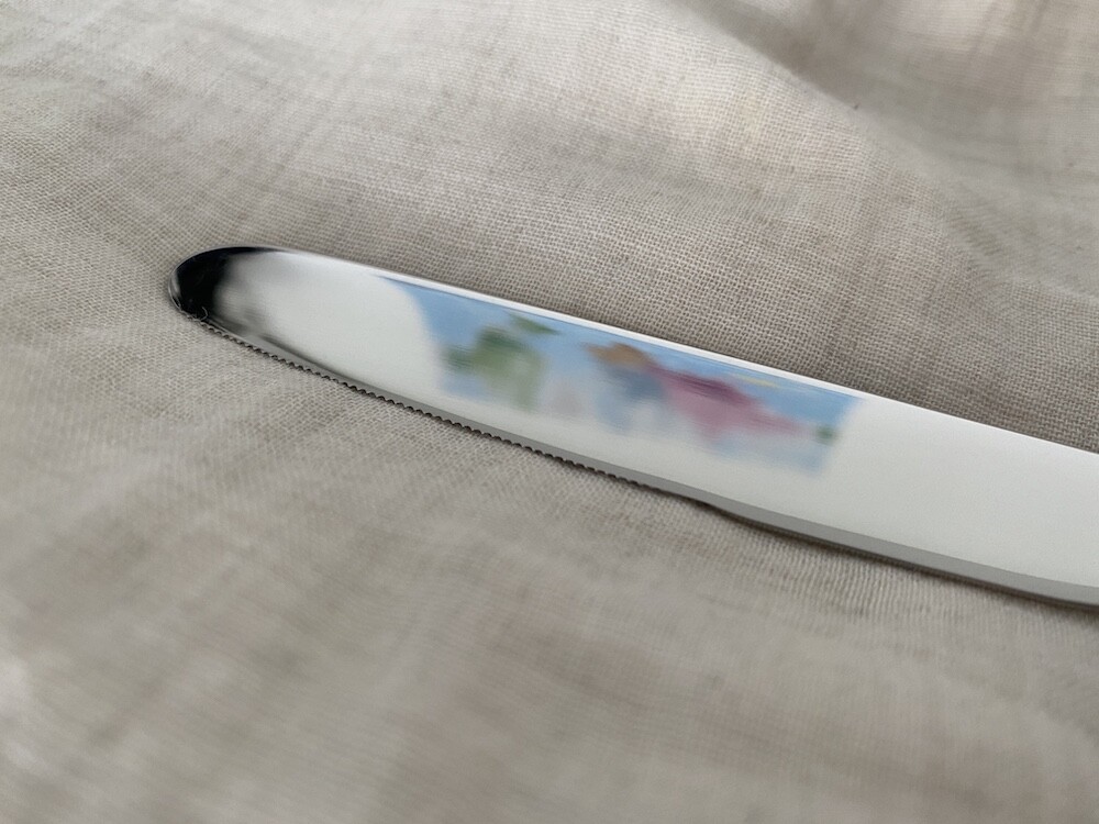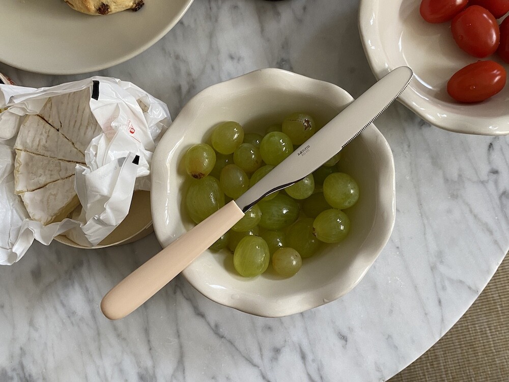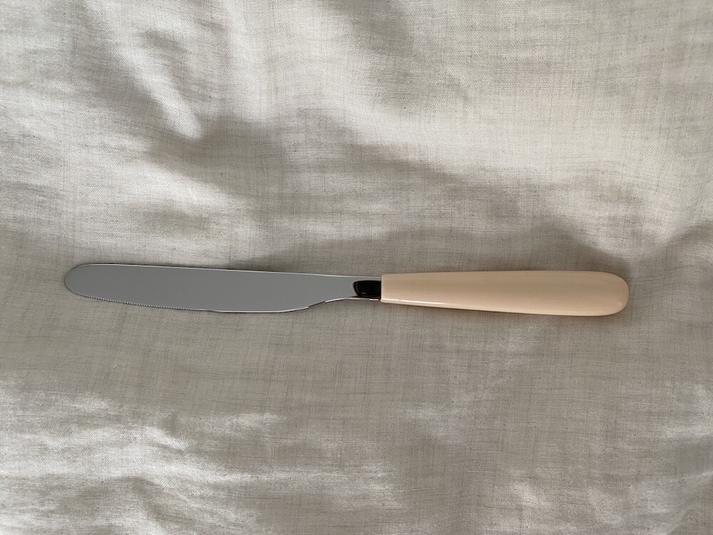 이 올타임 나이프는 스테인리스와 아이보리 손잡이의 조화가 정말 예뻐요. 표기된 손잡이 색상의 이름은 "화이트 아이보리"예요. 예쁘죠? 약간의 주황기가 도는 아이보리색인데, 크림을 아주 많이 섞은 카라멜 소스 같은 느낌이에요. 빵 자를 때, 버터 바를 때 모두 사용하실 수 있고요. 칼 끝에 자잘하게 톱니 모양이 있어서 부드러운 고기도 자르실 수 있을 것 같은데, 질긴 고기를 자르기엔 칼날이 덜 날카로우니 참고하여 사용해 주시면 좋을 것 같아요.