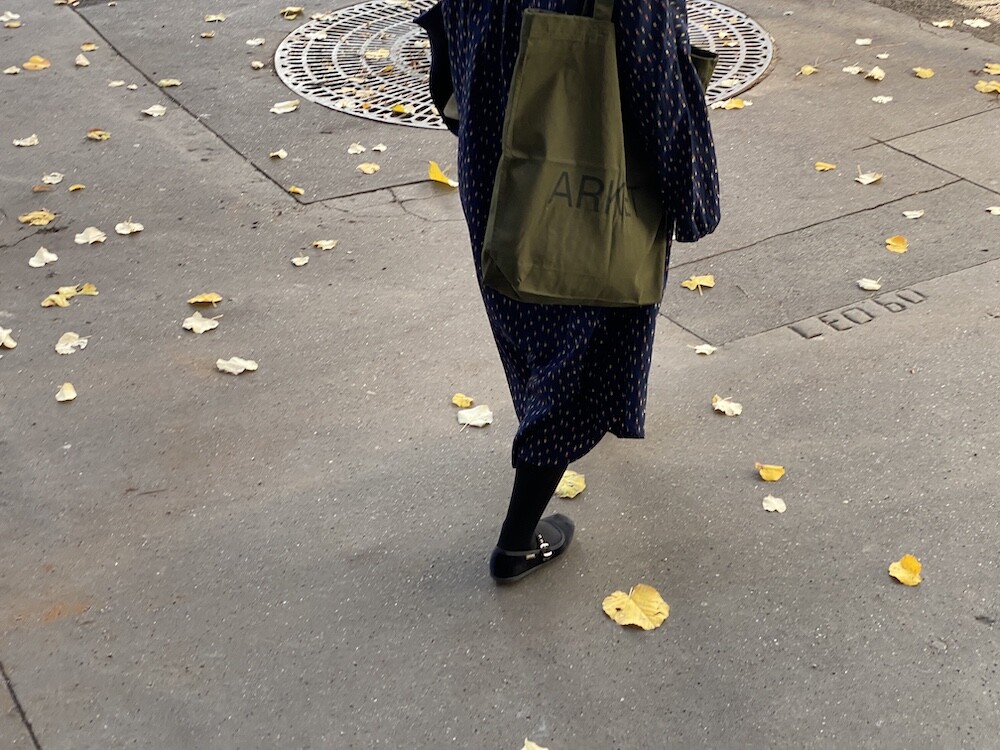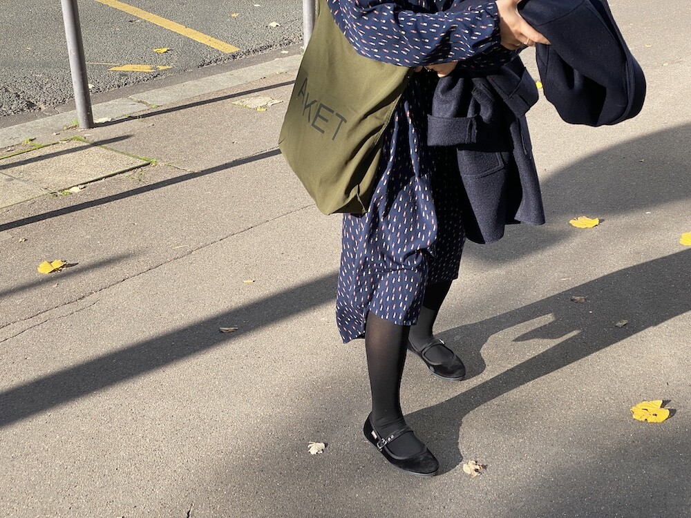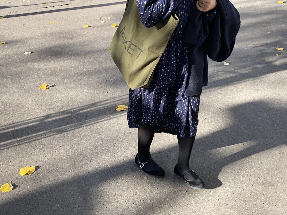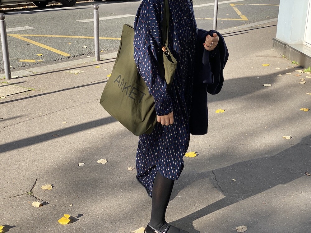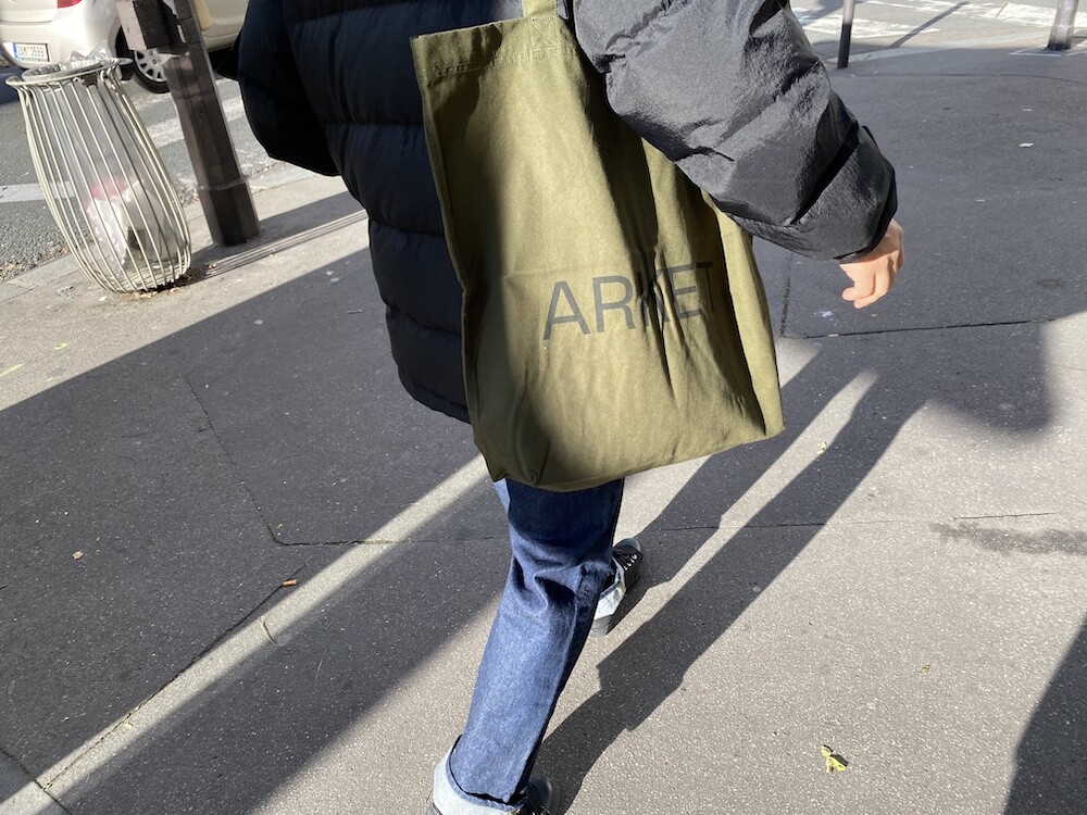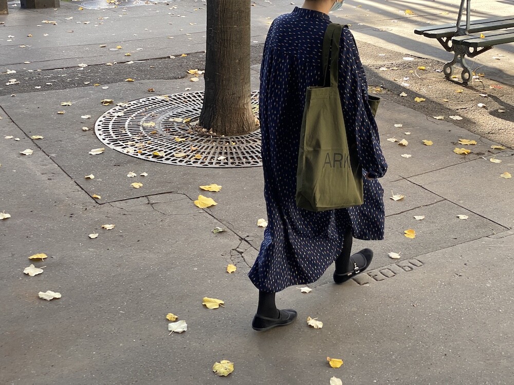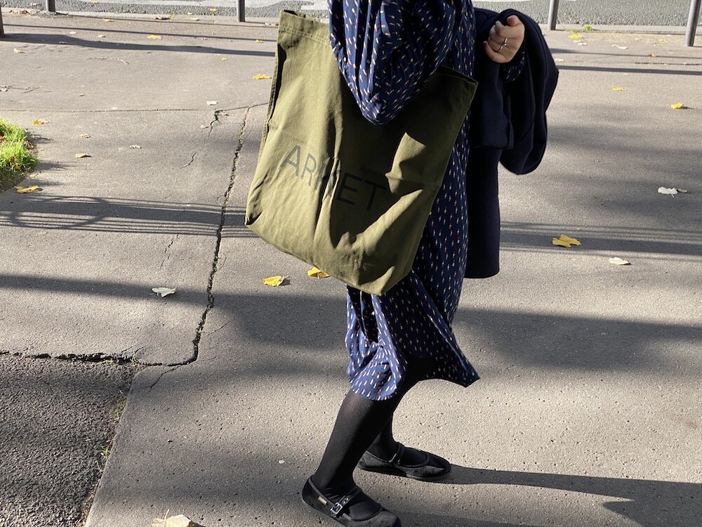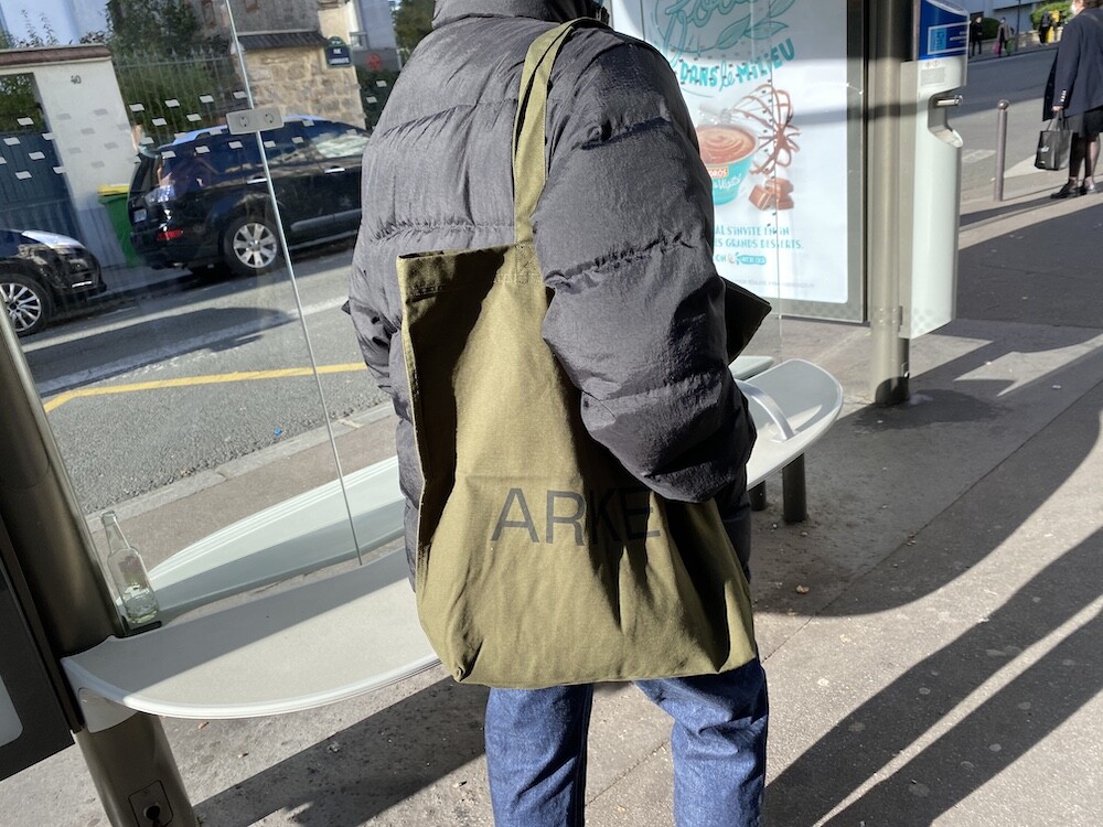 이 에코백의 첫인상은 '군더더기 없는 담백함' 인 것 같아요. 진한 카키색 원단도, 그 위에 프린트된 브랜드명도 꾸밈이 없는데 핫해요. 크기가 넉넉해서 이것저것 많이 들어가고요.