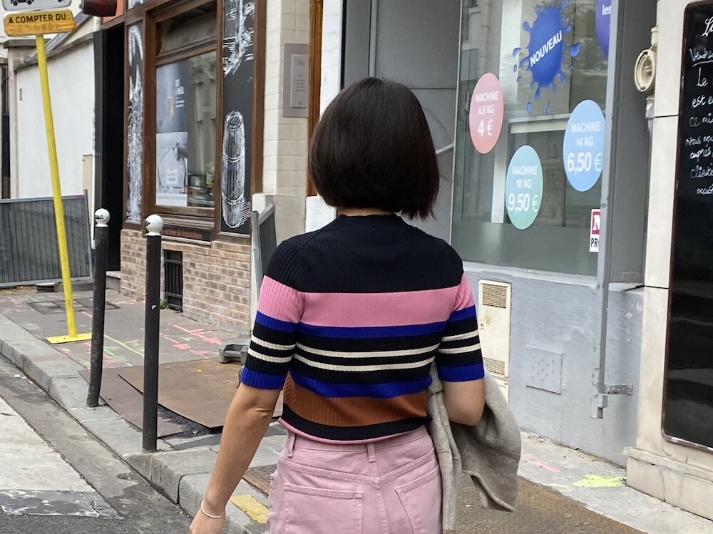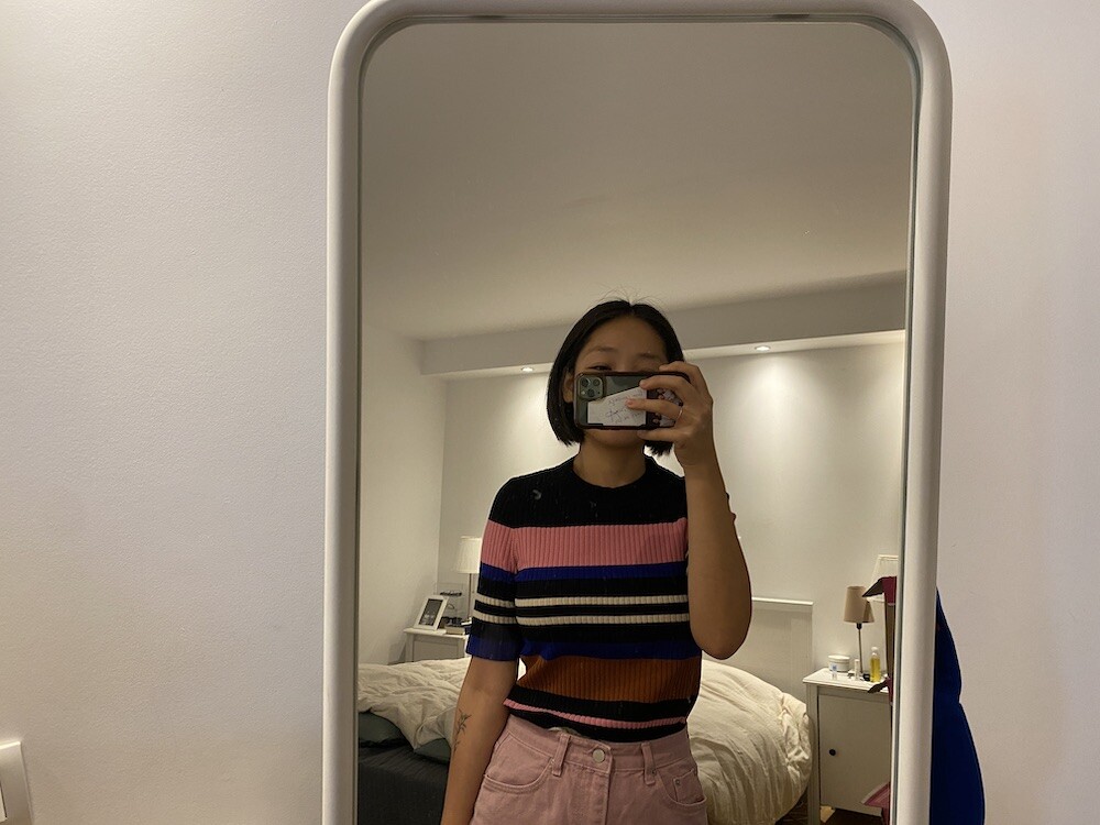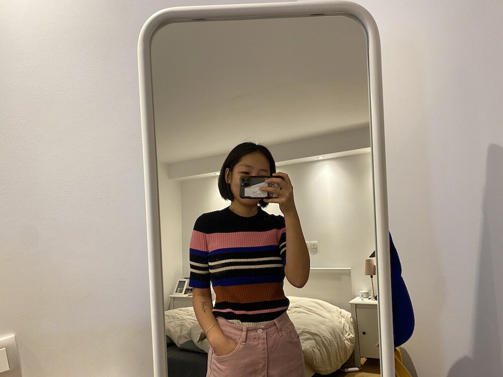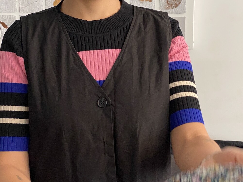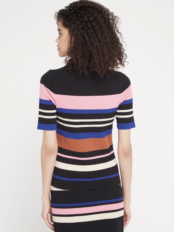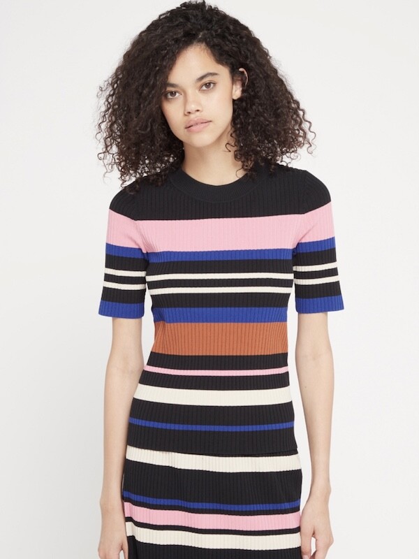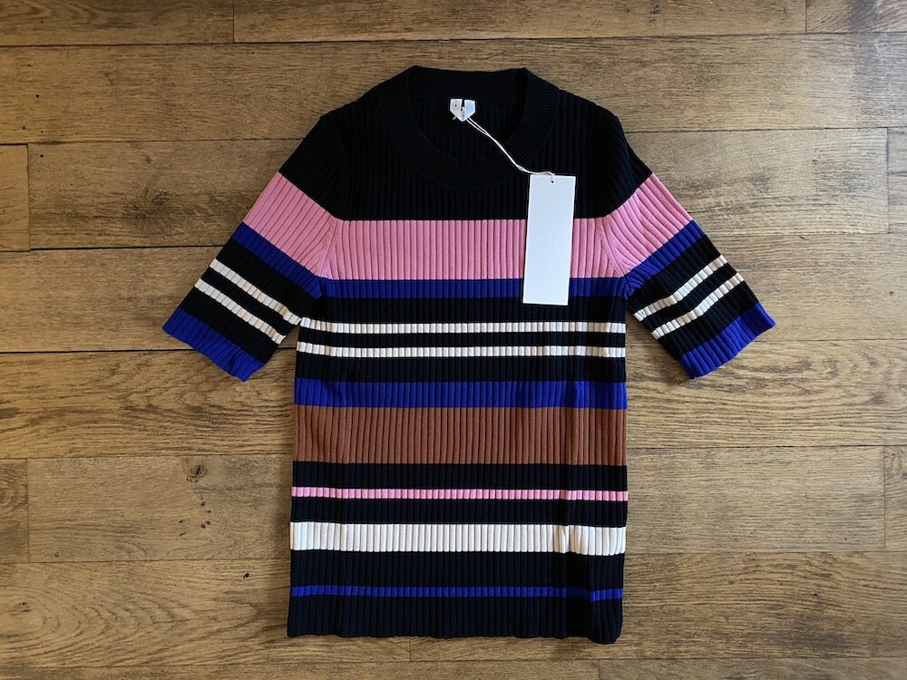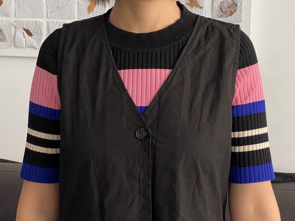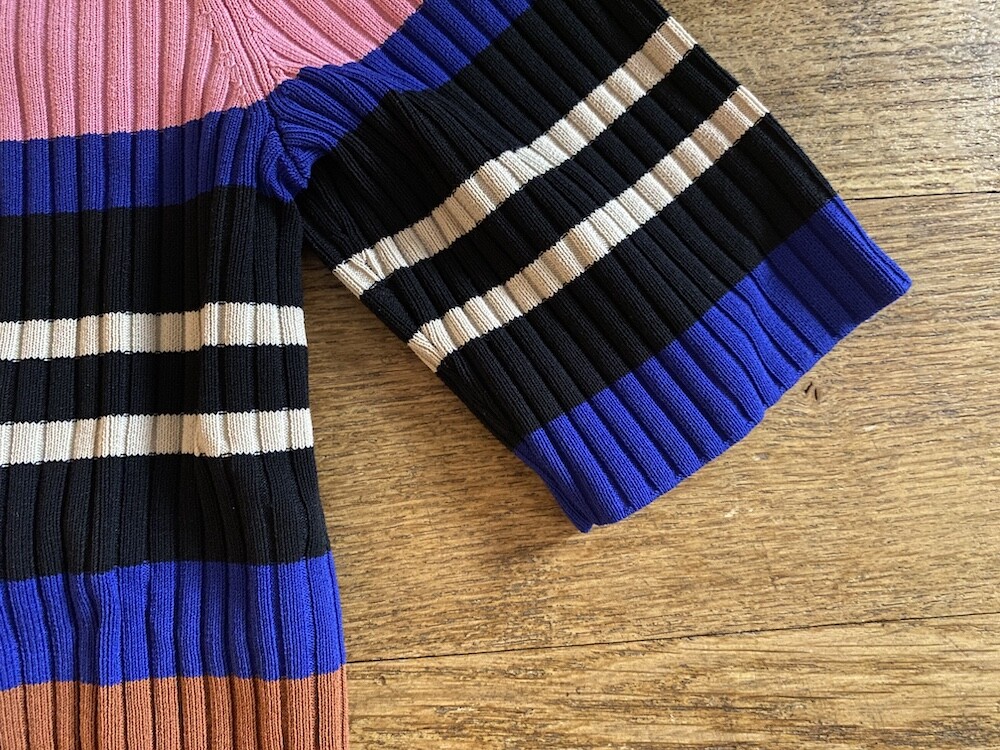 여러가지 색깔의 줄무늬가 예쁜, 쫀쫀한 반팔 니트예요. 전 가을, 겨울에 반팔 니트가 참 편하고 좋더라고요. 그냥 입어도 예쁘지만 두꺼운 니트 안에, 점퍼나 재킷 안에 입기 좋고 원피스와 코디하기도 쉽잖아요. 긴팔 니트는 옷을 여러 겹 겹쳐 입으면 팔이 묵직해서 불편하고 안 예쁜데 반팔 니트는 여기저기 활용하기 좋아요.