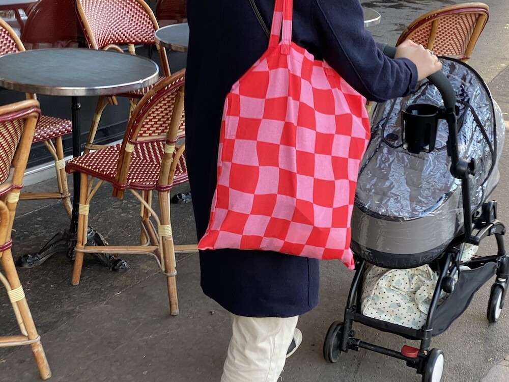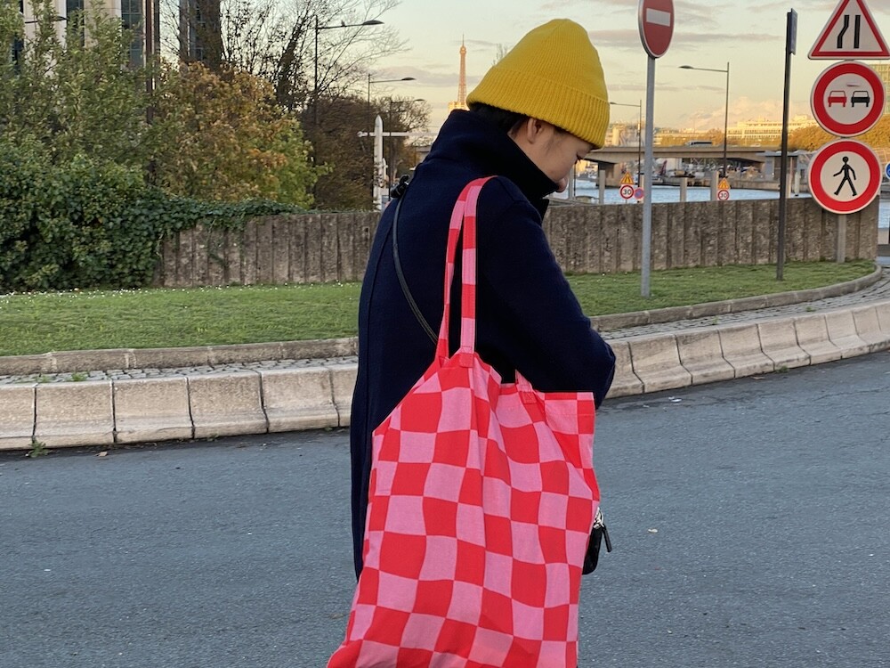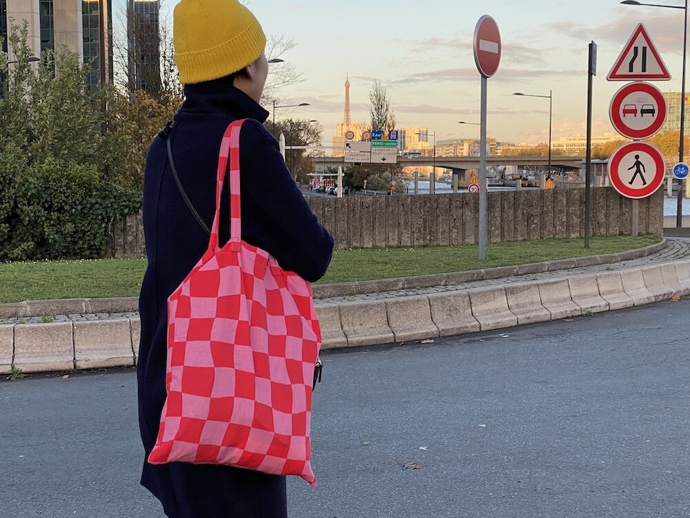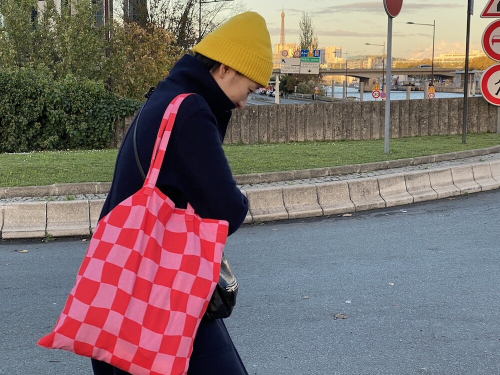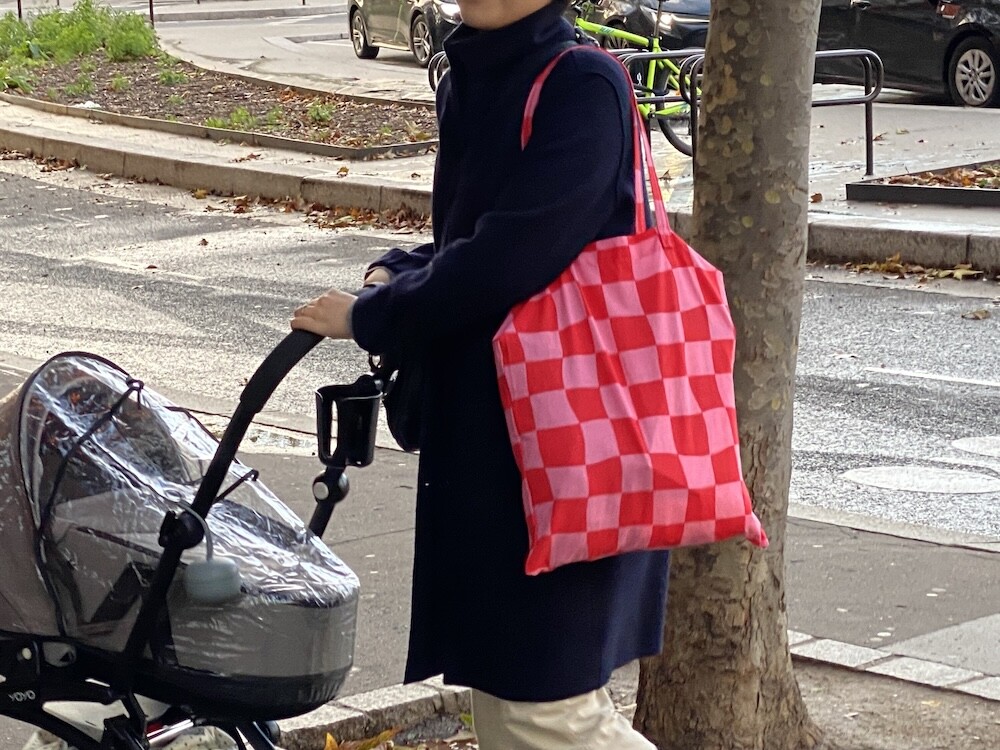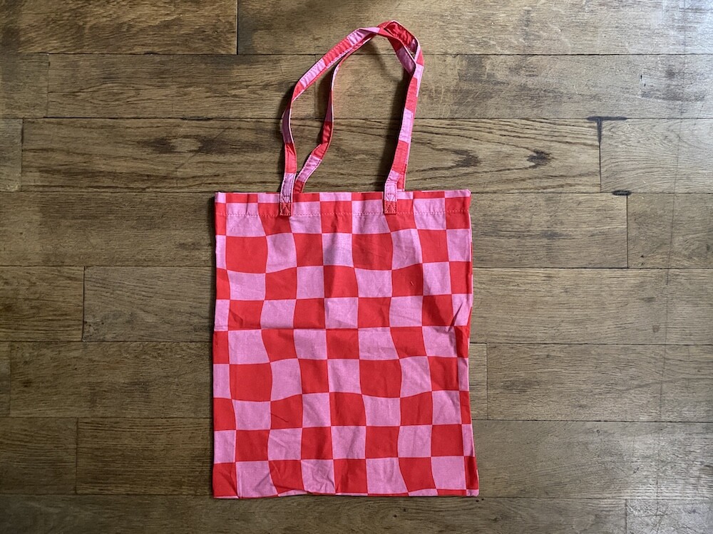 네모 모양의 프린트가 예쁜 에코백이에요. 다미에 패턴이 반듯한 네모가 아니라 구불구불한 선으로 만들어진 네모라 더 예쁜 것 같아요. 특히 빨강과 분홍 색깔이 같이 쓰이는 건 제가 정말 좋아하는 조합이라 좋았고, 끈이 얇아서 디자인적으로도 마음에 들더라고요.