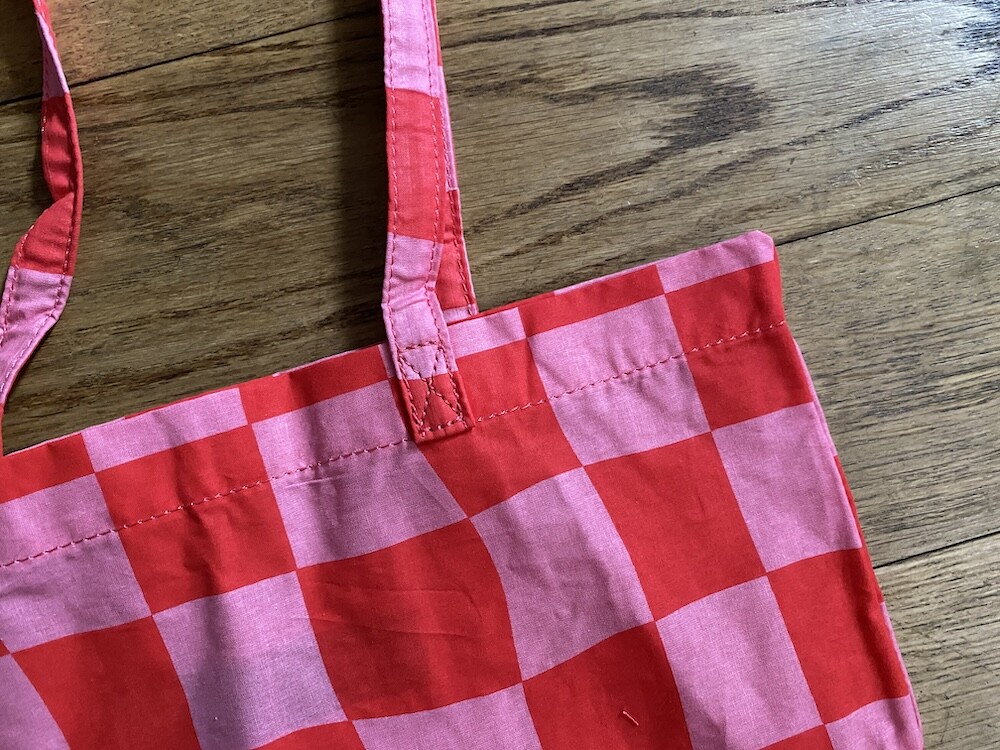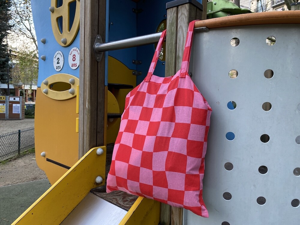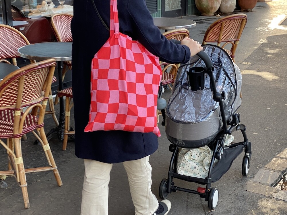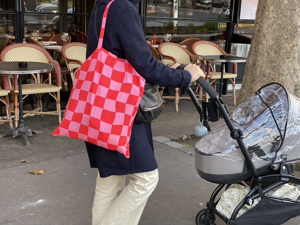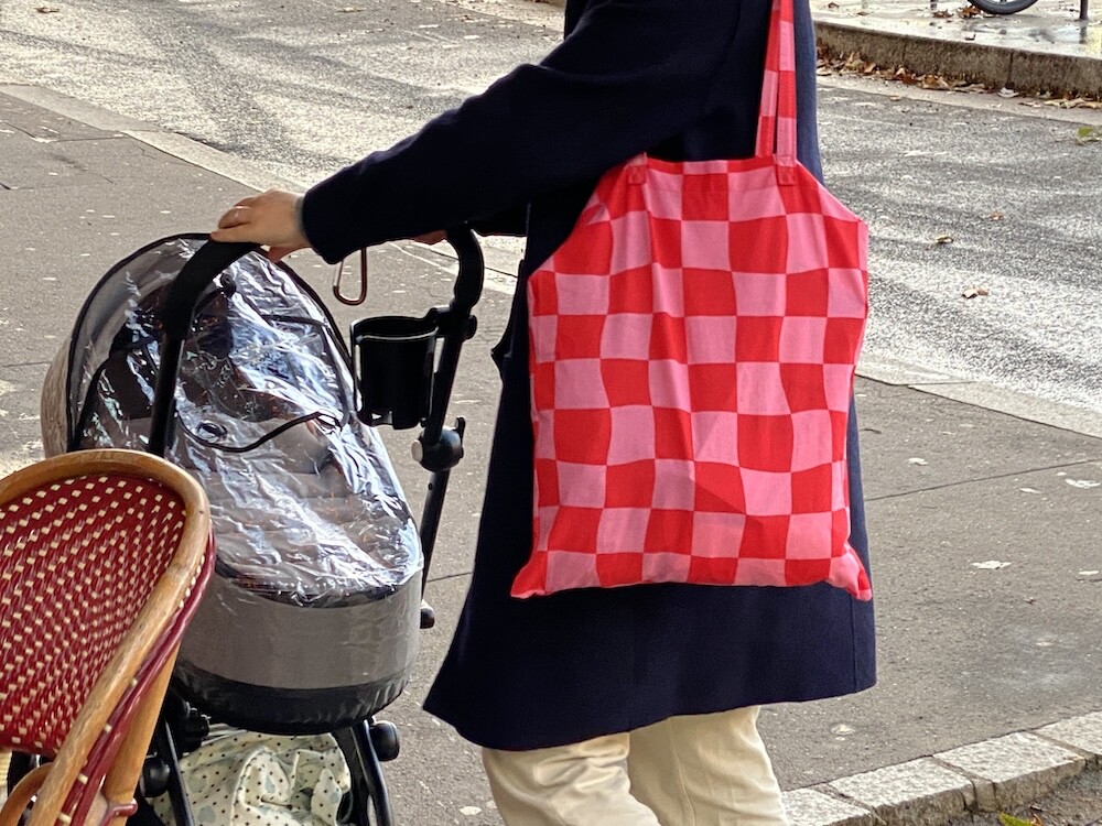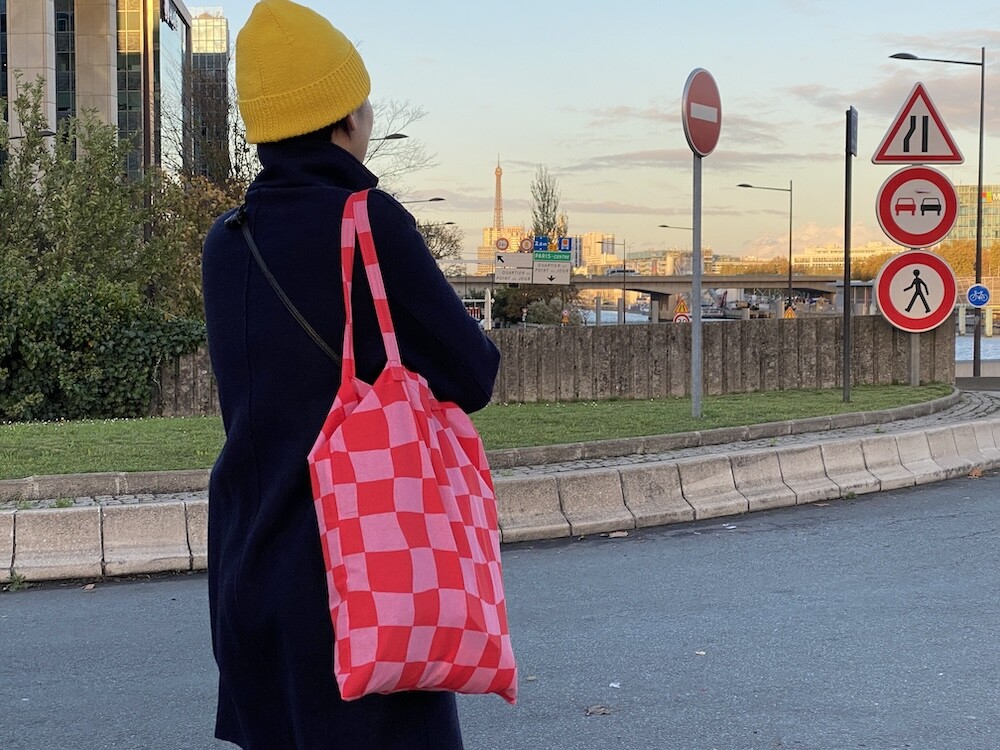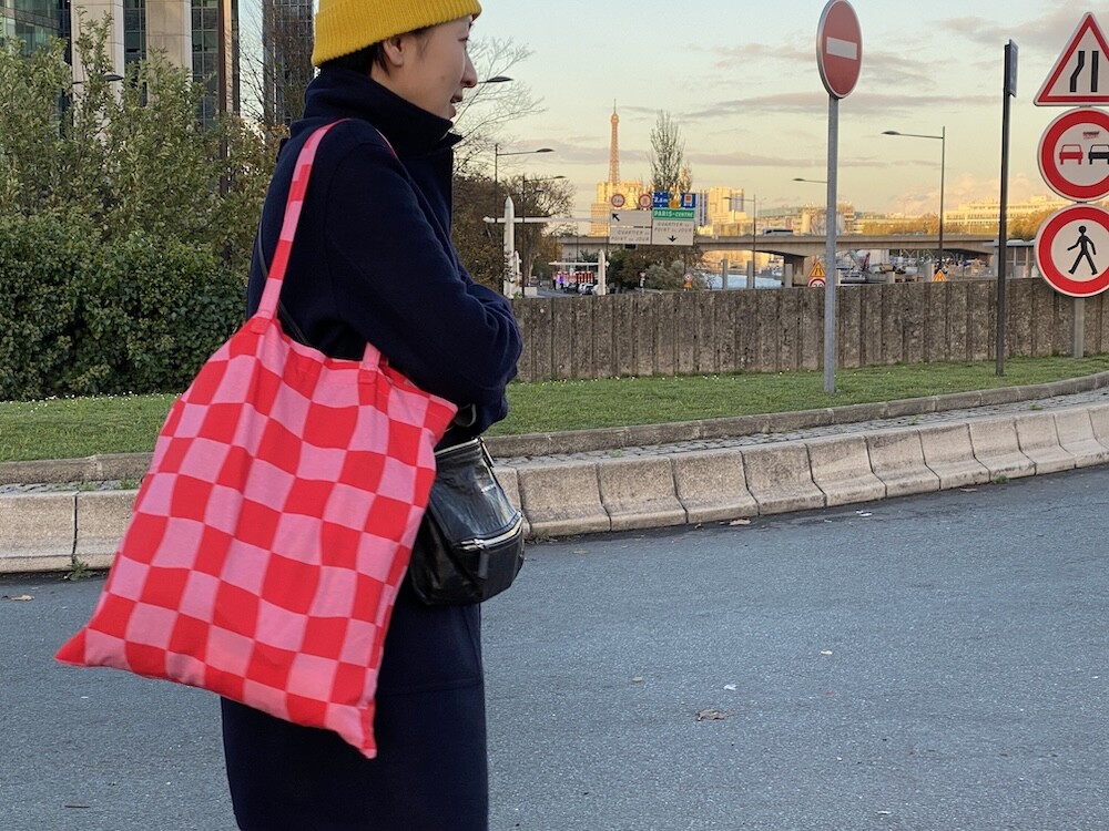 네모 모양의 프린트가 예쁜 에코백이에요. 다미에 패턴이 반듯한 네모가 아니라 구불구불한 선으로 만들어진 네모라 더 예쁜 것 같아요. 특히 빨강과 분홍 색깔이 같이 쓰이는 건 제가 정말 좋아하는 조합이라 좋았고, 끈이 얇아서 디자인적으로도 마음에 들더라고요.