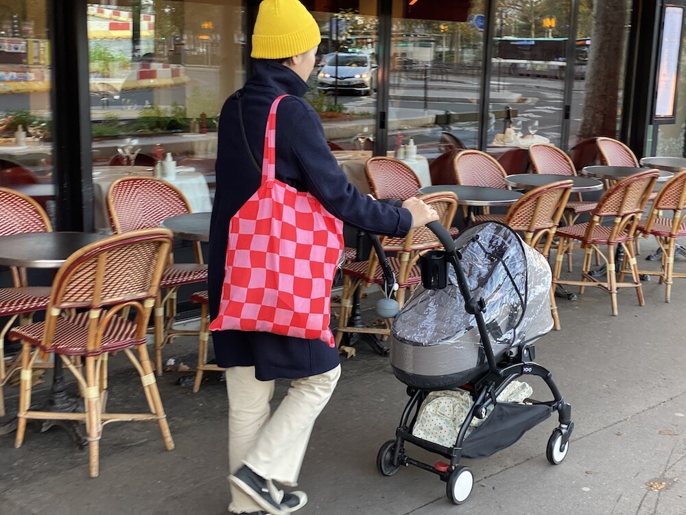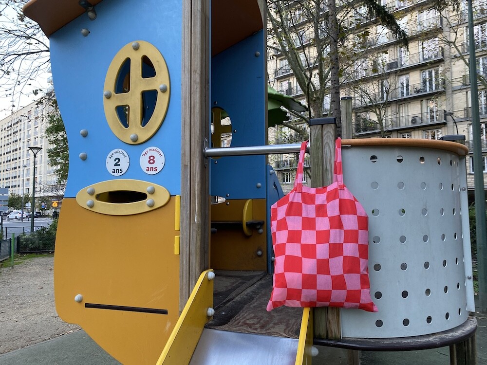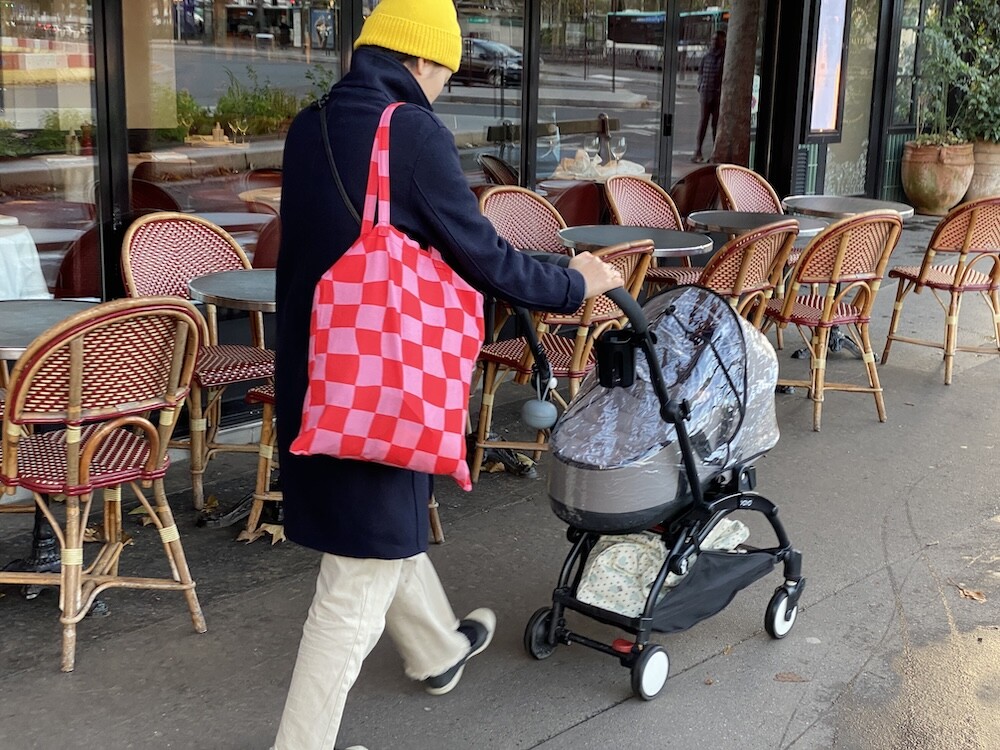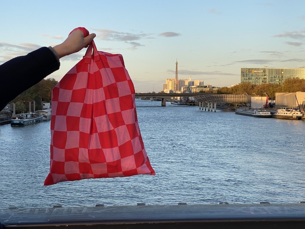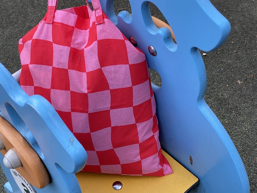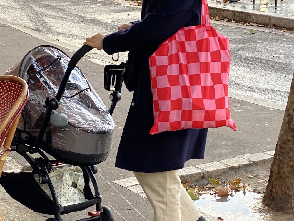 네모 모양의 프린트가 예쁜 에코백이에요. 다미에 패턴이 반듯한 네모가 아니라 구불구불한 선으로 만들어진 네모라 더 예쁜 것 같아요. 특히 빨강과 분홍 색깔이 같이 쓰이는 건 제가 정말 좋아하는 조합이라 좋았고, 끈이 얇아서 디자인적으로도 마음에 들더라고요.