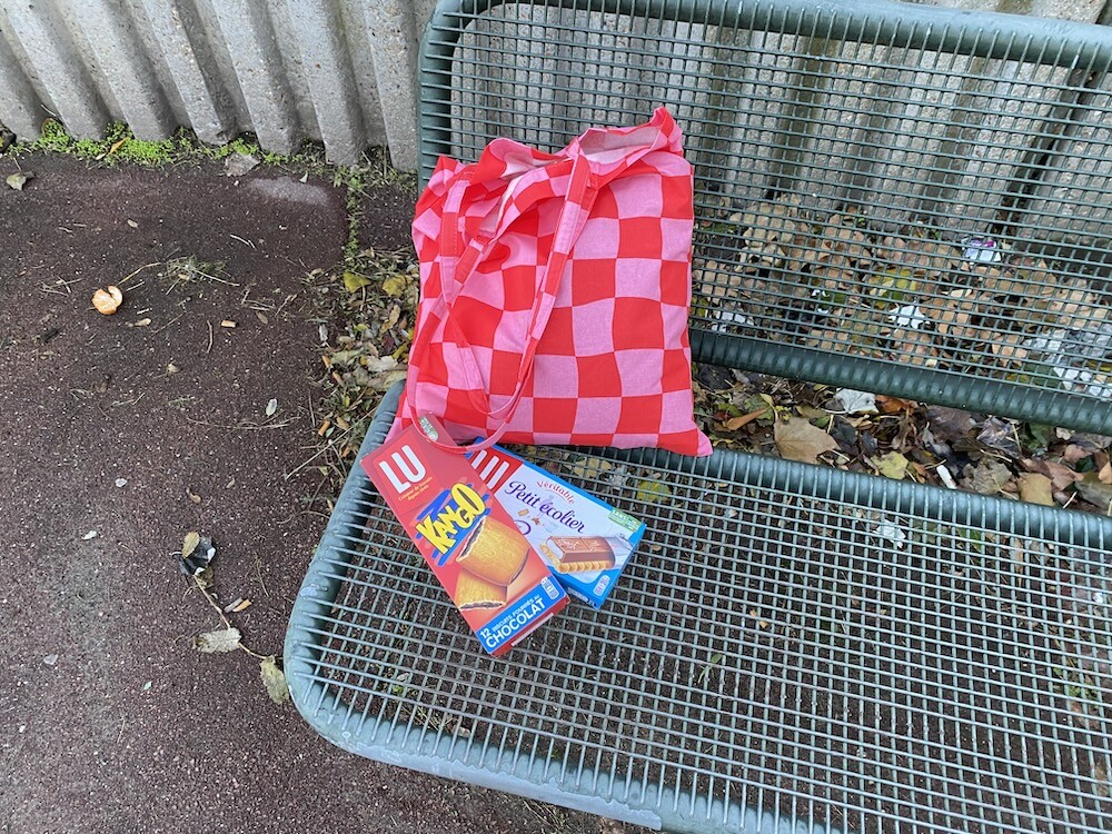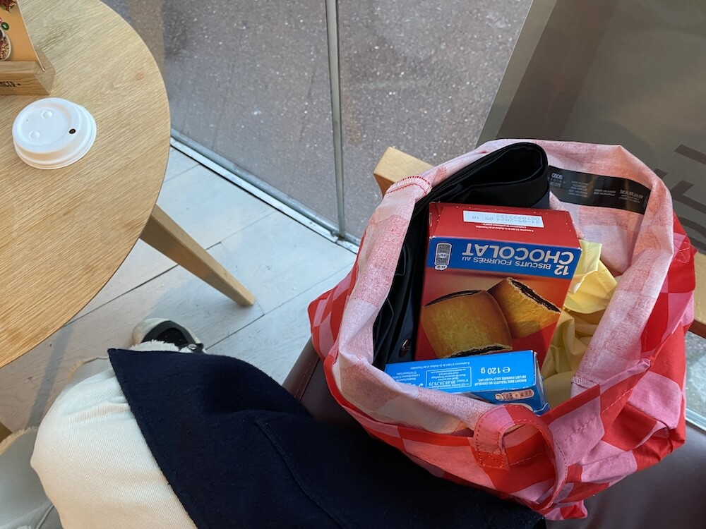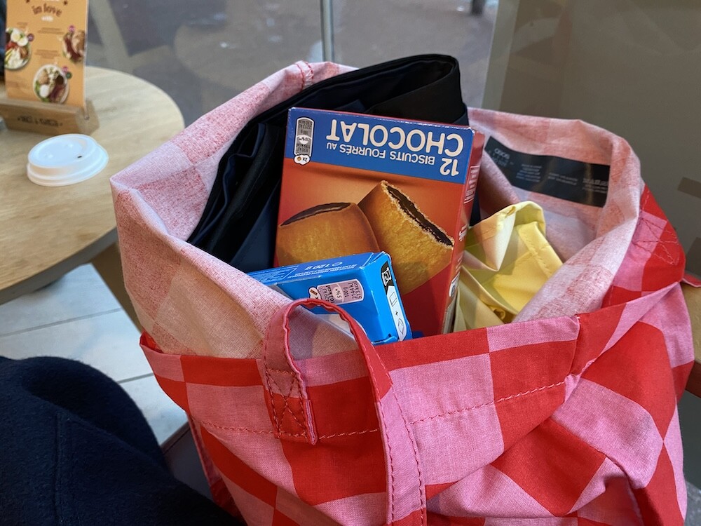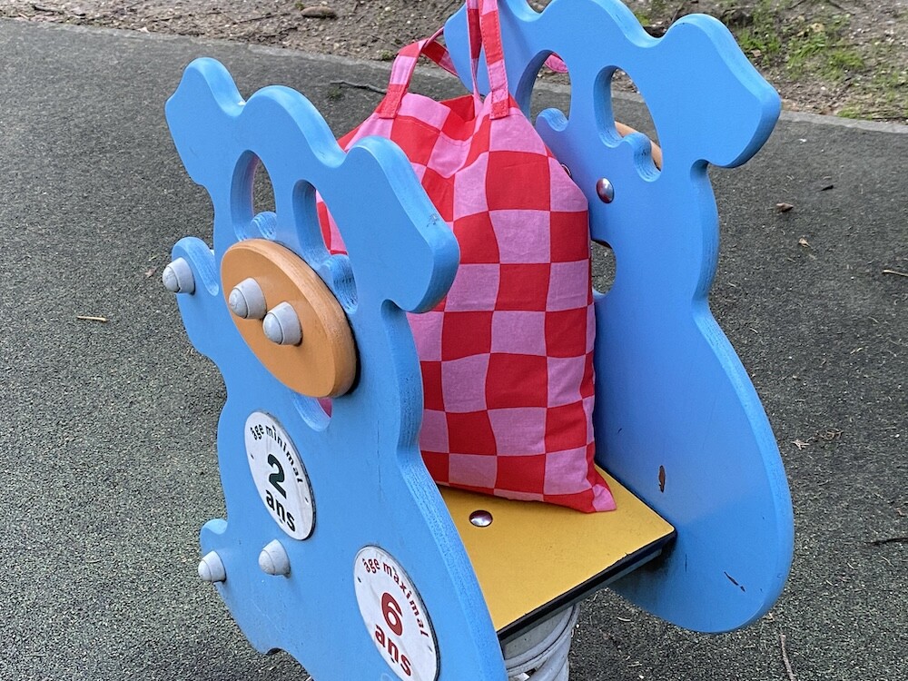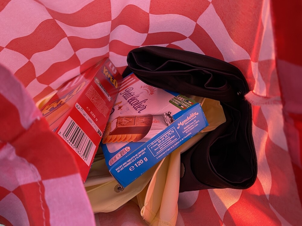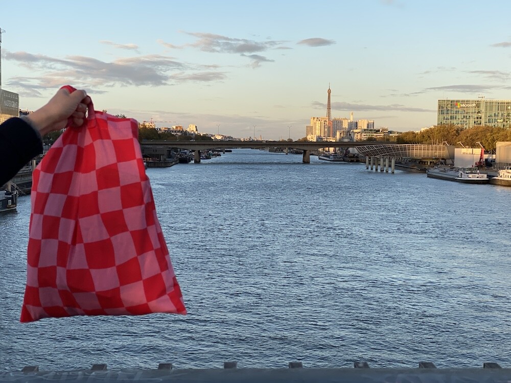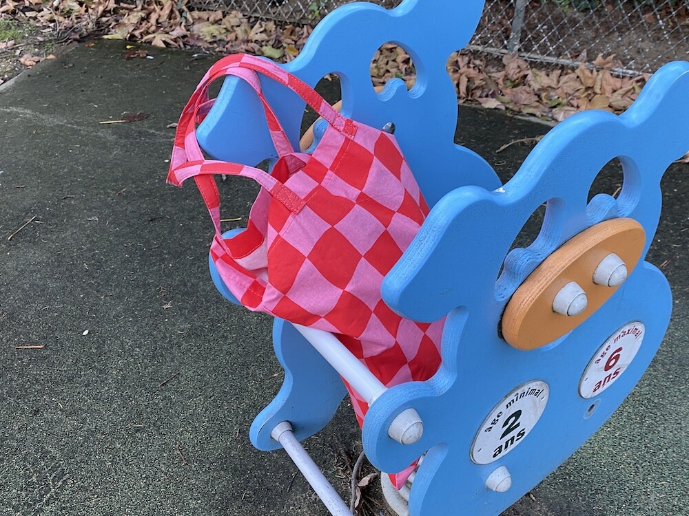 네모 모양의 프린트가 예쁜 에코백이에요. 다미에 패턴이 반듯한 네모가 아니라 구불구불한 선으로 만들어진 네모라 더 예쁜 것 같아요. 특히 빨강과 분홍 색깔이 같이 쓰이는 건 제가 정말 좋아하는 조합이라 좋았고, 끈이 얇아서 디자인적으로도 마음에 들더라고요.