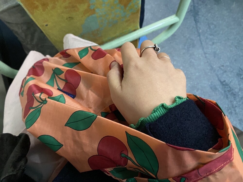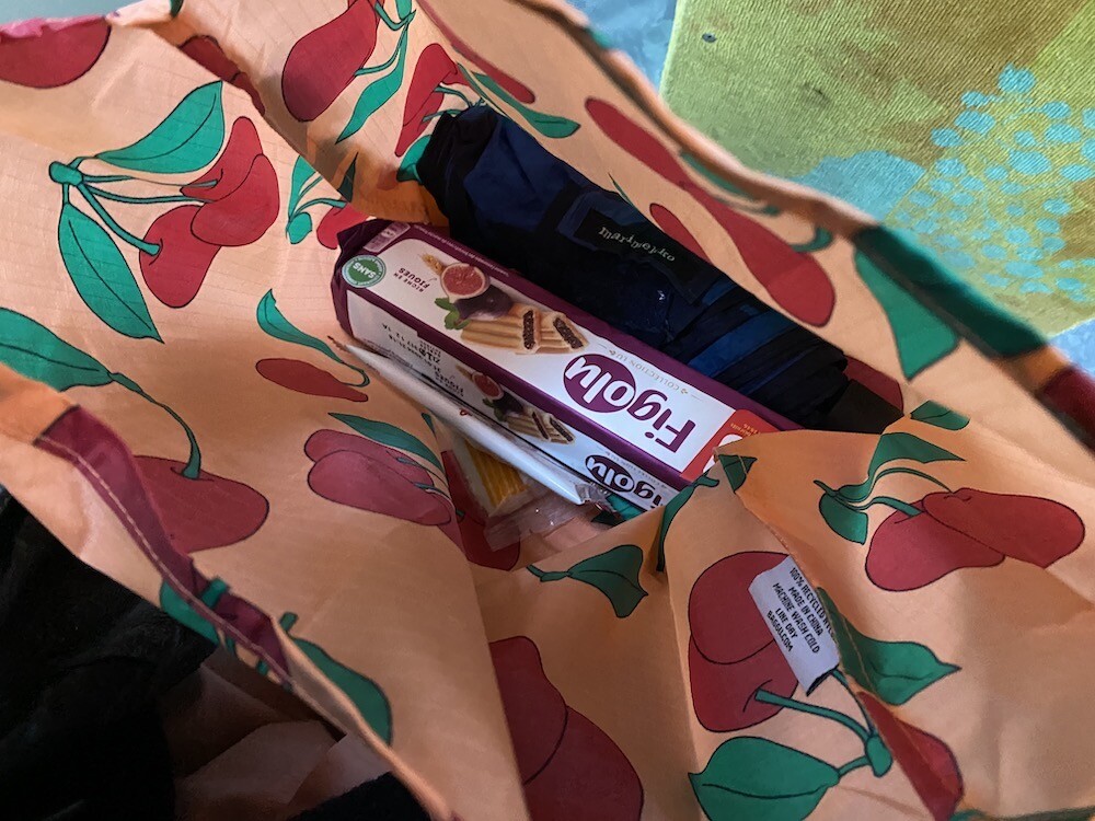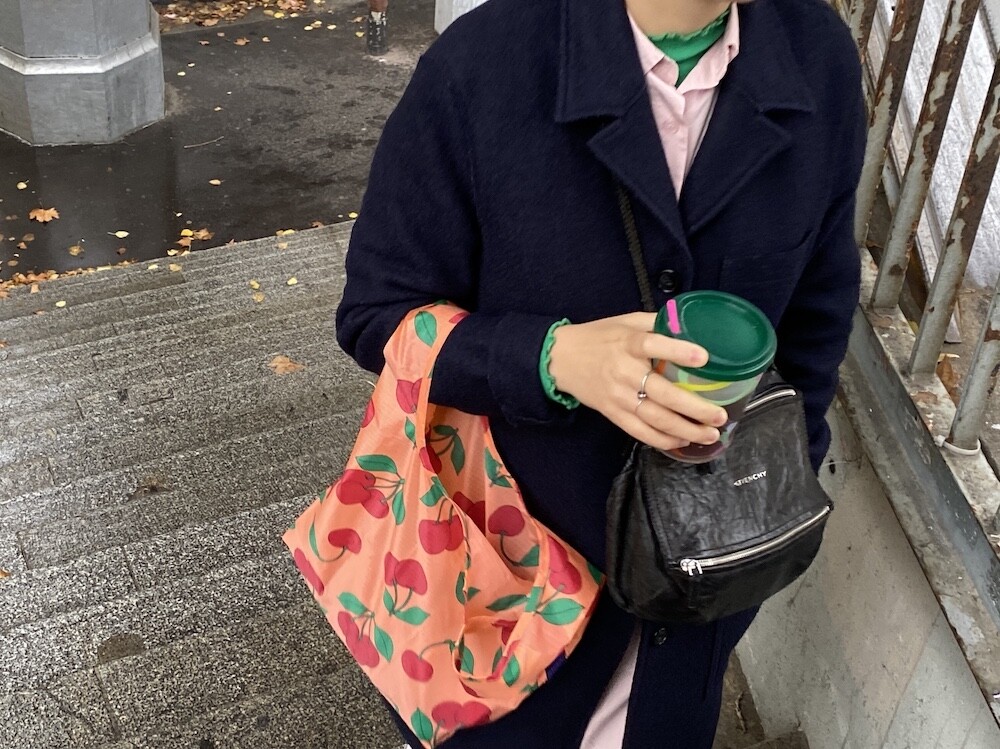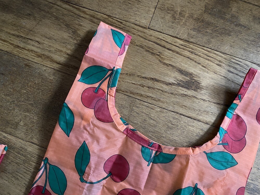 체리 그림이 귀엽게 그려진 장바구니예요. 바탕의 연어색깔도 예쁘고 체리의 빨강과 초록도 귀여워요. 이 가방을 들고 나갔던 날 갑자기 비가 많이 내렸는데 안의 내용물이 거의 젖지 않았더라고요. 탄탄한 나일론 소재라 생활 방수가 충분히 가능한 것 같아요. 작은 주머니 안에 가방이 들어 있어서 필요할 때 꺼내서 쓸 수 있고, 주머니는 따로 작은 물건들을 담아 다니기에도 좋을 것 같아요.