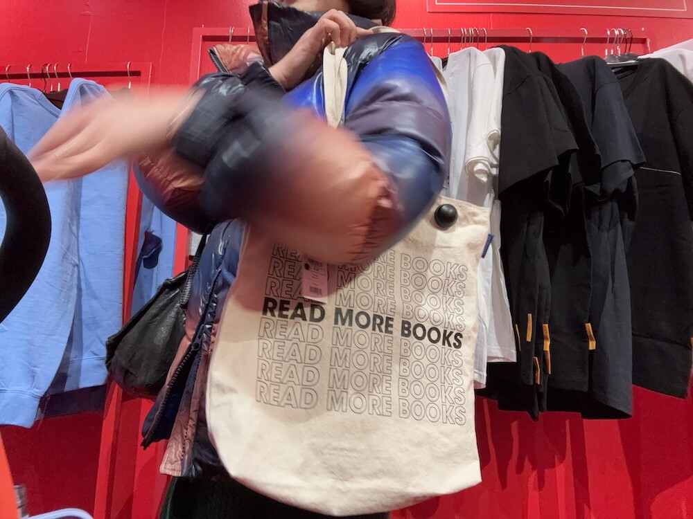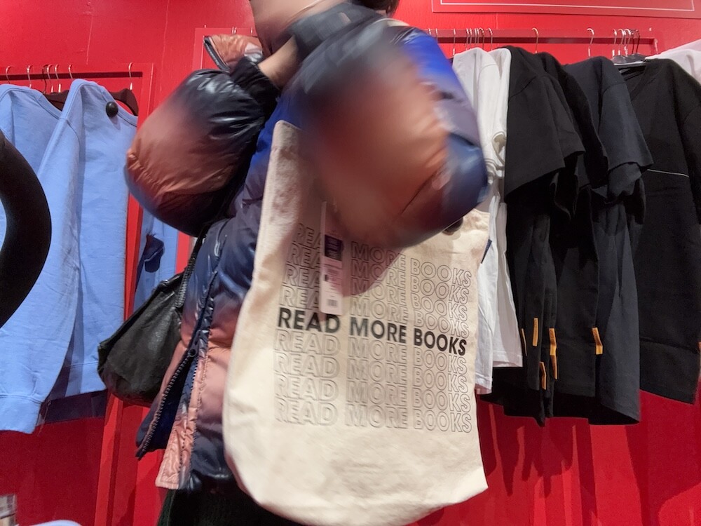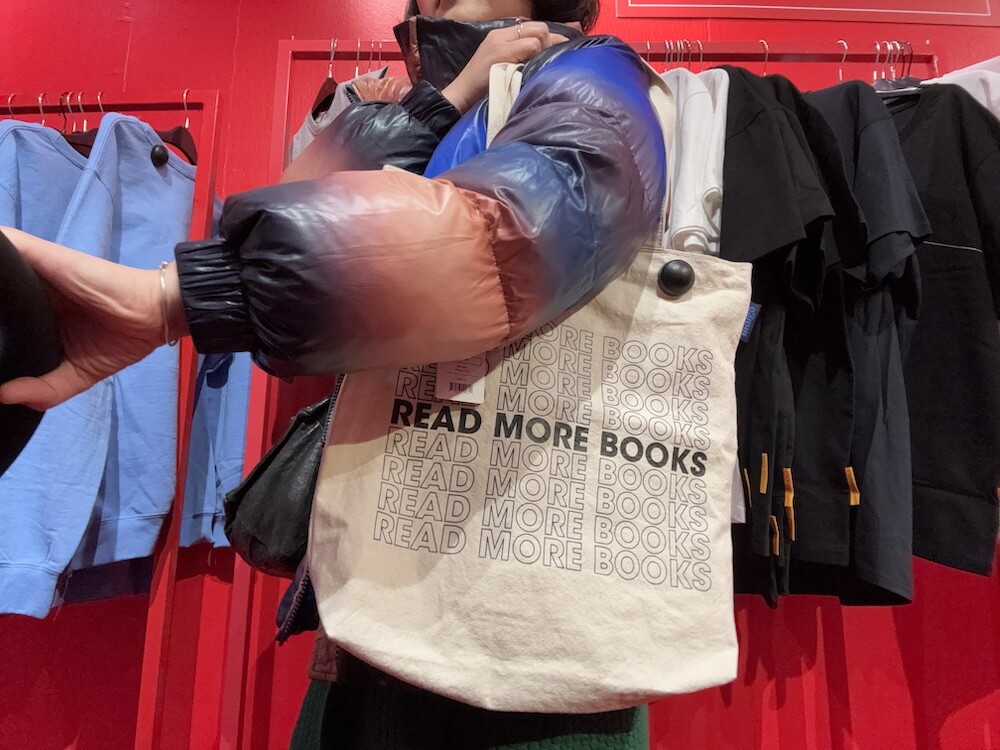 리드 모어 북스 Read More Books라는 글씨가 여러 줄 새겨진 에코백입니다. 왠지 이 가방을 사용하는 사람을 보면 책을 많이 읽는 사람이구나 싶은 생각이 들 것 같아요. 글씨체도 깔끔해서 예쁘고 박음질이 잘 되어 있어서 단정한 느낌이 나네요.