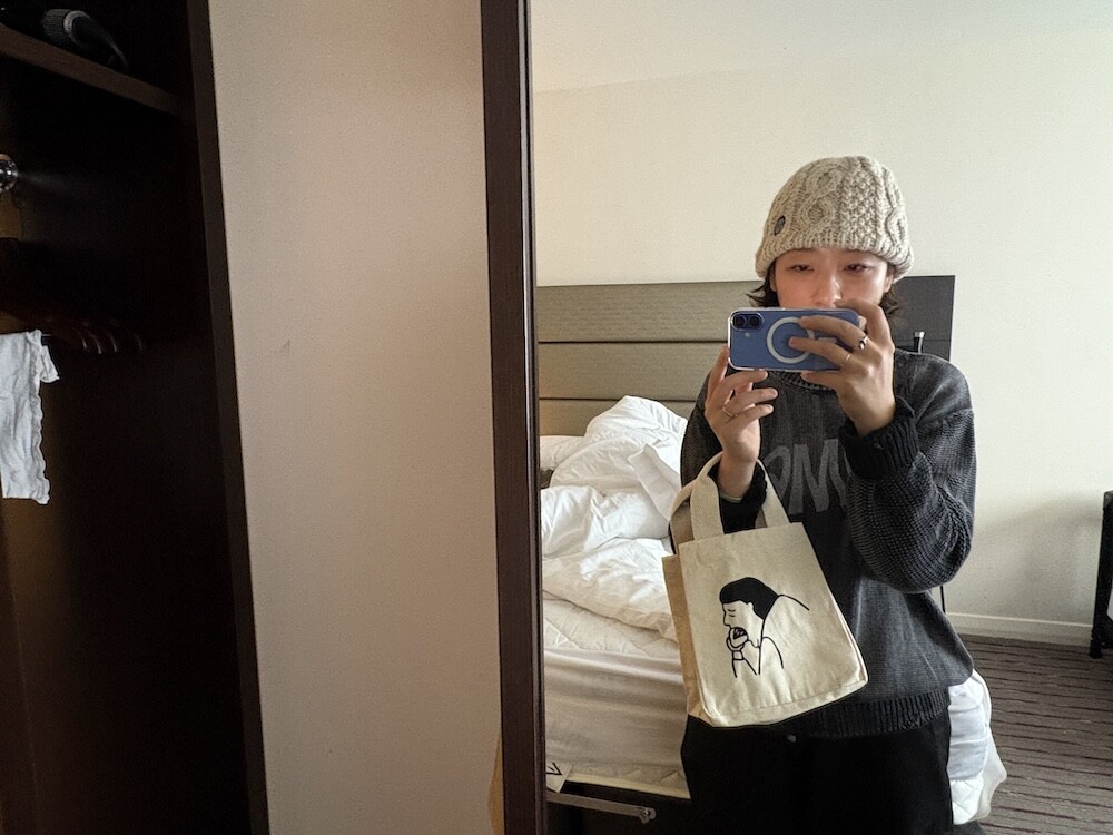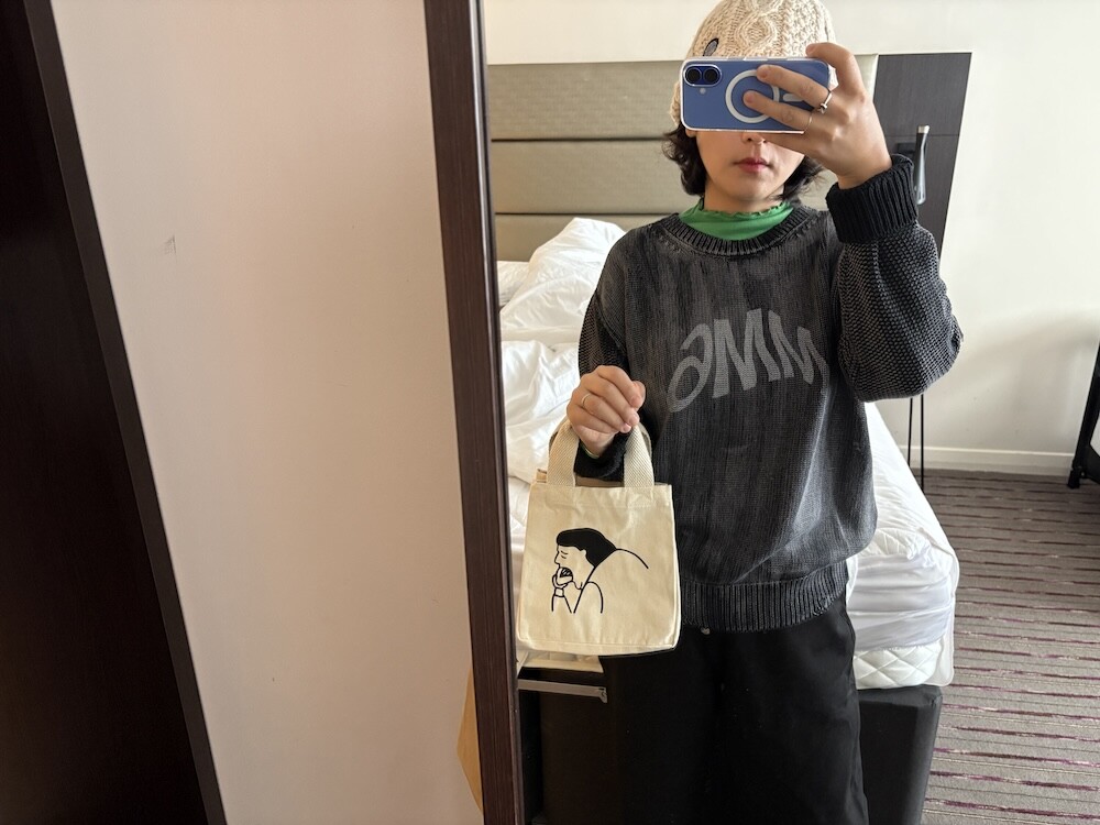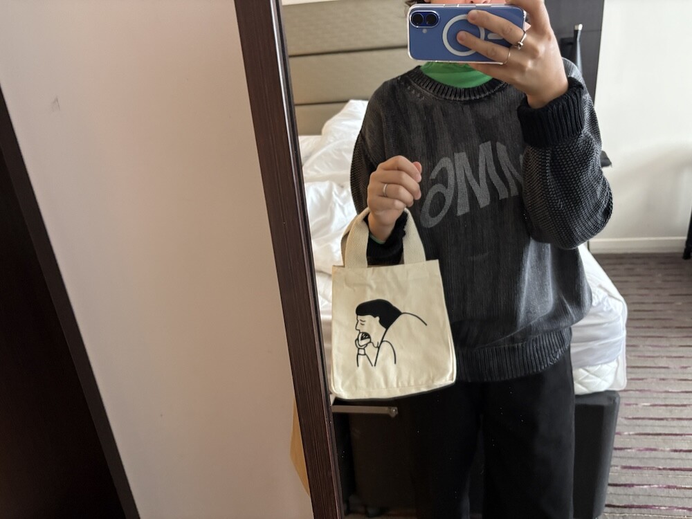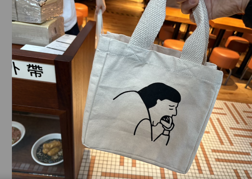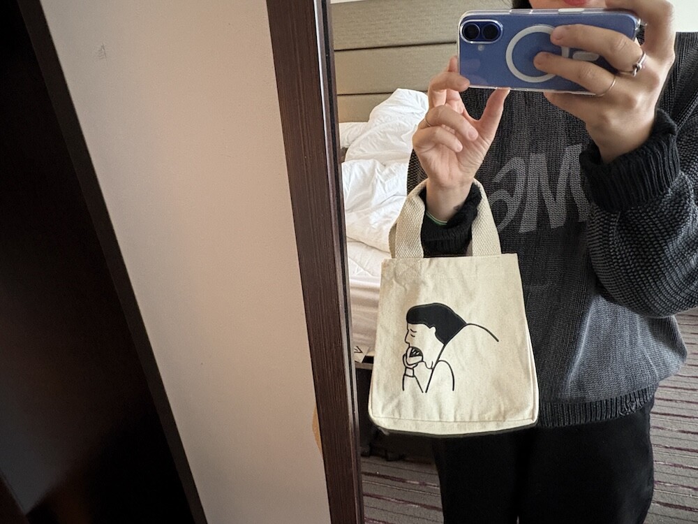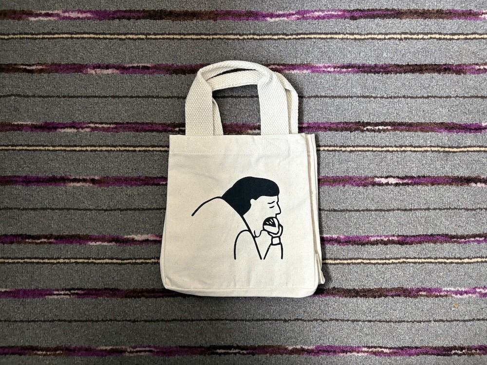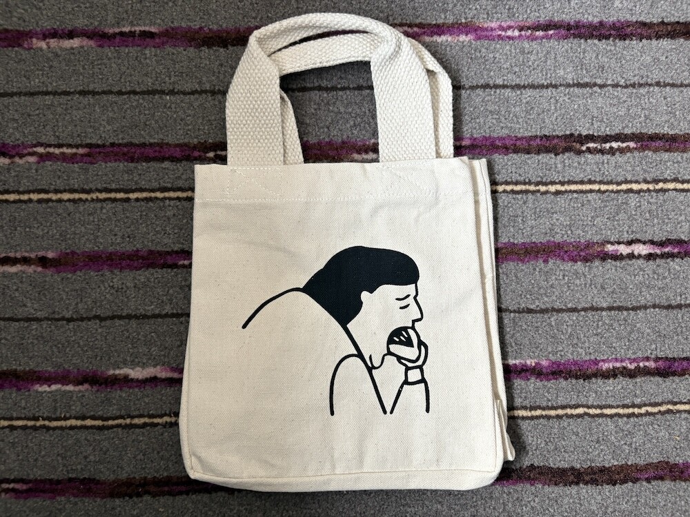 탄탄한 면 원단의 작은 가방이에요. 손목에 걸고 다니시기 좋은 사이즈로, 앞면에 바오를 먹는 사람이 재미있게 그려져 있어요. 뒷면은 아무 모양도 없는 무지이니, 혹시 그림이 안 보이게 들고 싶으신 날에는 반대면으로 들고 다니셔도 좋을 거예요. 안쪽에는 열쇠 고리를 걸 수 있는 고리가 있어서 중요한 물건들은 고리에 걸고 다니실 수도 있을 것 같아요.