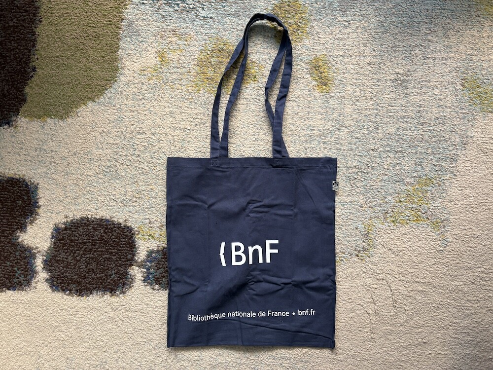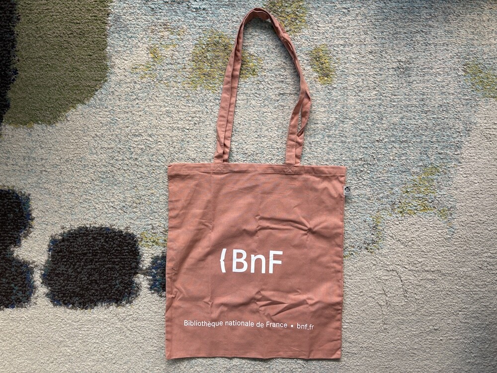 프랑스 국립 도서관의 이름이 씌여진 가방입니다. 깔끔한 글씨체와 예쁜 색깔 때문에 보자마자 마음에 쏙 들었어요. 특히 이 가방은 보통의 에코백들과는 달리 끈이 얇아서 세련된 매력이 있어요.