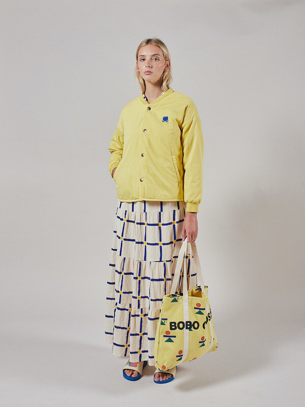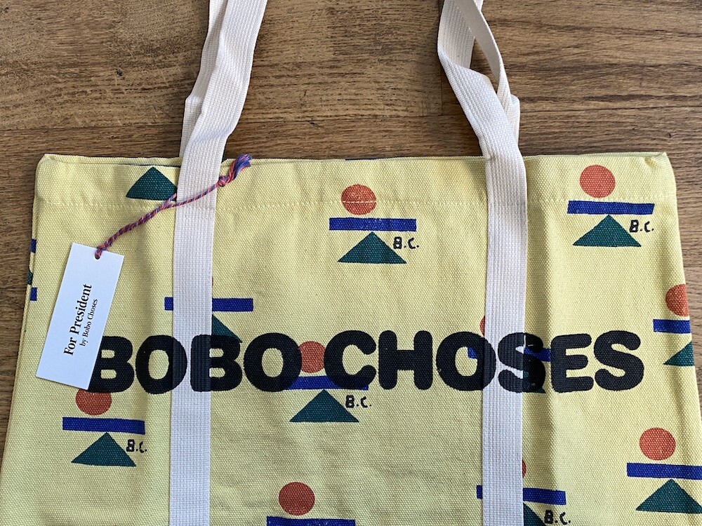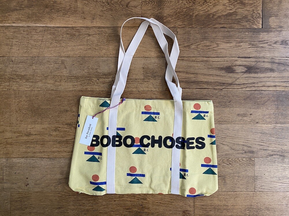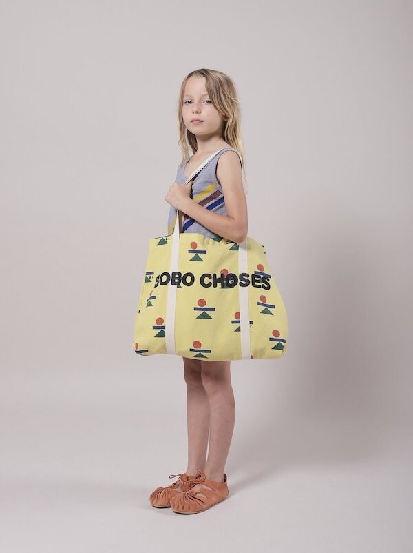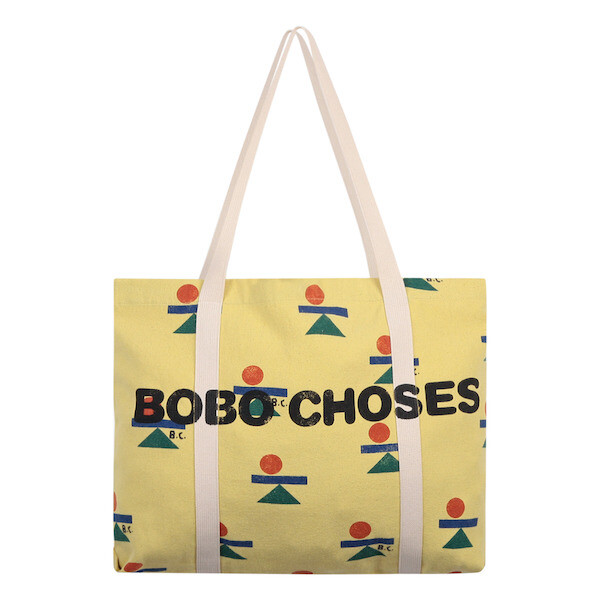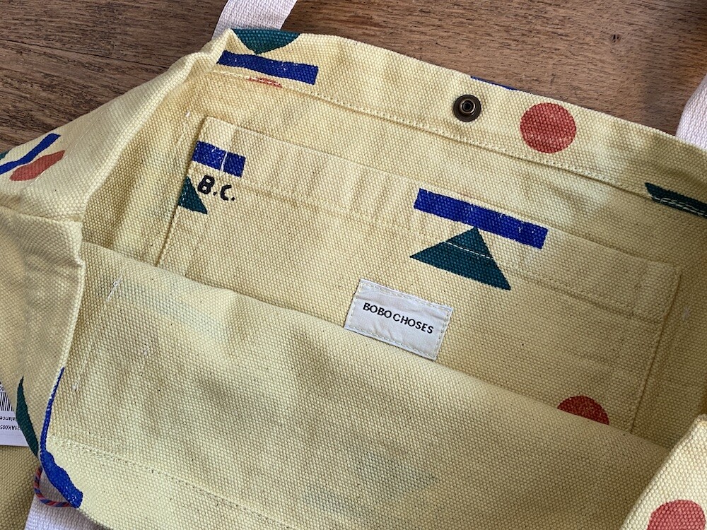 도톰한 노란색 면 원단 위에 기하학 무늬가 프린트된 귀여운 에코백이에요. 블록을 연상시키는 그림들도 귀엽고, 둥글둥글한 느낌의 BOBO CHOSES라는 글씨도 귀여워요. 안쪽에는 큼지막한 내부 주머니가 따로 있어서 물건들을 나눠 담기에 좋고 입구 부분에는 똑딱이 마감이 되어 있어 가방이 열리지 않게 멜 수 있어요. 특히 가방 모양이 직사각형이 아닌 사다리꼴 모양이라 더욱 독특해요.