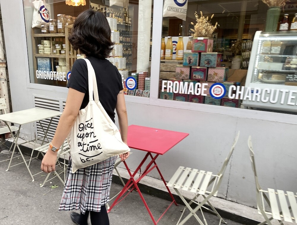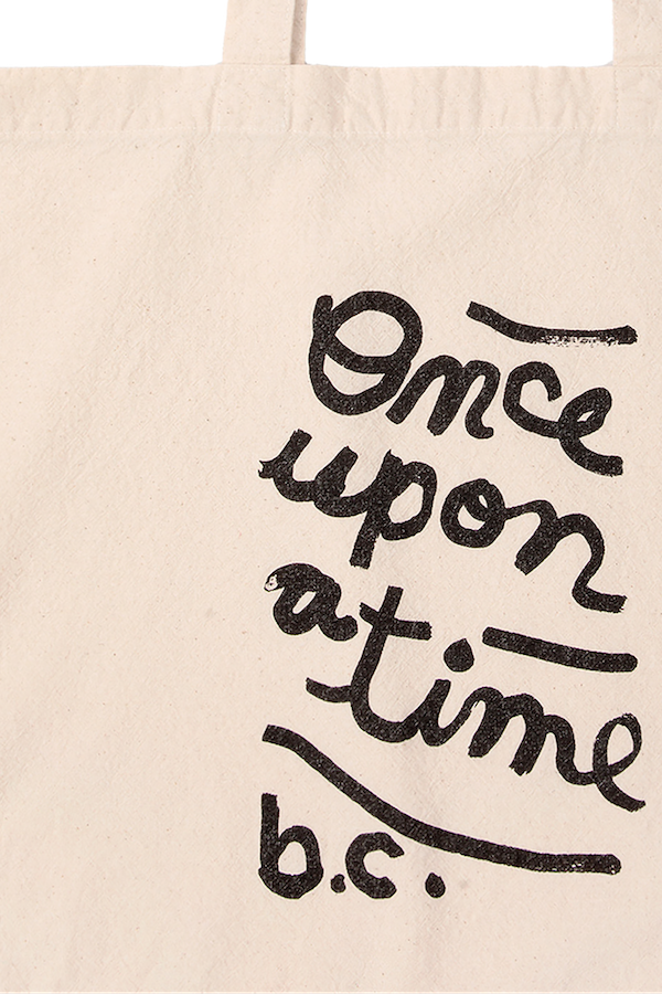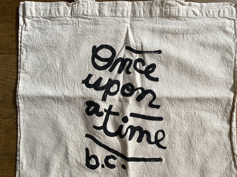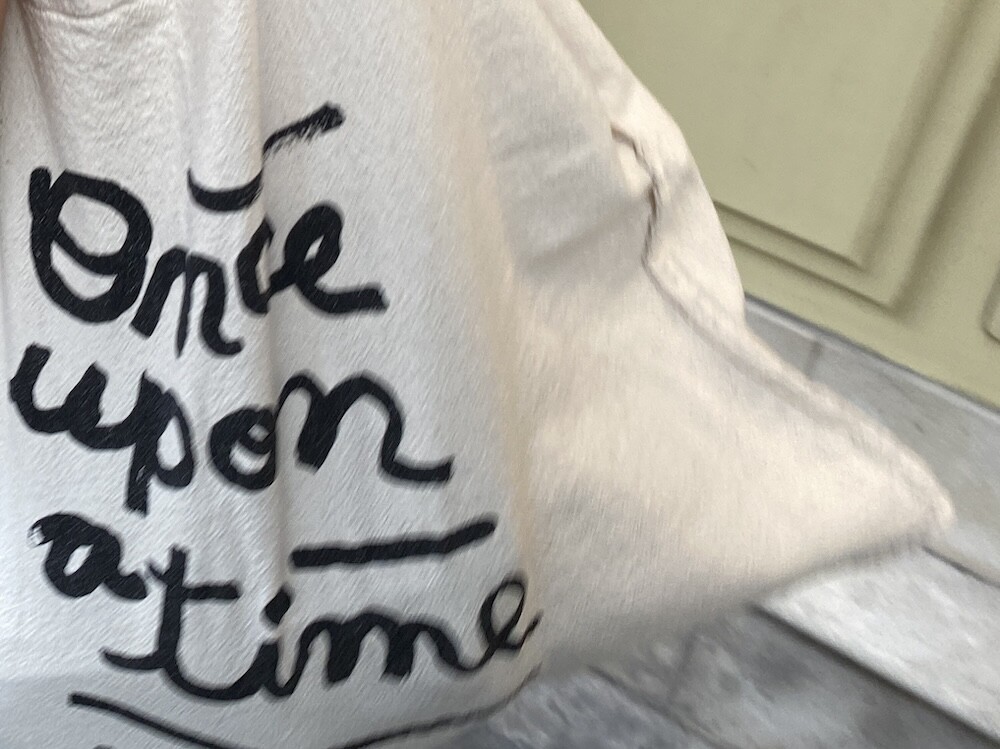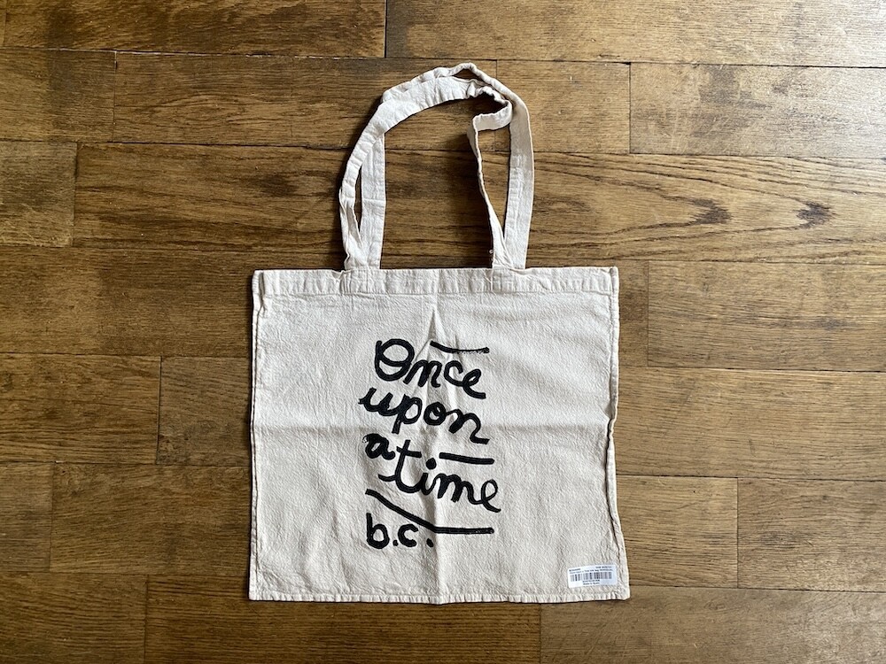 지글지글하게 가공된 면 소재 위에 원스 어폰 어 타임 ONCE UPON A TIME이라는, 붓으로 쓴 것 같은 귀여운 글씨가 프린트된 에코백이에요. 크림색의 원단이 너무 예쁘고, 세로보다 가로가 긴 형태의 에코백이라 독특해서 더 좋은 것 같아요.