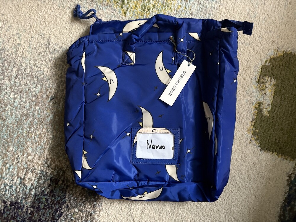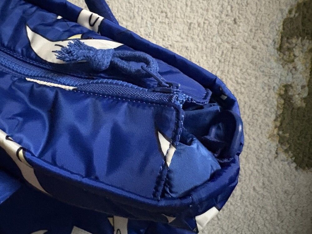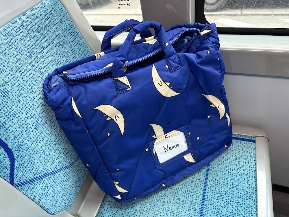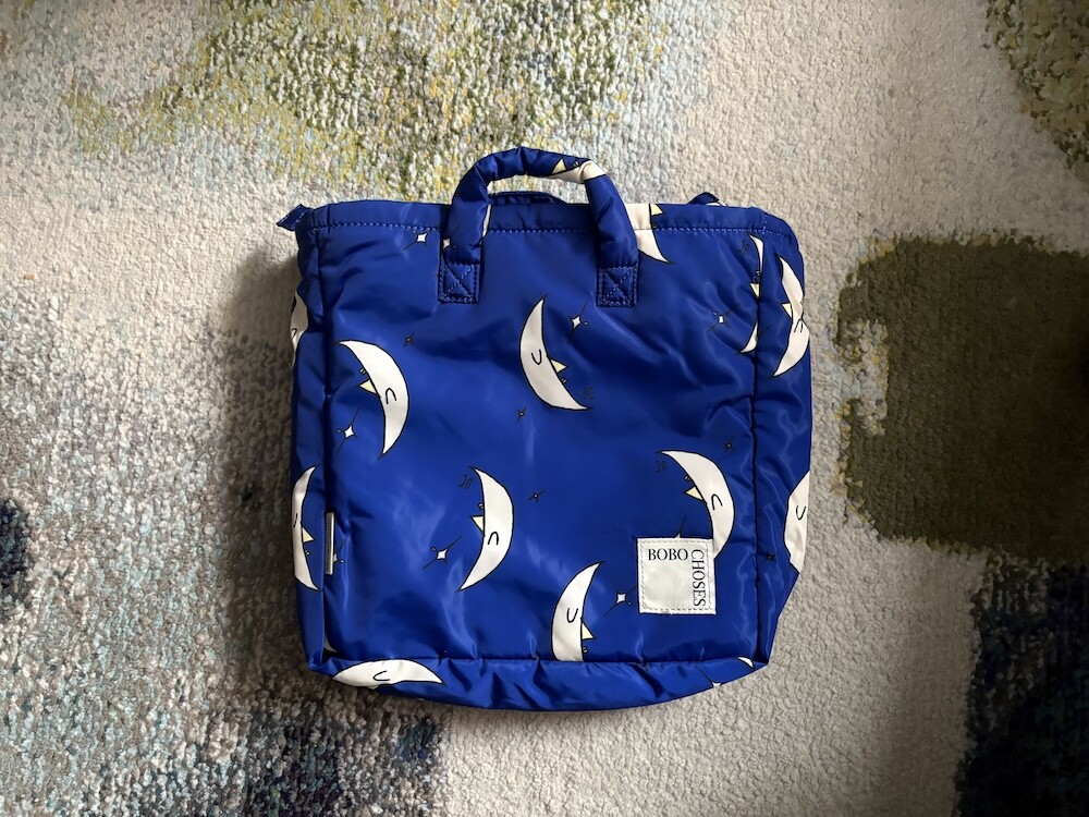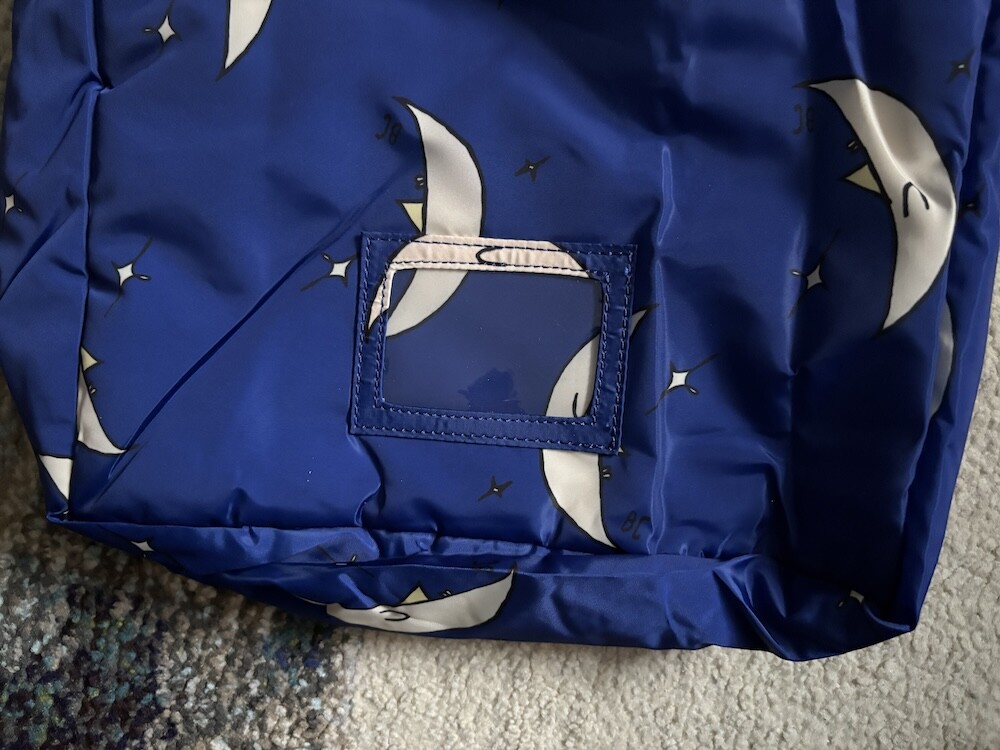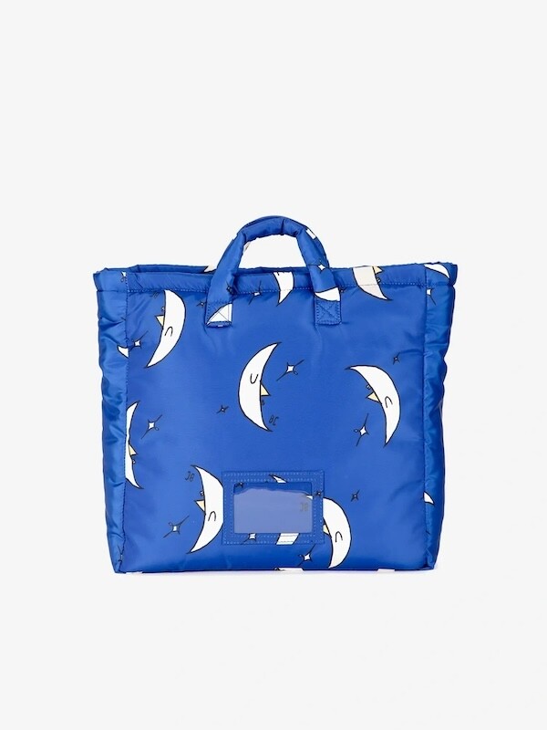 눈을 감고 있는 달 패턴의 패딩 소재로 만들어진 정사각형 모양의 가방입니다. 몸통에서 손잡이까지 전체적으로 통통한 느낌이 나서 귀엽고, 무엇보다 제가 좋아하는 파란색이라 진행하지 않을 수 없었어요. 원단의 감촉이 매끈한 데다 패딩감이 통통하게 귀여운 느낌만 있지 겨울 느낌은 아니어서 사계절 내내 사용하실 수 있으실 거예요. 몸통 뒷면의 아래쪽에는 이름을 쓸 수 있는 부분도 있어서 아이 이름을 써서 넣어 주시면 좋을 것 같아요. 저는 저희 아기 이름을 써서 들고 다닙니다 :)