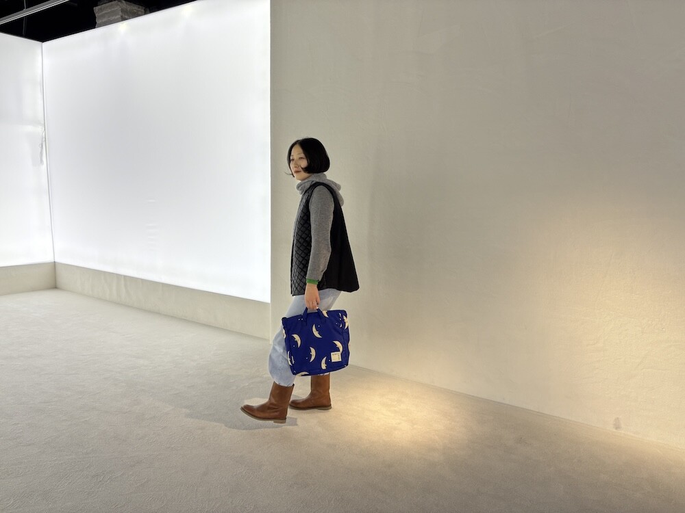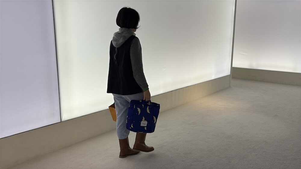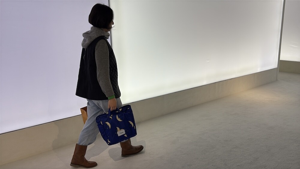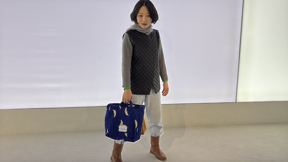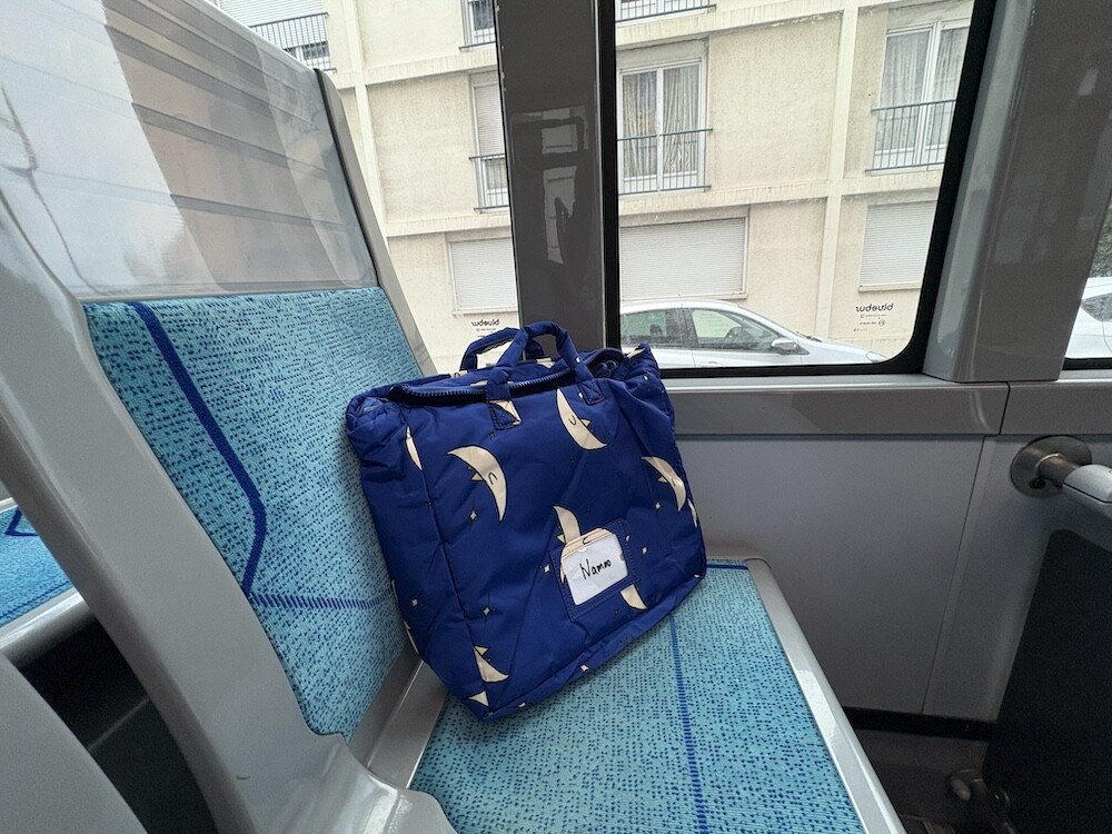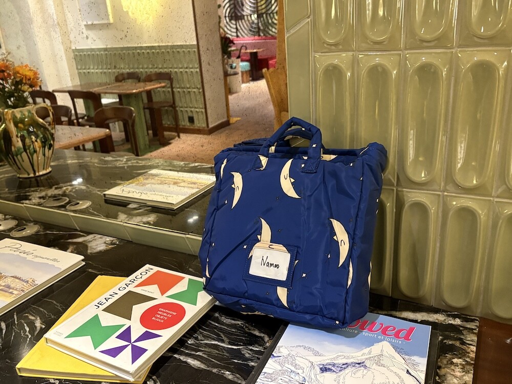 눈을 감고 있는 달 패턴의 패딩 소재로 만들어진 정사각형 모양의 가방입니다. 몸통에서 손잡이까지 전체적으로 통통한 느낌이 나서 귀엽고, 무엇보다 제가 좋아하는 파란색이라 진행하지 않을 수 없었어요. 원단의 감촉이 매끈한 데다 패딩감이 통통하게 귀여운 느낌만 있지 겨울 느낌은 아니어서 사계절 내내 사용하실 수 있으실 거예요. 몸통 뒷면의 아래쪽에는 이름을 쓸 수 있는 부분도 있어서 아이 이름을 써서 넣어 주시면 좋을 것 같아요. 저는 저희 아기 이름을 써서 들고 다닙니다 :)