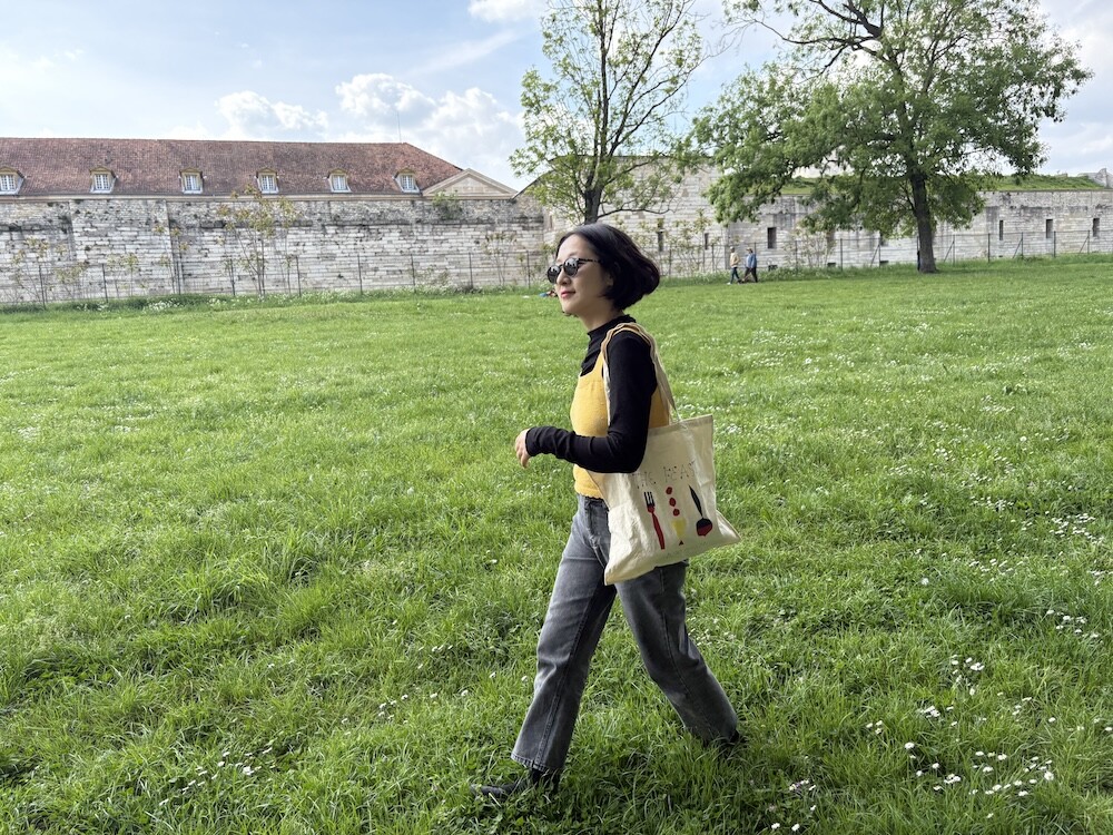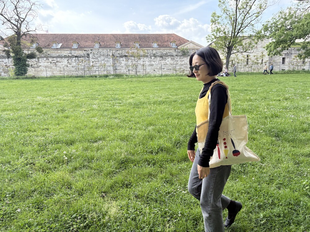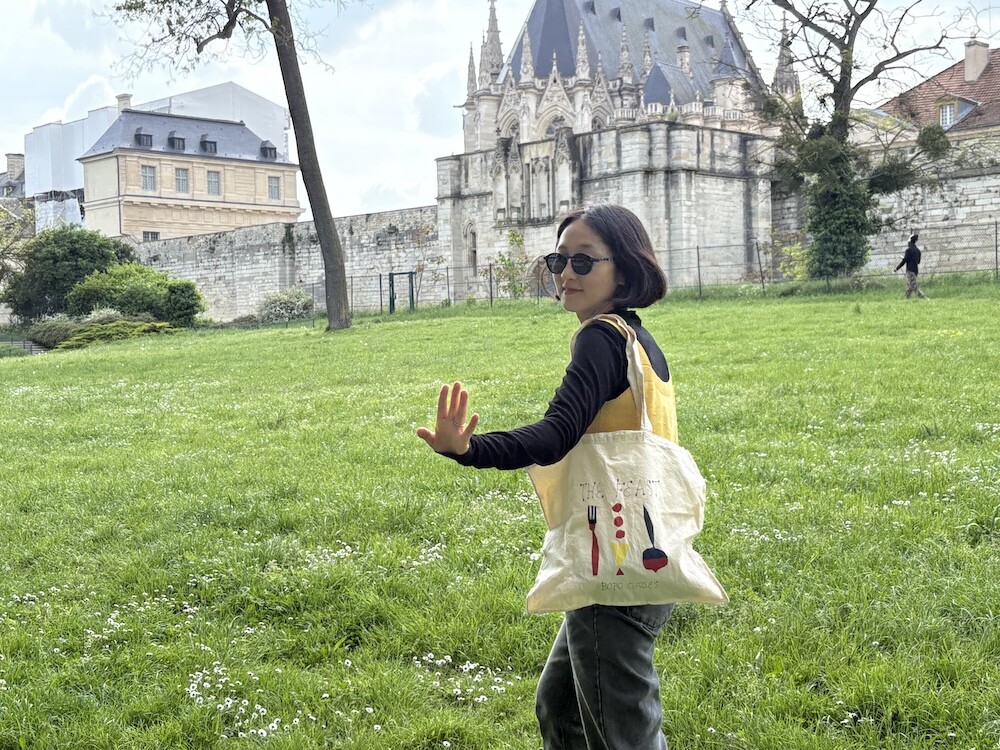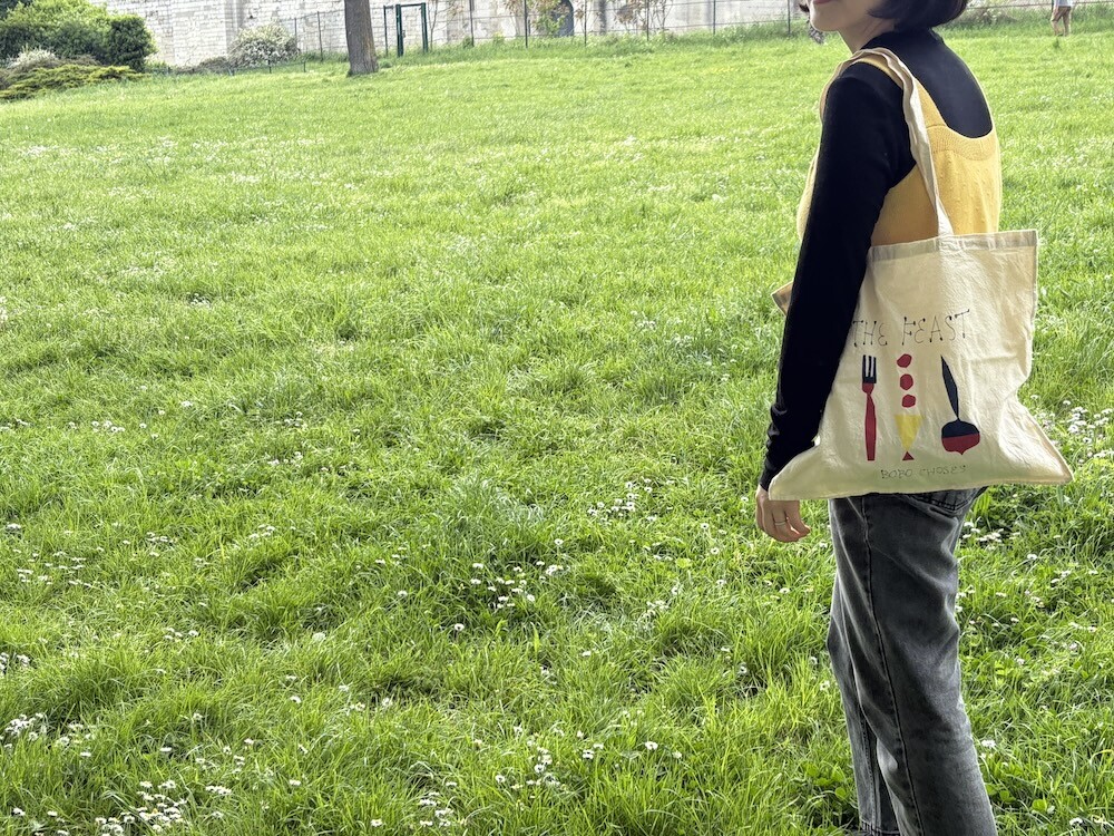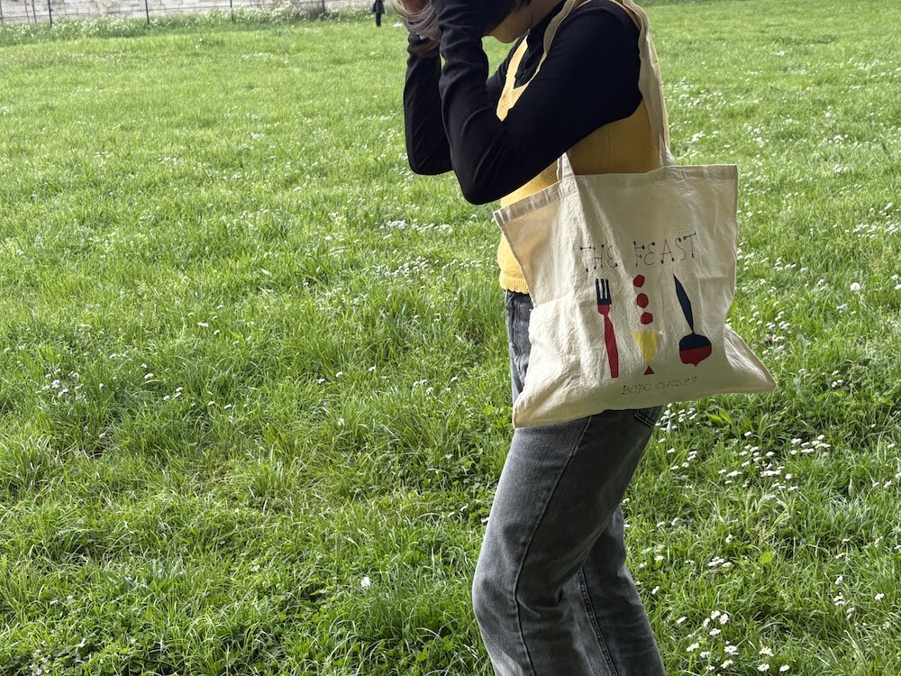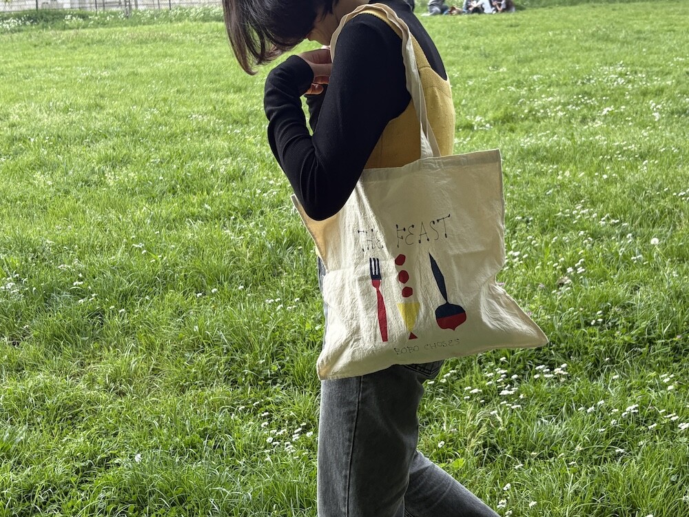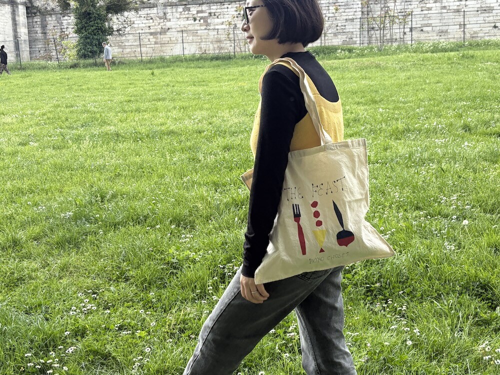 만찬, 잔치라는 뜻의 THE FEAST 컬렉션 에코백이에요. 지글지글하게 가공된 면 소재 위에 포크, 스푼 같은 것들이 도형처럼 그려져 있어서 귀엽고, 손으로 쓴 것 같은 느낌의 글씨체도 귀여워요. 세로보다 가로가 긴 형태의 에코백이라 독특해서 더 좋은 것 같아요.