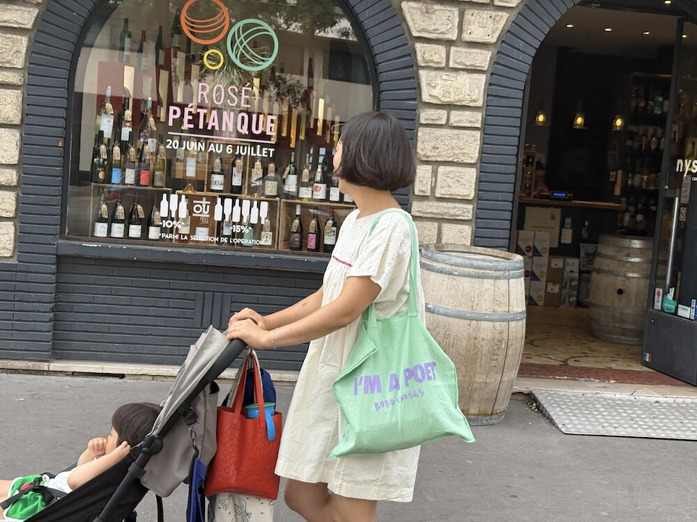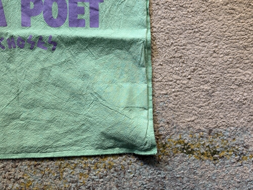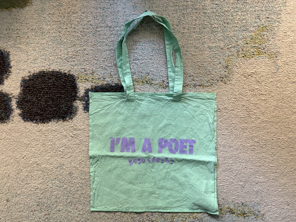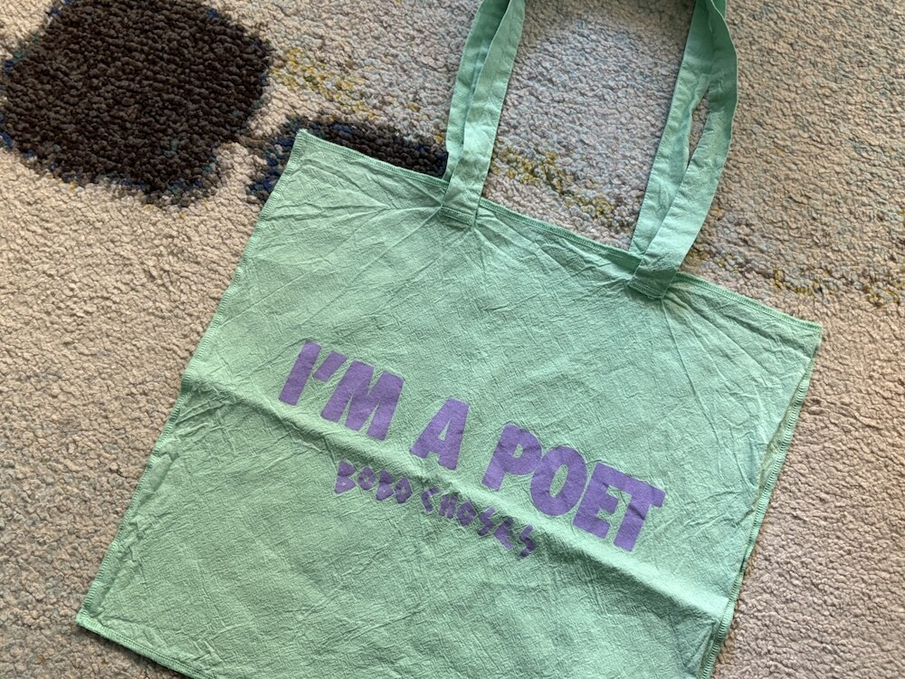 지글지글하게 가공된, 빈티지한 느낌의 민트색 면 소재 위에 아임 어 포엣 I'M A POET이라는 글씨가 연보라색으로 프린트된 에코백이에요. 세로보다 가로가 긴 형태의 에코백이라 독특해서 더 좋은 것 같아요.