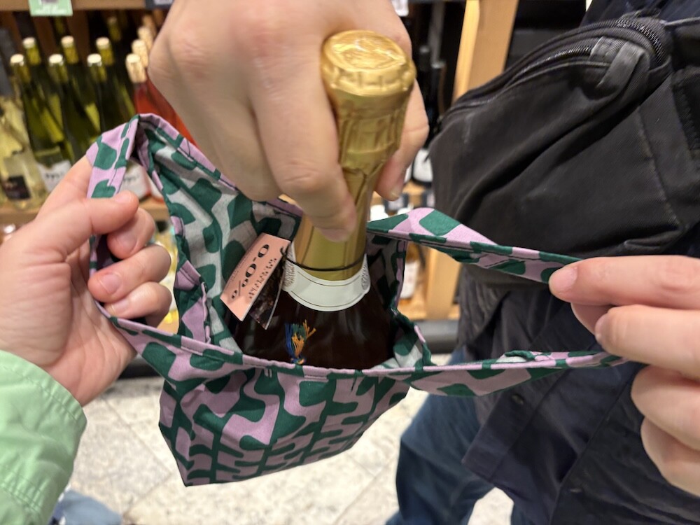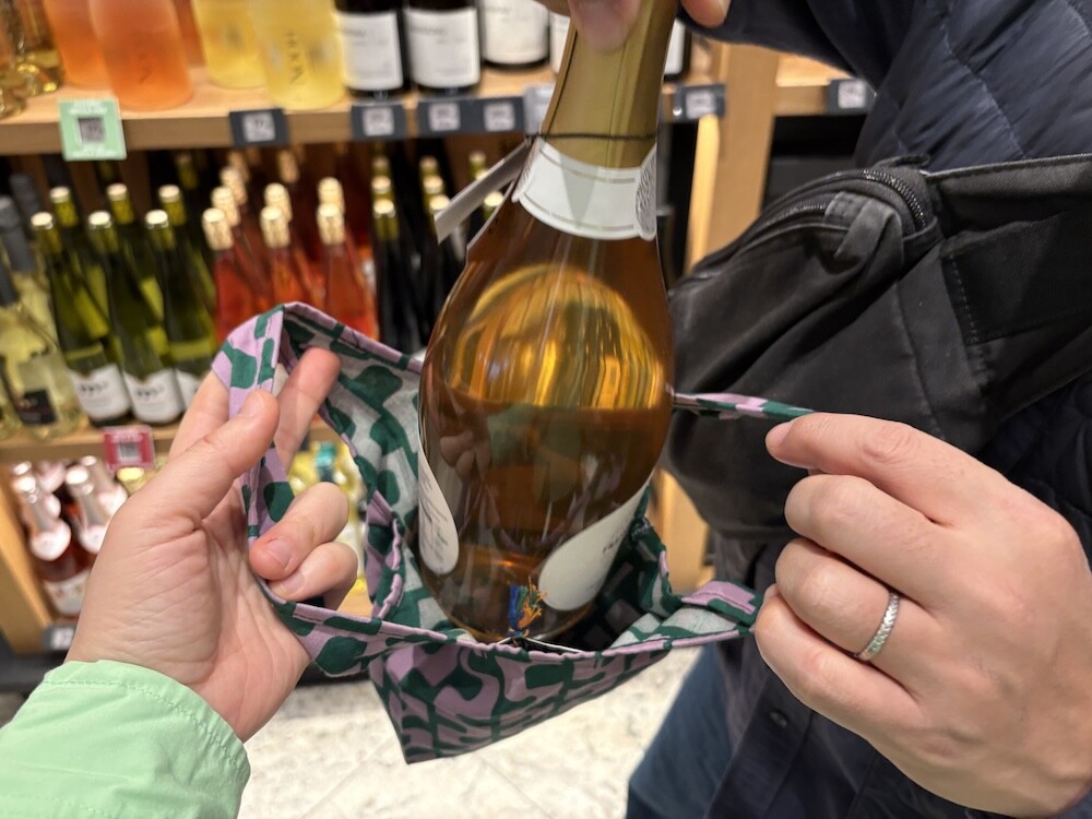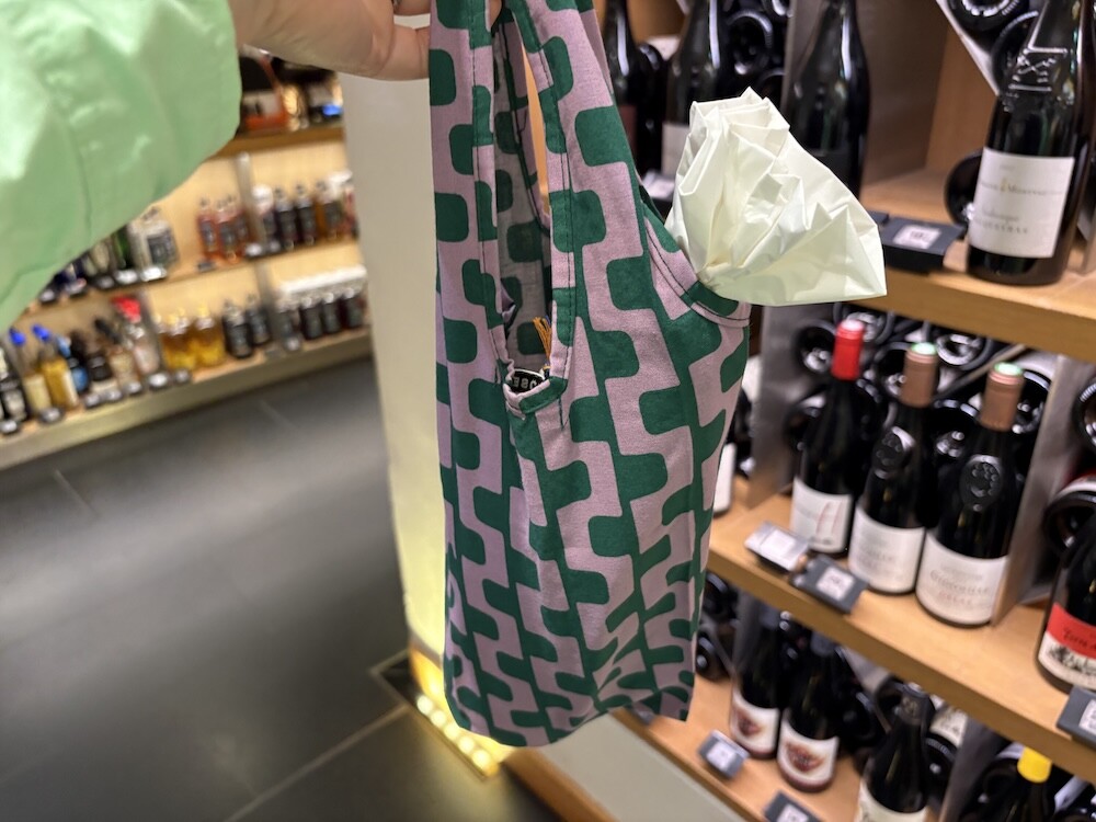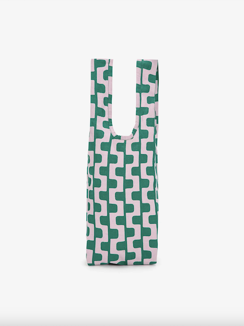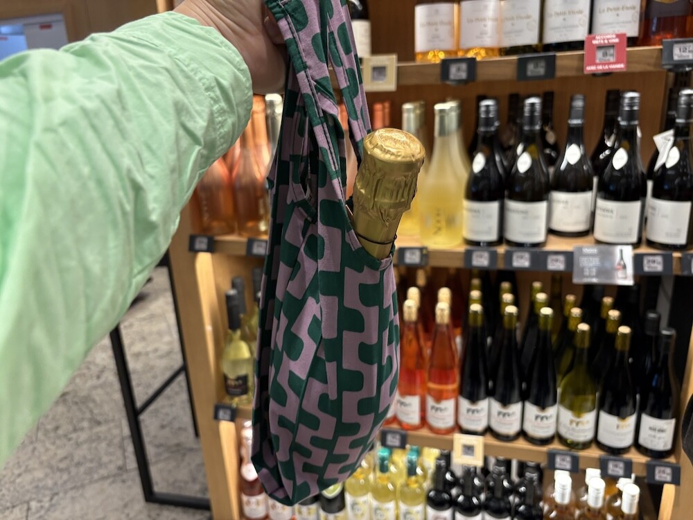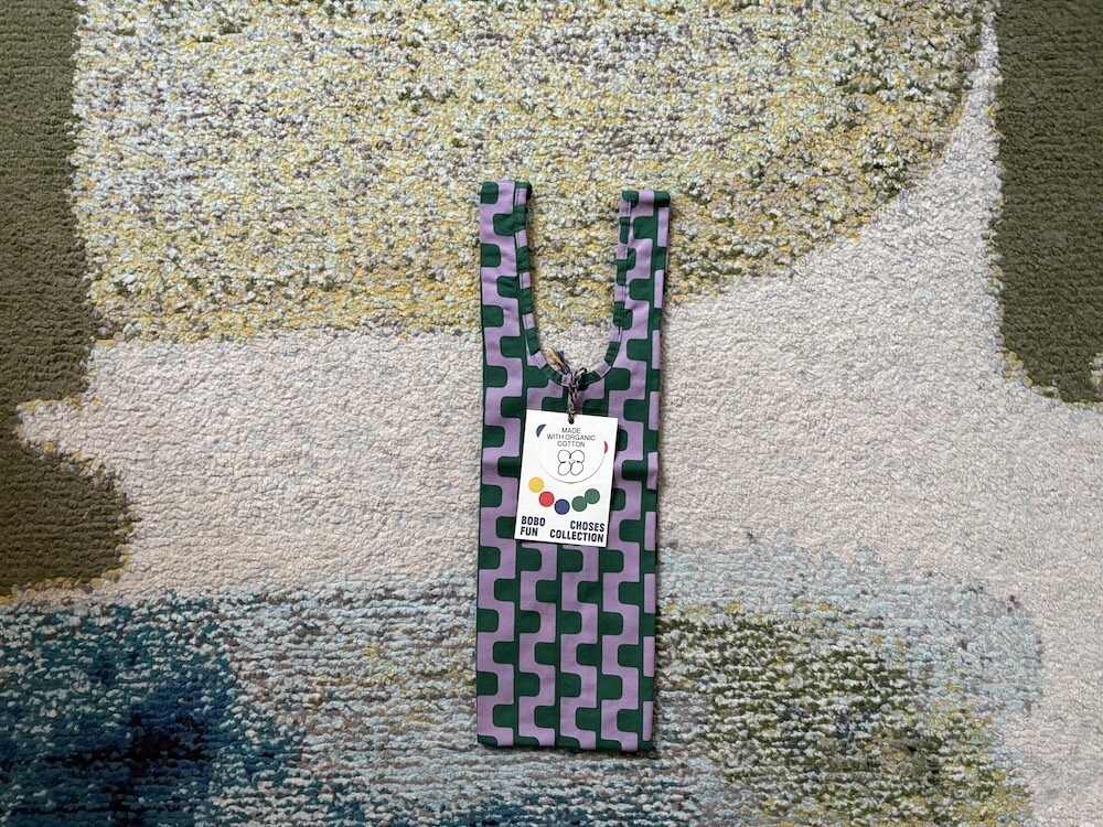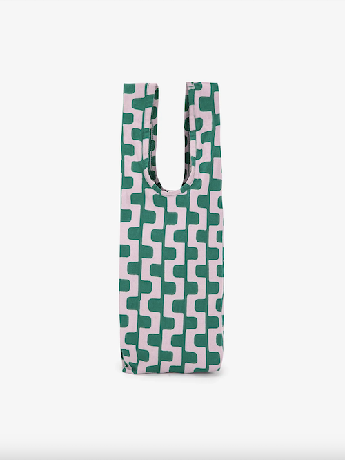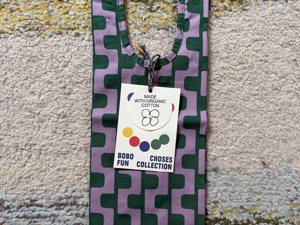 오가닉 면으로 만들어진 음료용 가방이에요. 분홍색과 초록색의 체인 패턴이 예쁘고, 딱 와인 한 병 넣으면 좋은 사이즈라 파티 같은 것 할 때 음료나 술 한 병을 넣어 들고 가시기 좋을 거예요. 와인 뿐 아니라 바게트나 길쭉한 빵을 넣어도 귀엽답니다.
