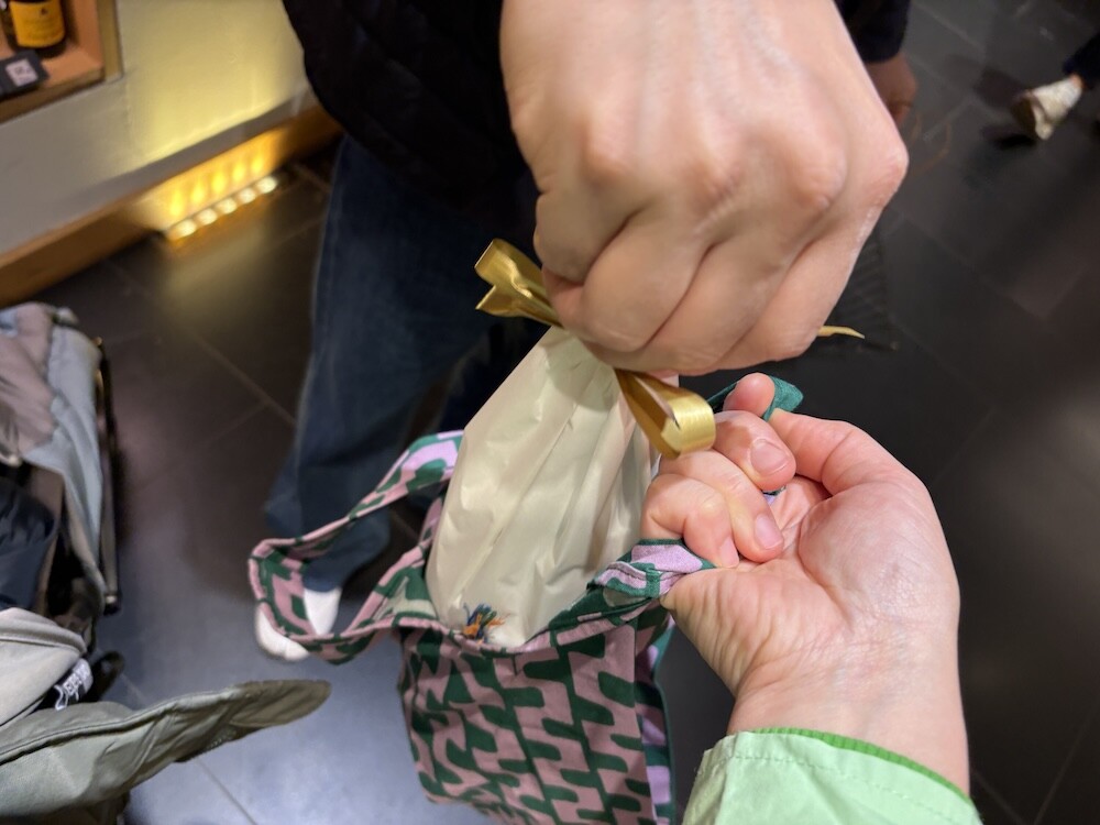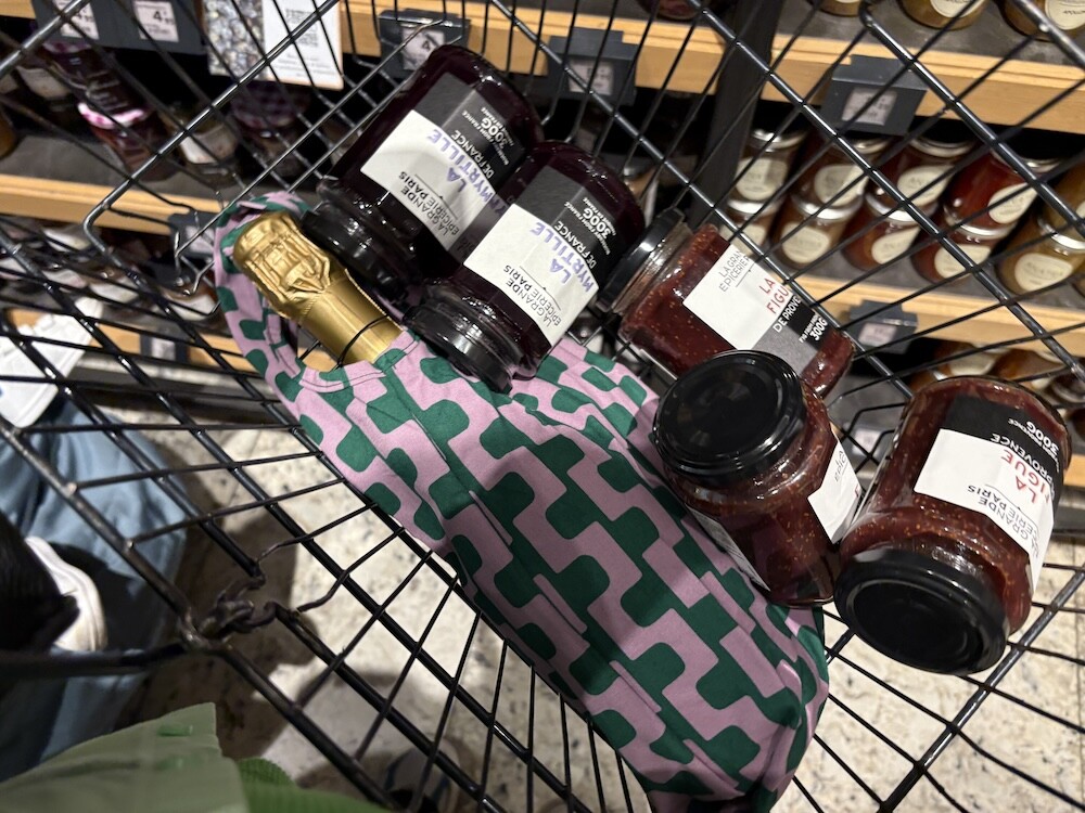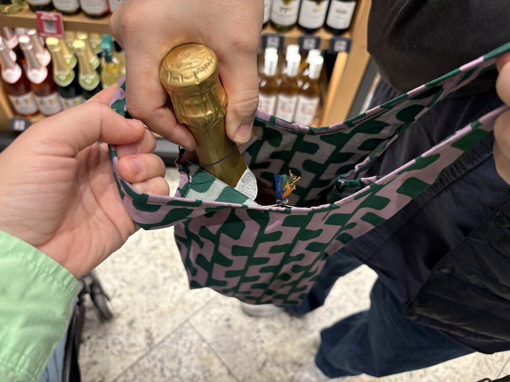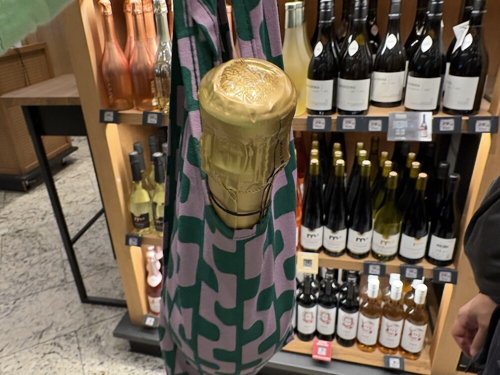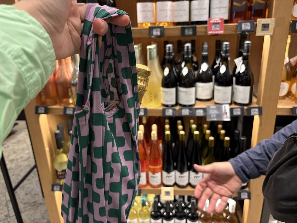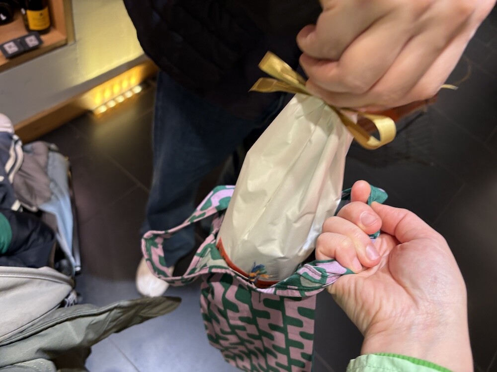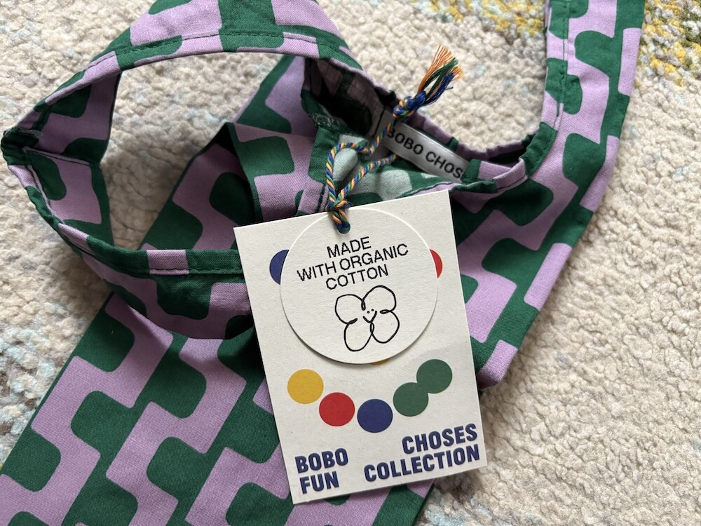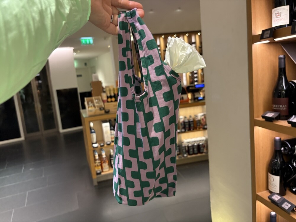 오가닉 면으로 만들어진 음료용 가방이에요. 분홍색과 초록색의 체인 패턴이 예쁘고, 딱 와인 한 병 넣으면 좋은 사이즈라 파티 같은 것 할 때 음료나 술 한 병을 넣어 들고 가시기 좋을 거예요. 와인 뿐 아니라 바게트나 길쭉한 빵을 넣어도 귀엽답니다.