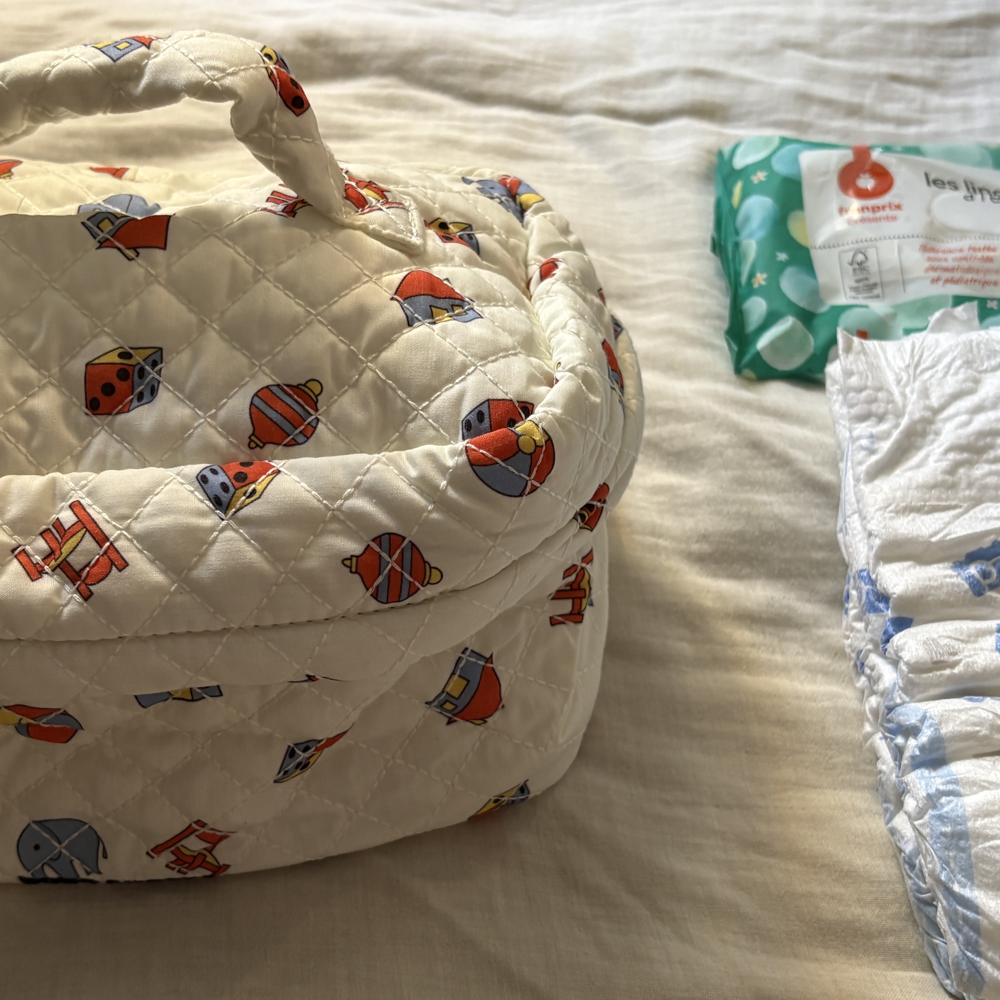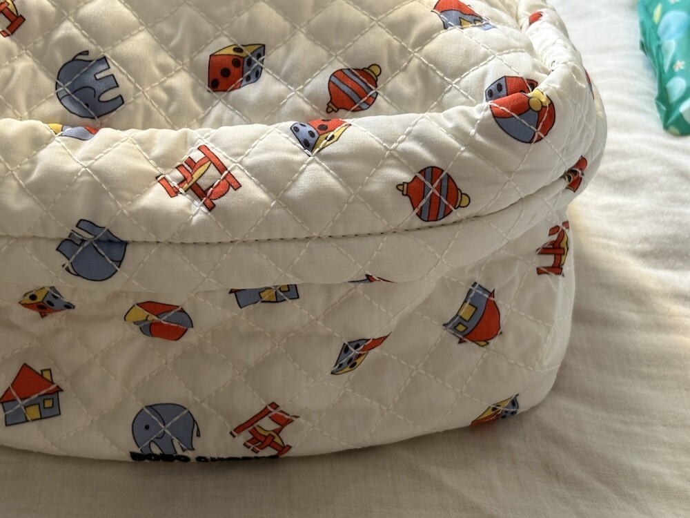 오가닉 면으로 만들어진 여행용 파우치예요. 아이들이 좋아하는 장난감들이 그려진 원단이 예쁘고 거기에 퀼팅이 더해져 있어서 포근포근 귀여워요. 내부 사이즈가 넉넉해서 기저귀를 포함해 필요한 아기 용품들을 다 넣어 다니기에 좋더라고요. 아이들이 좋아하는 장난감을 넣어 들고 다녀도 좋을 것 같고, 아기용으로 뿐만 아니라 엄마들이 화장품이나 약품 등 필요한 물건들을 넣어 여행용으로 사용하시기에도 좋을 거예요.