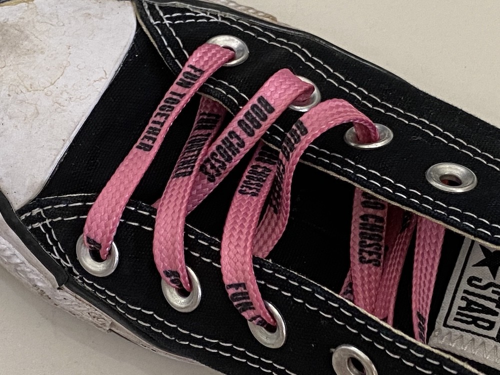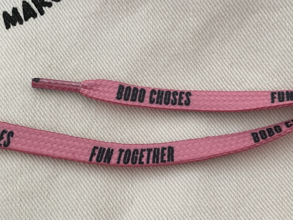 분홍색의 신발끈에 보보쇼즈(BOBO CHOSES)와 펀 투게더(FUN TOGETHER)라는 글씨가 번갈아 프린트되어 있는 끈으로, 심심한 신발에 귀여운 포인트가 되어줄 거예요. 신발끈으로 뿐만 아니라 질끈 묶어 열쇠 고리나 무언가를 묶어 두는 용도로 사용하셔도 좋을 것 같아요.