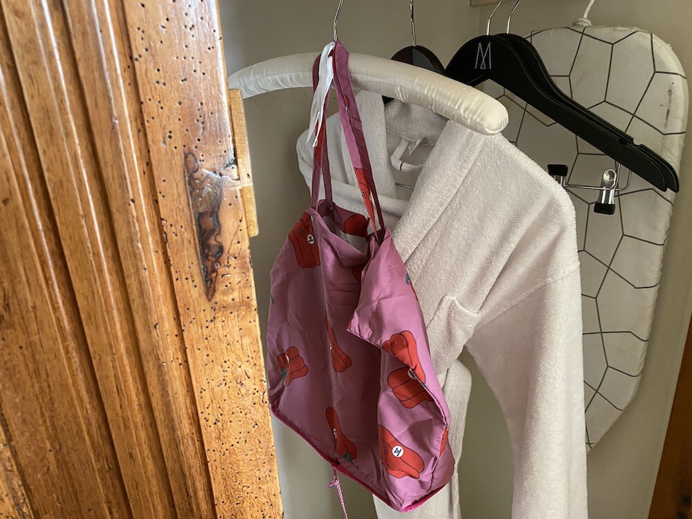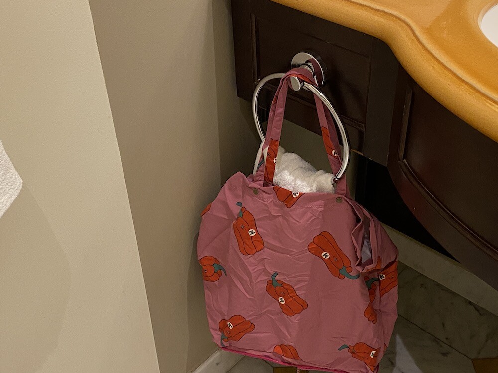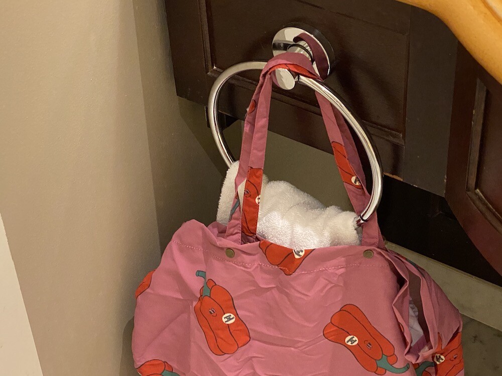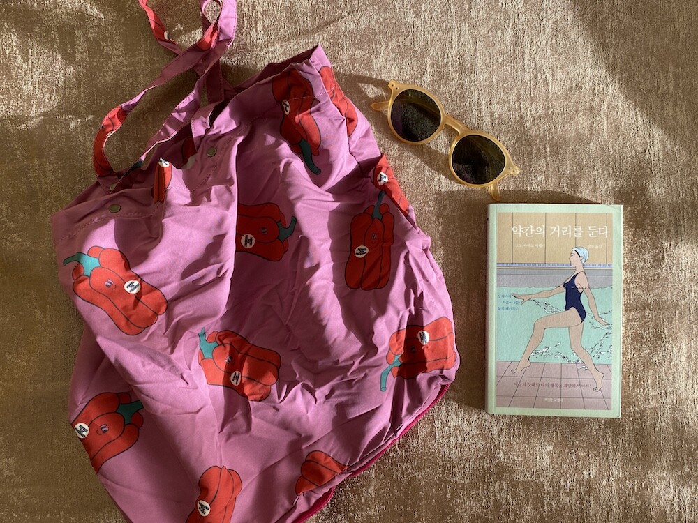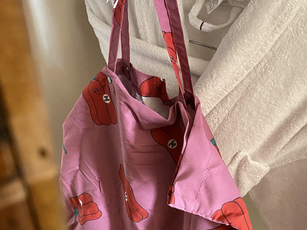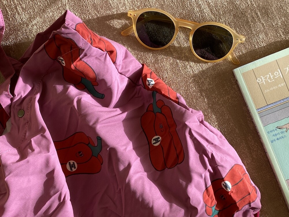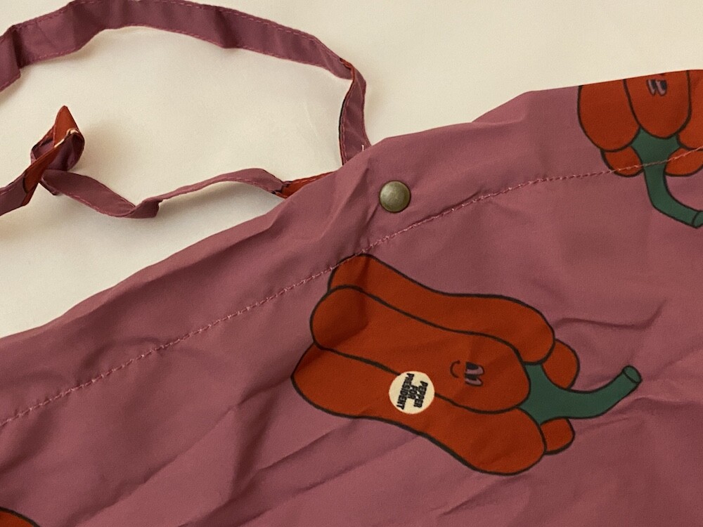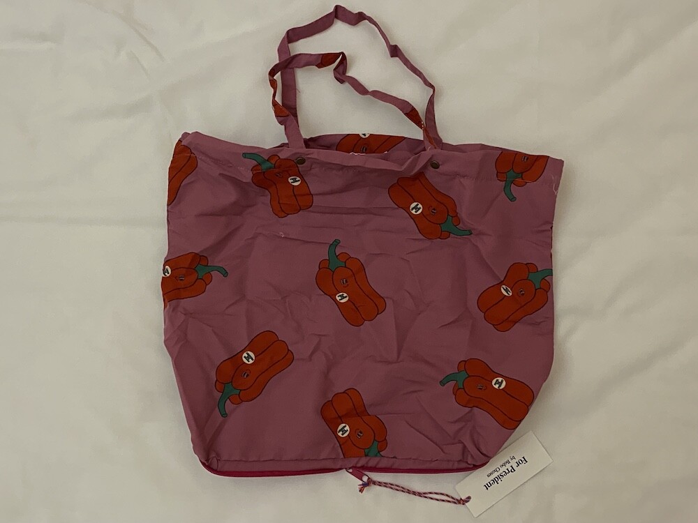 100% 재생 폴리에스테르 소재에 귀여운 피망이 그려진 쇼핑백이에요. 착착 접어 손바닥만한 크기로 들고 다니다가 필요할 때 꺼내서 사용할 수 있습니다. 접었을 때 겉면은 가죽처럼 보이는데 따로 소재에 대한 표기가 없기 때문에 기재하지 않겠습니다.