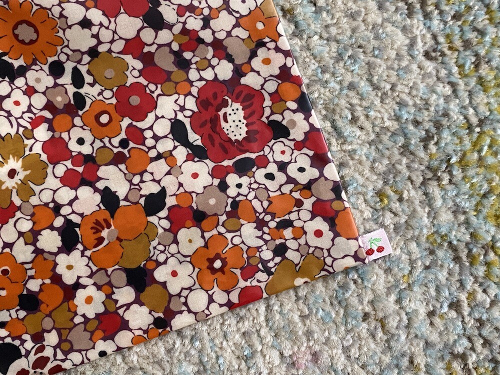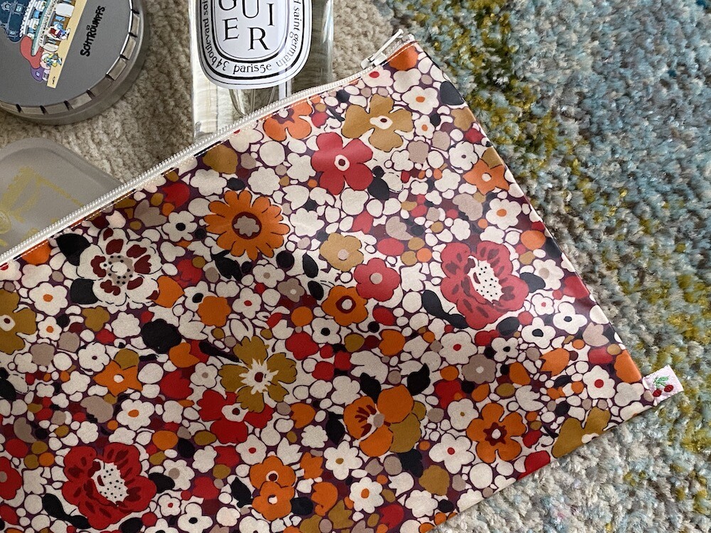 천으로 된 꽃무늬 원단 겉면에 합성수지 코팅을 하여 생활 방수가 가능한 파우치예요(물에 완전히 담그는 건 박음질 선을 통한 물샘이 있습니다). 꽃무늬가 오밀조밀 예쁘고, 작아 보이지만 생각보다 많이 넣을 수 있어 실용적으로 사용하실 수 있으실 거예요.