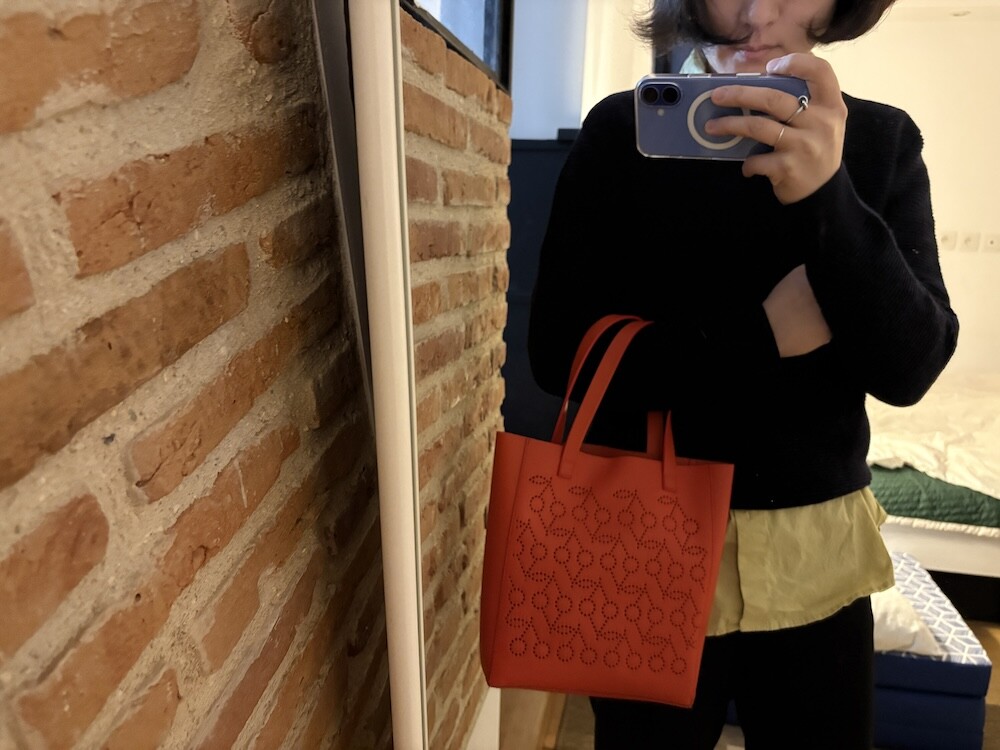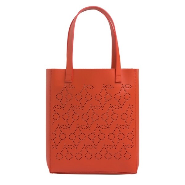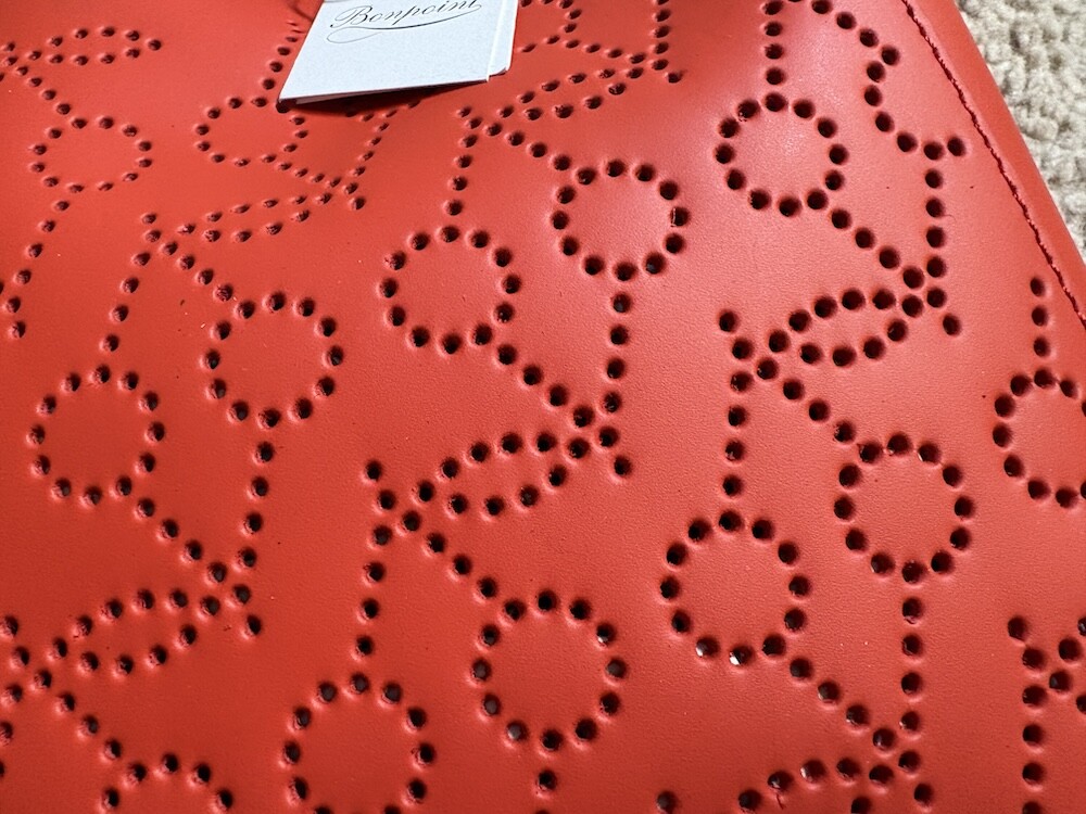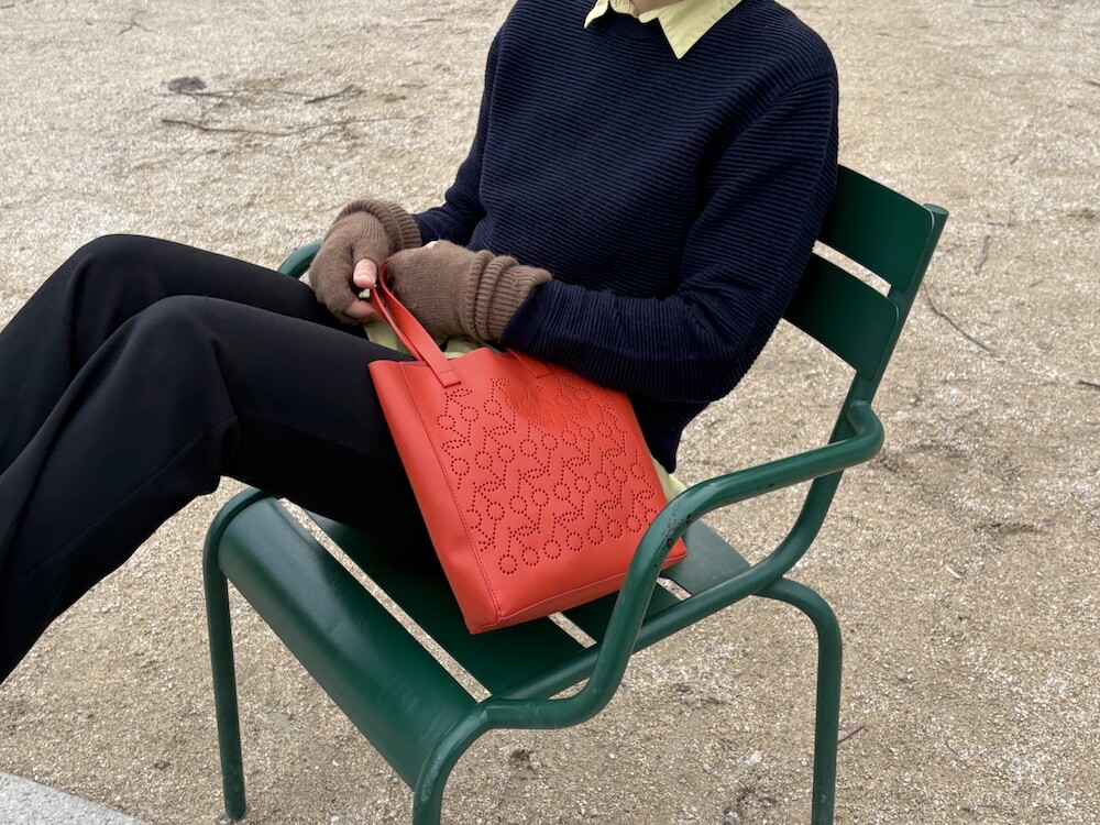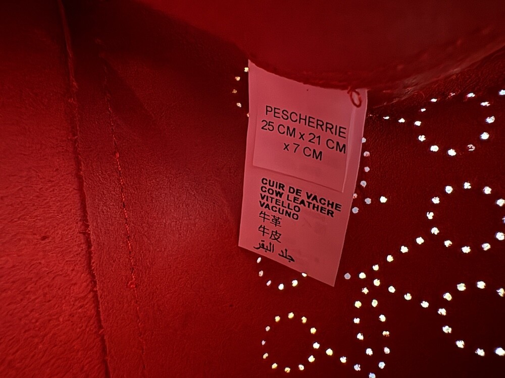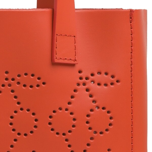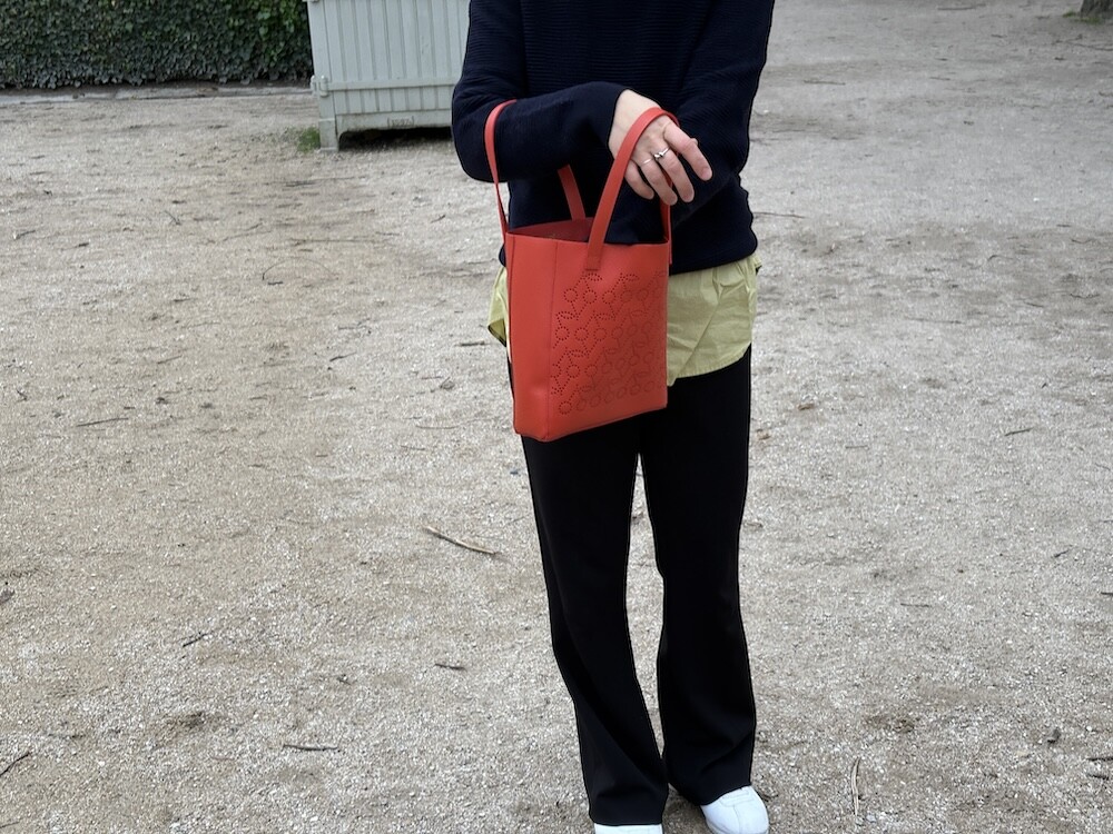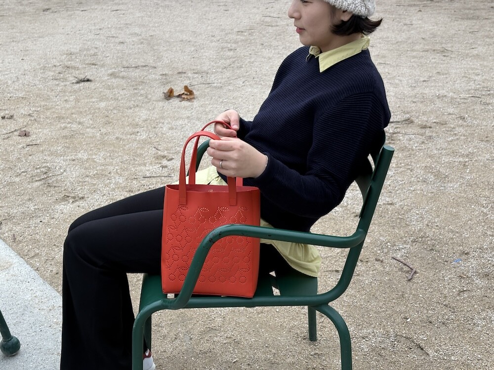 탄탄한 송아지 가죽 소재에 체리 모양으로 펀칭이 되어 있는 미니백이에요. 딱 팔에 걸고 다니기 좋은 사이즈로, 어린이용으로 나온 제품이지만 한국 성인분들께 잘 어울리는 크기예요. 메인 가방으로 사용하셔도 좋고 세컨백으로 사용하셔도 좋은 크기라 데일리백으로 쓰시기 좋을 거예요. 밑면과 옆면이 있는 박스 모양의 가방이라 바닥에 세워 놓아도 혼자 잘 서기 때문에 들고 다니다가 실내에서 놓아둘 때에도 편하고 물건을 찾을 때도 편하더라고요. 색상의 공식 이름은 벽돌색 Rouge brique인데, 주황빛이 살짝 도는 빨강색이라 생각하시면 될 것 같아요.
