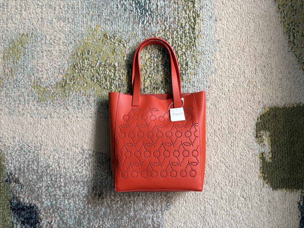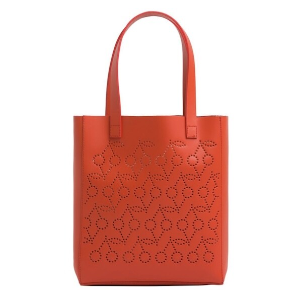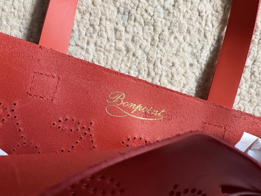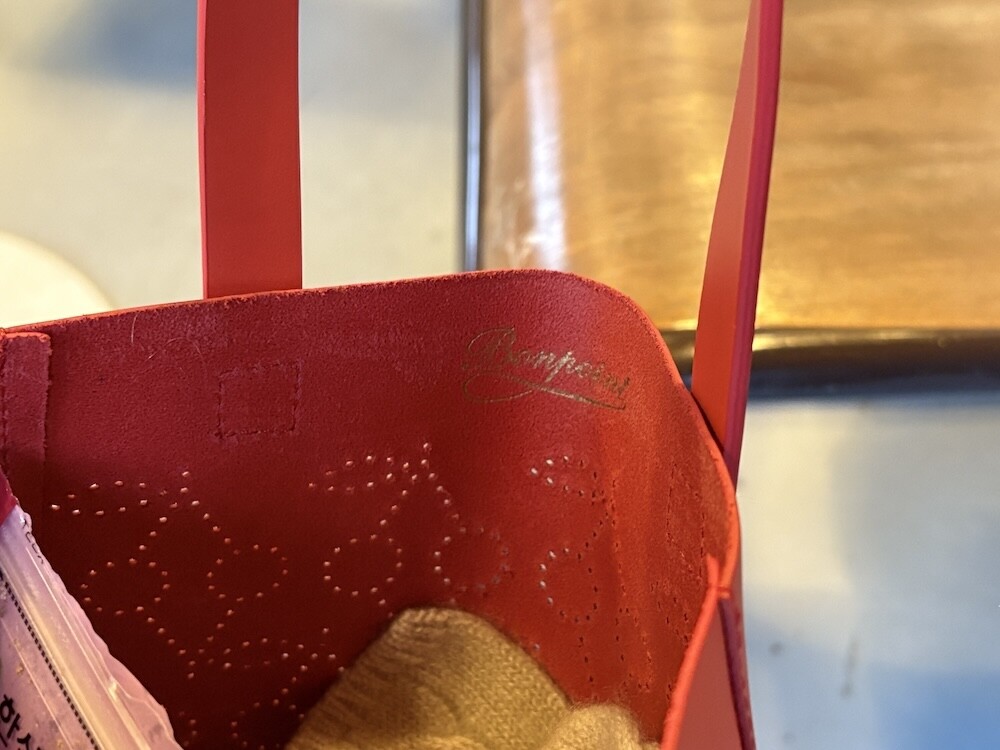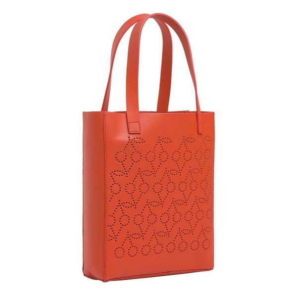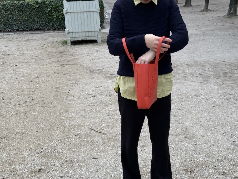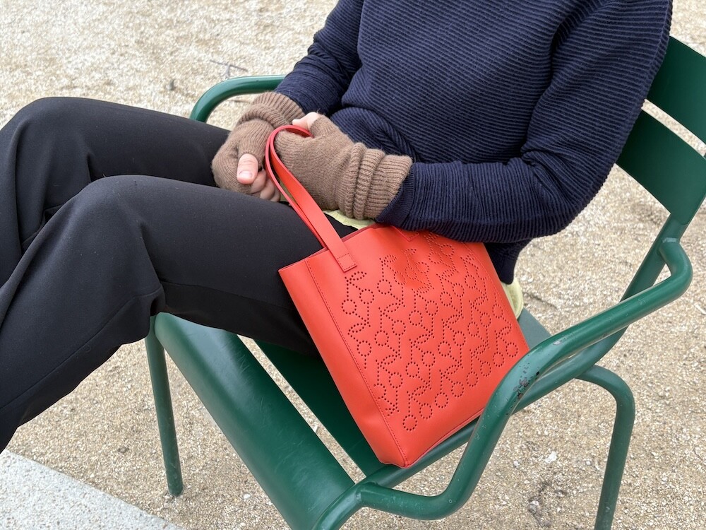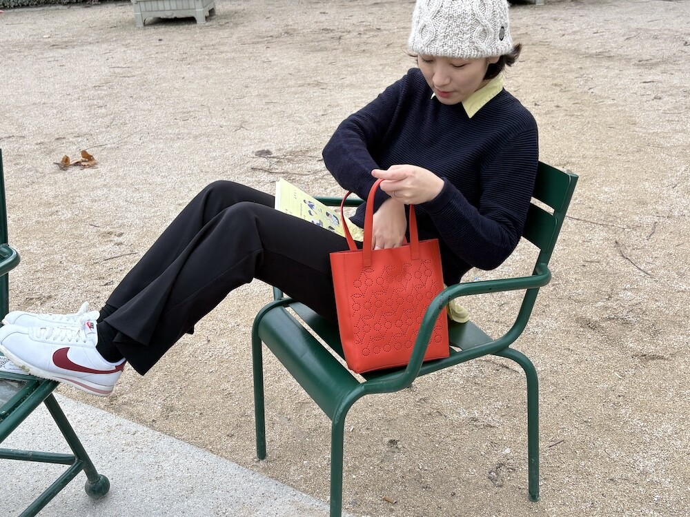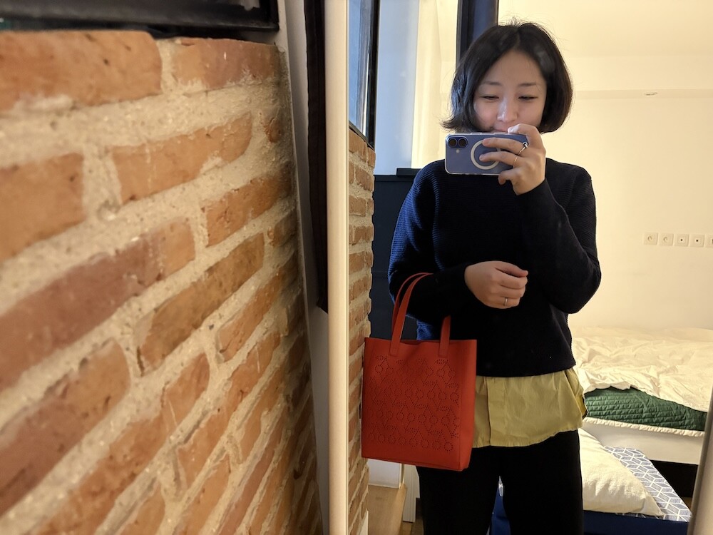탄탄한 송아지 가죽 소재에 체리 모양으로 펀칭이 되어 있는 미니백이에요. 딱 팔에 걸고 다니기 좋은 사이즈로, 어린이용으로 나온 제품이지만 한국 성인분들께 잘 어울리는 크기예요. 메인 가방으로 사용하셔도 좋고 세컨백으로 사용하셔도 좋은 크기라 데일리백으로 쓰시기 좋을 거예요. 밑면과 옆면이 있는 박스 모양의 가방이라 바닥에 세워 놓아도 혼자 잘 서기 때문에 들고 다니다가 실내에서 놓아둘 때에도 편하고 물건을 찾을 때도 편하더라고요. 색상의 공식 이름은 벽돌색 Rouge brique인데, 주황빛이 살짝 도는 빨강색이라 생각하시면 될 것 같아요.