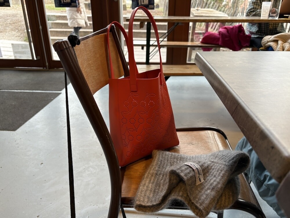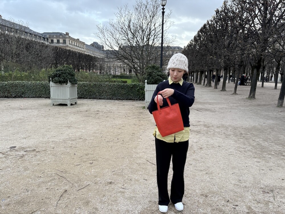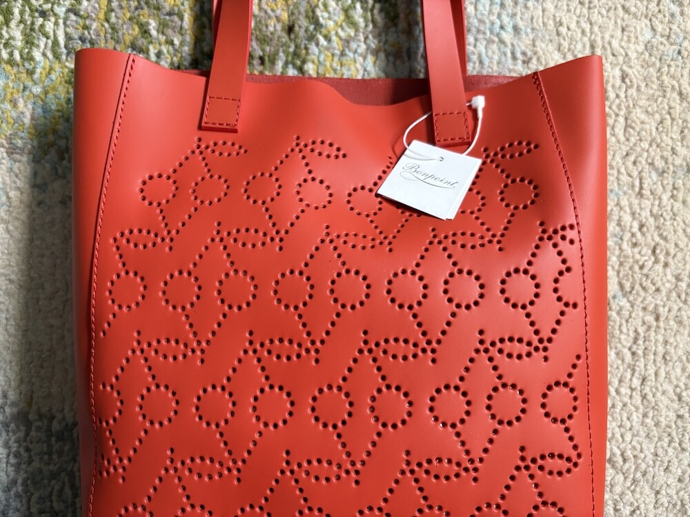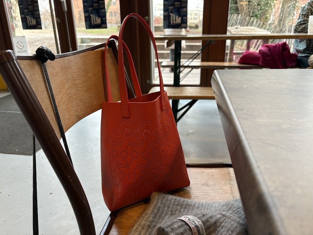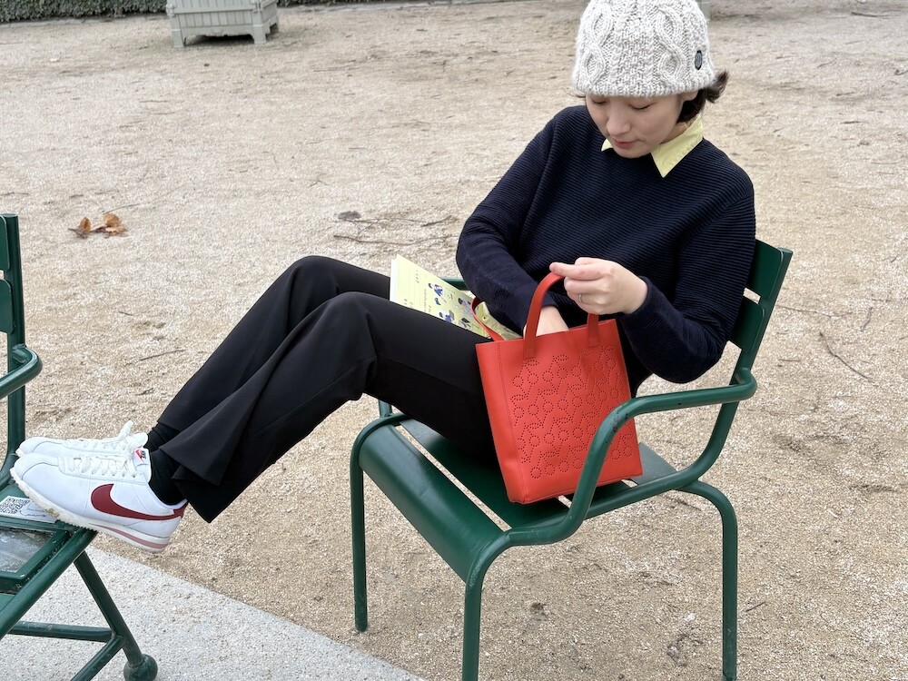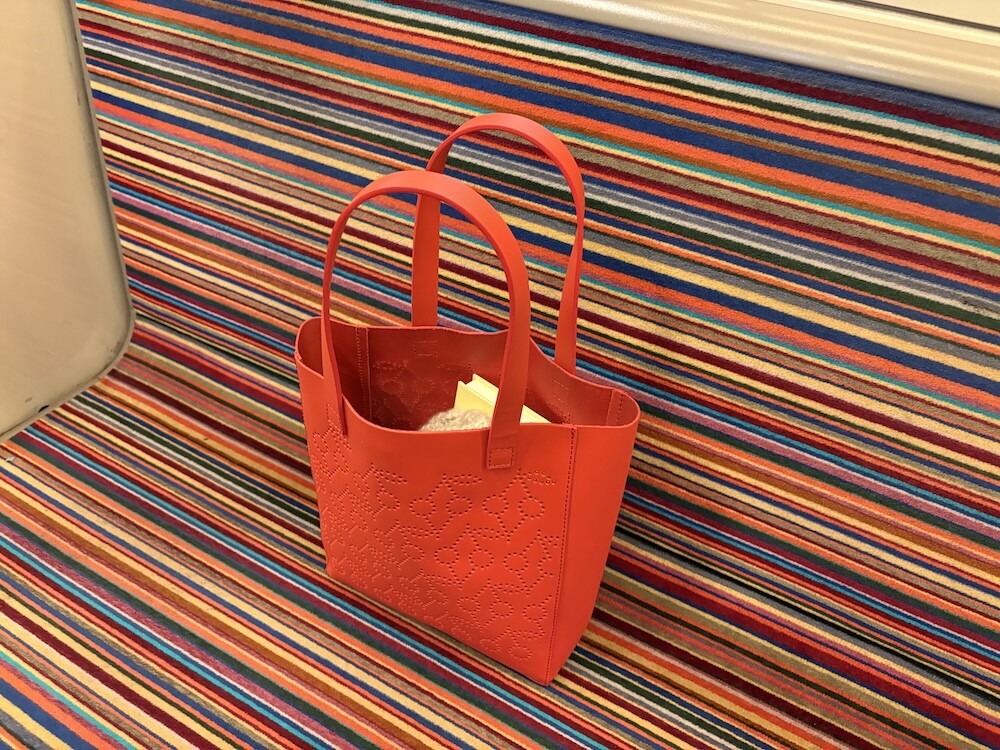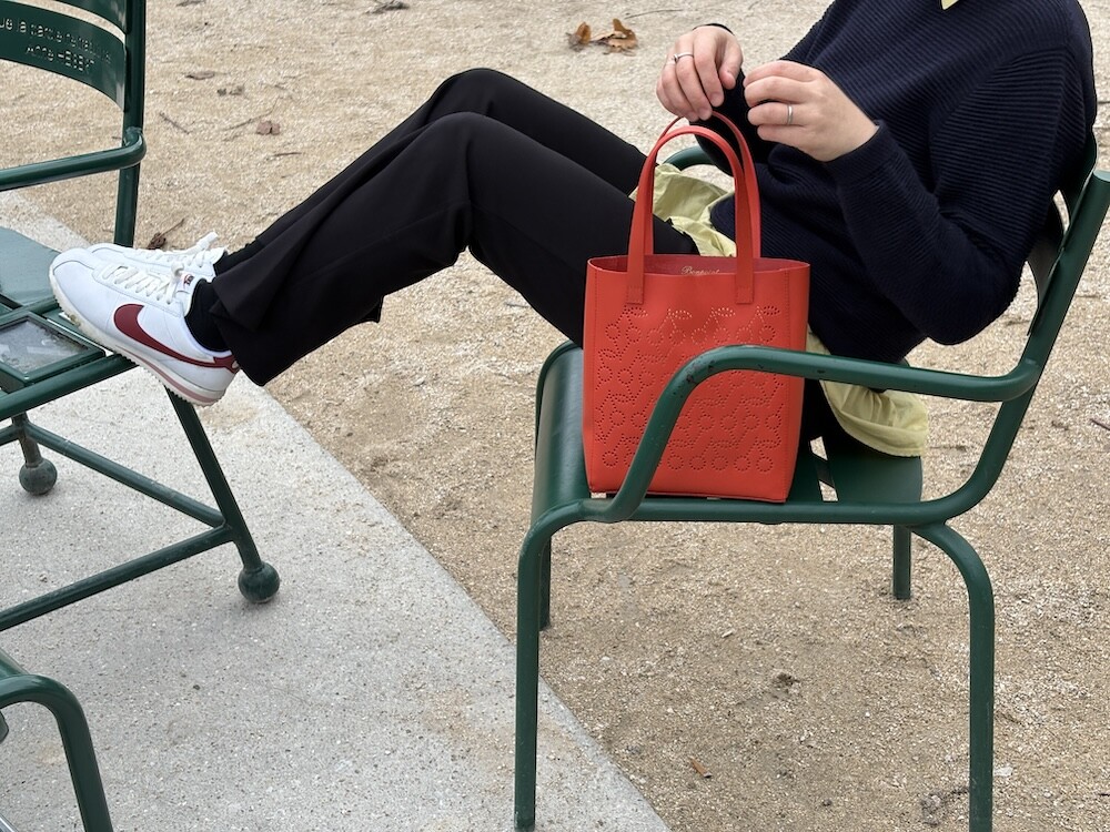 탄탄한 송아지 가죽 소재에 체리 모양으로 펀칭이 되어 있는 미니백이에요. 딱 팔에 걸고 다니기 좋은 사이즈로, 어린이용으로 나온 제품이지만 한국 성인분들께 잘 어울리는 크기예요. 메인 가방으로 사용하셔도 좋고 세컨백으로 사용하셔도 좋은 크기라 데일리백으로 쓰시기 좋을 거예요. 밑면과 옆면이 있는 박스 모양의 가방이라 바닥에 세워 놓아도 혼자 잘 서기 때문에 들고 다니다가 실내에서 놓아둘 때에도 편하고 물건을 찾을 때도 편하더라고요. 색상의 공식 이름은 벽돌색 Rouge brique인데, 주황빛이 살짝 도는 빨강색이라 생각하시면 될 것 같아요.